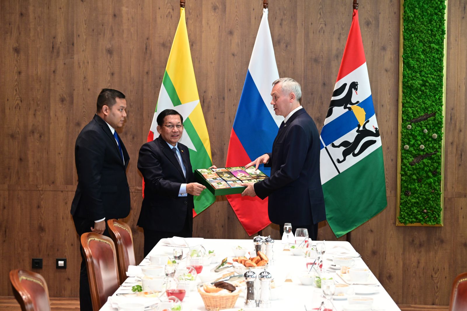 ထို့နောက် နိုင်ငံတော် ယာယီသမ္မတ နိုင်ငံတော်လုံခြုံရေးနှင့် အေးချမ်းသာယာ ရေးကော်မရှင်ဥက္ကဋ္ဌနှင့် အဖွဲ့ဝင်များလိုက်ပါလာသည့် အထူးလေယာဉ်သည် ရုရှား ဖက်ဒရေးရှင်းနိုင်ငံ၊ နိုဗာစီဗစ်မြို့၊ သာမာရှယ်ဗာလေဆိပ်၌ ခေတ္တရပ်နားခဲ့ရာ နိုဗာ စီဗစ်ဒေသ အုပ်ချုပ်ရေးမှူး Mr. Travnikov Ahdrey Aleksandrovich နှင့် တာဝန် ရှိသူများက လေဆိပ်၌ ကြိုဆိုနှုတ်ဆက်ခဲ့ကြသည်။