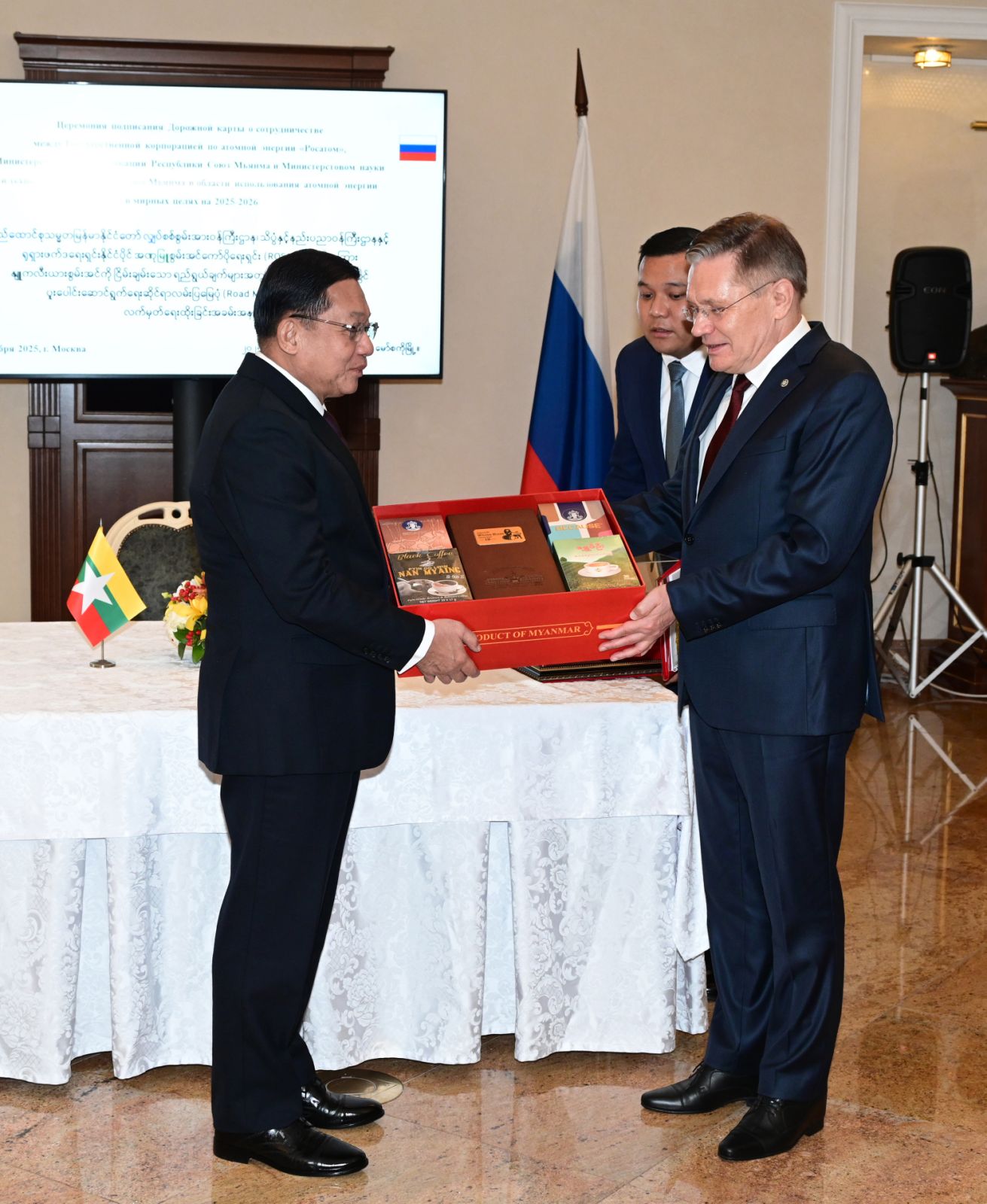 ယင်းနောက် နိုင်ငံတော်ယာယီသမ္မတ နိုင်ငံတော်လုံခြုံရေးနှင့် အေးချမ်းသာယာ ရေးကော်မရှင်ဥက္ကဋ္ဌ နှင့် ရုရှားဖက်ဒရေးရှင်းနိုင်ငံ၊ နိုင်ငံပိုင်အဏုမြူစွမ်းအင် ကော်ပို ရေးရှင်း (ROSATOM)၏ ညွှန်ကြားရေးမှူးချုပ်တို့သည် အမှတ်တရလက်ဆောင်ပစ္စည်း များ အပြန်အလှန်ပေးအပ်ခဲ့ကြကြောင်း သတင်းရရှိသည်။