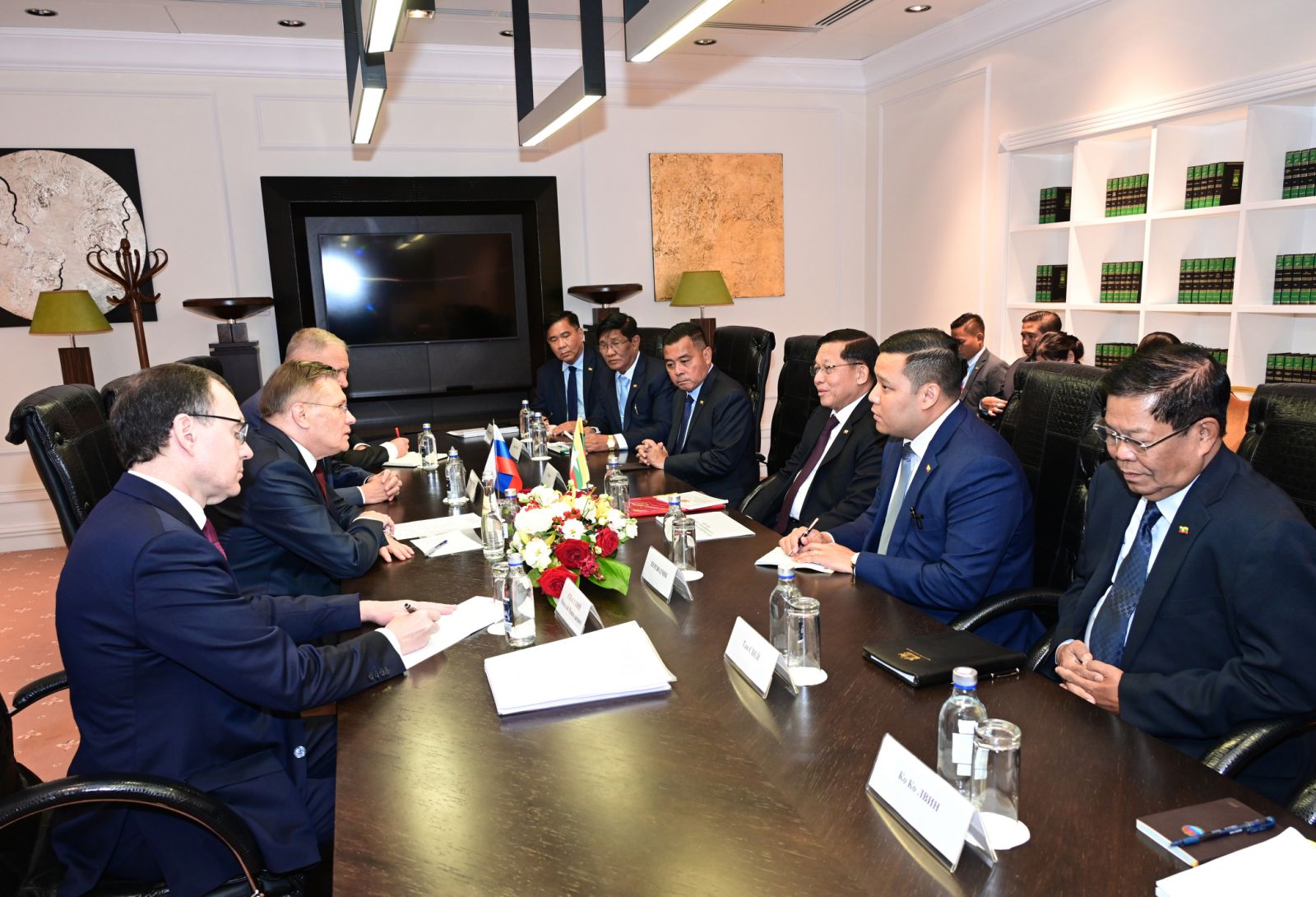 ပြည်ထောင်စုသမ္မတမြန်မာနိုင်ငံတော် ယာယီသမ္မတ နိုင်ငံတော်လုံခြုံရေးနှင့် အေးချမ်းသာယာရေးကော်မရှင်ဥက္ကဋ္ဌ ဗိုလ်ချုပ်မှူးကြီး မင်းအောင်လှိုင် ရုရှားဖက်ဒရေးရှင်းနိုင်ငံ၊ နိုင်ငံပိုင်အဏုမြူစွမ်းအင်ကော်ပိုရေးရှင်း(ROSATOM) ညွှန်ကြားရေးမှူးချုပ် Mr. Alexey Likhachev နှင့် တွေ့ဆုံဆွေးနွေး နေပြည်တော်၊ စက်တင်ဘာ - ၂၆