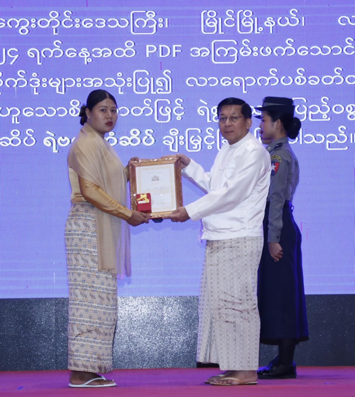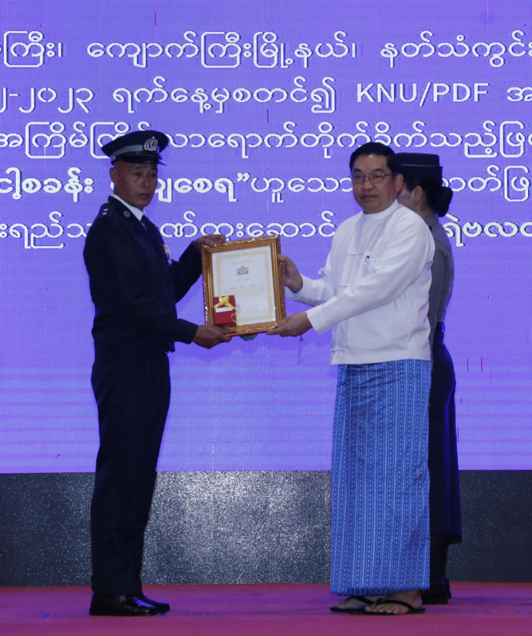 ယင်းနောက် နိုင်ငံတော်ယာယီသမ္မတ နိုင်ငံတော်လုံခြုံရေးနှင့် အေးချမ်းသာယာ ရေး ကော်မရှင်ဥက္ကဋ္ဌ ဗိုလ်ချုပ်မှူးကြီး မင်းအောင်လှိုင် က စွမ်းရည်သတ္တိ ဂုဏ်ထူး ဆောင် တံဆိပ်ရရှိသူ တပ်ဖွဲ့ဝင် ၄ ဦးကိုလည်းကောင်း၊ ကော်မရှင်အဖွဲ့ဝင် နိုင်ငံတော် ဝန်ကြီးချုပ် ဦးညိုစောက စွမ်းရည်သတ္တိဂုဏ်ထူးဆောင်တံဆိပ်ရရှိသူ ၃ ဦးကိုလည်း ကောင်း၊ ကော်မရှင်အဖွဲ့ဝင် ပြည်ထဲရေးဝန်ကြီးဌာန ပြည်ထောင်စုဝန်ကြီး ဒုတိယ ဗိုလ်ချုပ်ကြီး ထွန်းထွန်းနောင်က စွမ်းရည်သတ္တိဂုဏ်ထူးဆောင်တံဆိပ်ရရှိသူ ၁ ဦးနှင့် စွမ်းဆောင်မှုဆိုင်ရာ ဂုဏ်ပြုဆုတံဆိပ်ရရှိသူ ၂ ဦးကိုလည်းကောင်း ဂုဏ်ထူးဆောင် ဆုများ ပေးအပ်ချီးမြှင့်ကြသည်။