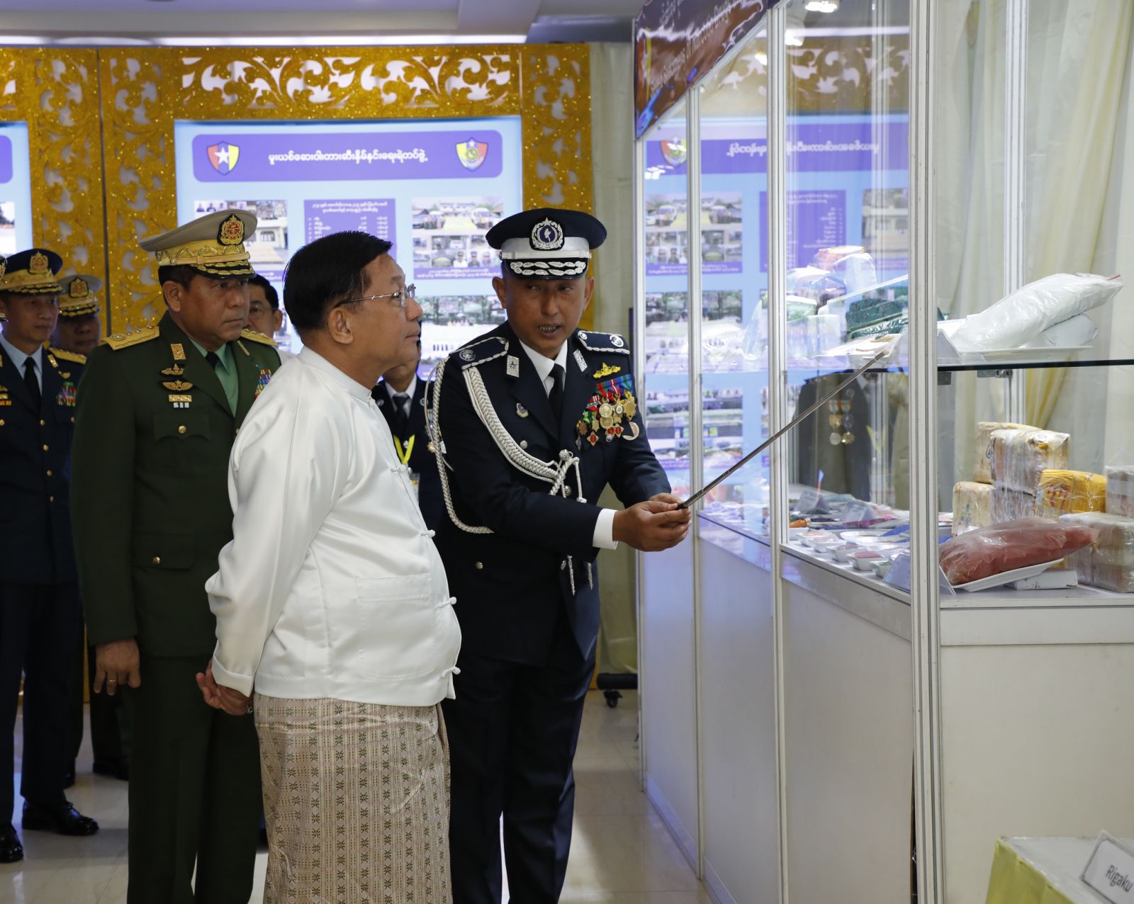 ယင်းနောက် (၆၁)နှစ်မြောက် မြန်မာနိုင်ငံရဲတပ်ဖွဲ့နေ့ အထိမ်းအမှတ် ခင်းကျင်း ပြသထားသည့် မှတ်တမ်းဓာတ်ပုံများ၊ တပ်ဖွဲ့/ဌာနများတွင် အသုံးပြုလျက်ရှိသည့် စက်ကိရိယာများ၊ နည်းပညာဆိုင်ရာပစ္စည်းများ၊ လက်နက်များ၊ ဝတ်စုံများ၊ ဆက်သွယ်ရေးပစ္စည်းများ၊ ဖမ်းဆီးရမိသည့် မူးယစ်ဆေးဝါးများနှင့် ပြခန်းများအတွင်း စိတ်ပါဝင်စားစွာဖြင့် လှည့်လည်ကြည့်ရှုခဲ့ကြောင်းသတင်းရရှိသည်။