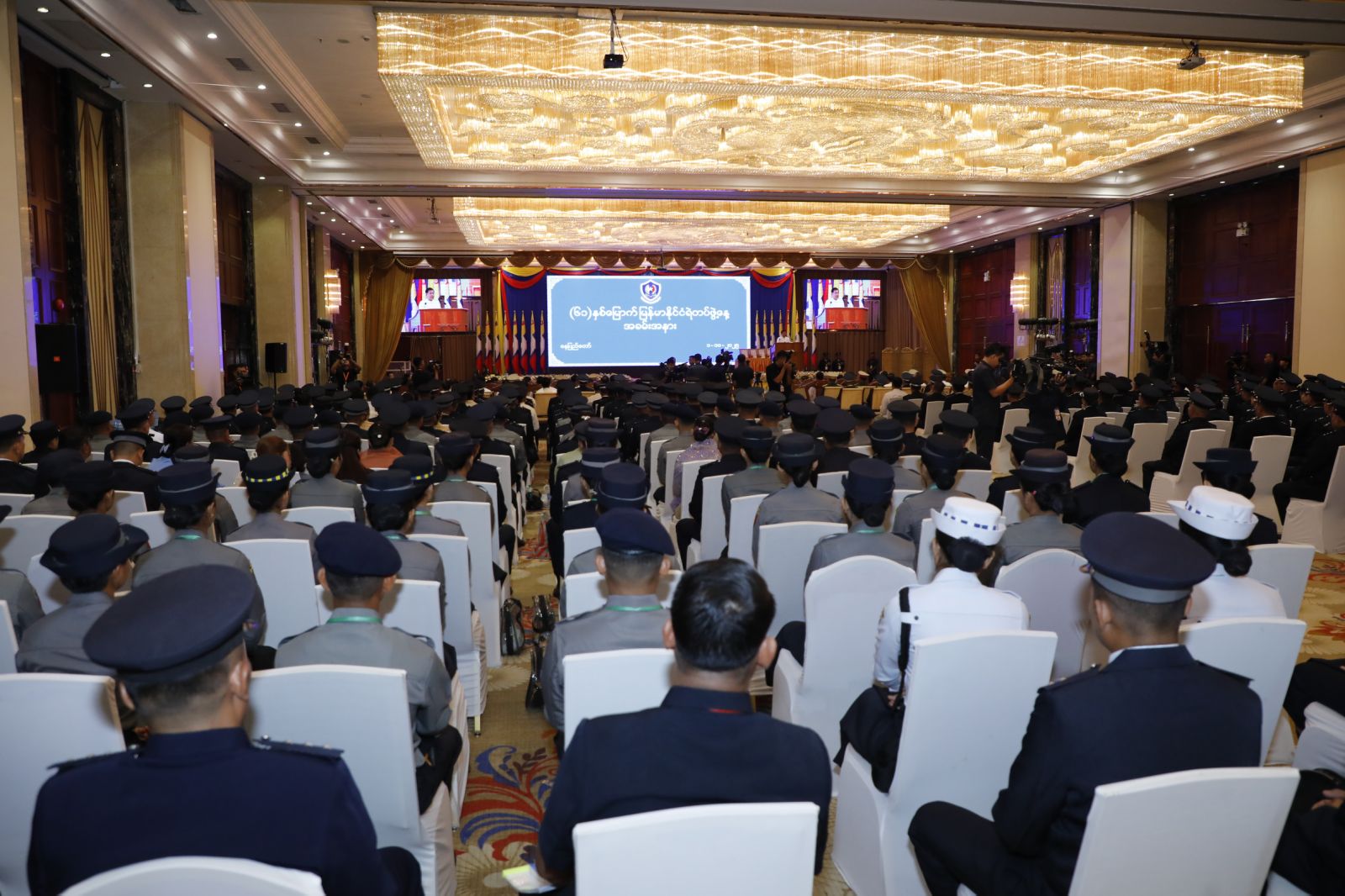 (၆၁)နှစ်မြောက် မြန်မာနိုင်ငံရဲတပ်ဖွဲ့နေ့အခမ်းအနားကို ယနေ့နံနက်ပိုင်းတွင် နေပြည်တော်ရှိ မင်္ဂလာသီရိဟိုတယ်၌ကျင်းပရာ ပြည်ထောင်စုသမ္မတမြန်မာနိုင်ငံတော် ယာယီသမ္မတ နိုင်ငံတော်လုံခြုံရေးနှင့် အေးချမ်းသာယာရေးကော်မရှင်ဥက္ကဋ္ဌ ဗိုလ်ချုပ်မှူးကြီး မင်းအောင်လှိုင် တက်ရောက်မိန့်ခွန်း ပြောကြားသည်။