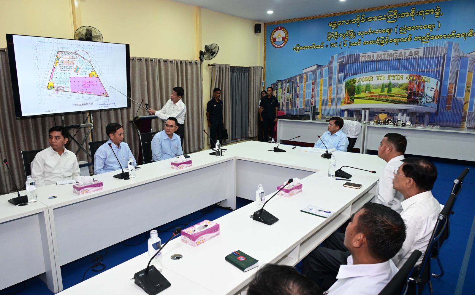 ရှင်းလင်းတင်ပြမှုများအပေါ် နိုင်ငံတော်ယာယီသမ္မတနိုင်ငံတော်လုံခြုံရေးနှင့် အေး ချမ်းသာယာရေးကော်မရှင်ဥက္ကဋ္ဌ ယခုအဆင့်မြင့်ဈေးသစ်တည်ဆောက်စေခြင်းသည် ပြင်ဦးလွင်မြို့၏ လူနေမှုထူထပ်လာမှုများ၊ ခရီးသွားလာမှု များပြားလာမှုများနှင့် ကိုက် ညီသည့် အဆင့်မီဈေးတစ်ခုဖြစ်ပေါ်လာစေရန်နှင့် ဒေသထွက်နှင့် အခြေခံသုံးကုန် ပစ္စည်းများကို တစ်နေရာတည်းတွင် တစ်စုတစ်စည်းတည်းရရှိနိုင်စေရန် ရည်ရွယ်ဆောင် ရွက်စေခဲ့ခြင်းဖြစ်ကြောင်း၊ မြို့ပြဖွံ့ဖြိုးတိုးတက်မှုနှင့်ကိုက်ညီသည့် အဆင့်မြင့်ဈေးဖြစ် ပေါ်လာစေရေး ကြပ်မတ်ဆောင်ရွက်သွားရမည်ဖြစ်ကြောင်း၊ တည်ဆောက်ရေးလုပ်ငန်း များအားလုံးပြီးစီးပါက ဈေးဆိုင်ခန်းများ စနစ်တကျဖြစ်စေရေးအတွက်လည်း ကြပ်မတ် ဆောင်ရွက်သွားရန်လိုပြီး သန့်ရှင်းမှုရှိစေရေးကို အလေးထားဆောင်ရွက်သွားရန်နှင့် ရေ/ မီးစနစ်များ စနစ်တကျရှိစေရေး ဆောင်ရွက်ရမည်ဖြစ်ကြောင်းနှင့် အခြားလိုအပ်သည် များကိုလမ်းညွှန်မှာကြားသည်။