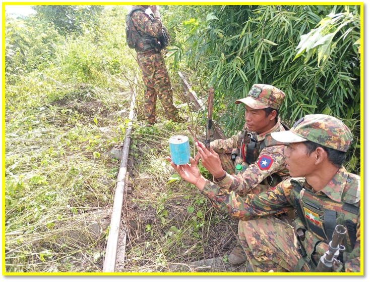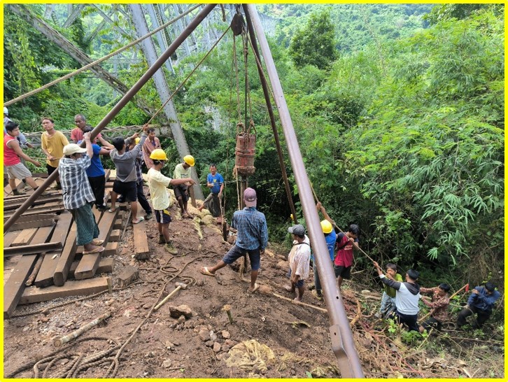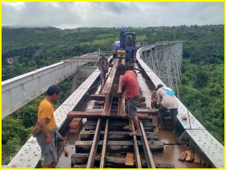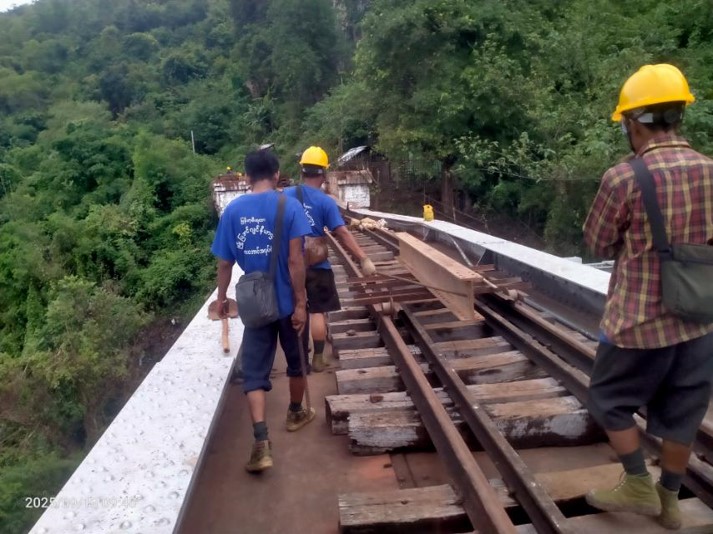 ထို့နောက် ပို့ဆောင်ရေးနှင့်ဆက်သွယ်ရေးဝန်ကြီးဌာန ပြည်ထောင်စုဝန်ကြီးနှင့် တာဝန်ရှိသူများက မန္တလေး-လားရှိုး ရထားလမ်းပိုင်းရှိ ပြင်ဦးလွင်- နောင်ချို-ဂုတ်ထိပ်-ကျောက်မဲ ရထားလမ်းပိုင်းအား ပြန်လည်ပြေးဆွဲနိုင်ရေးအတွက် အကြမ်းဖက် သောင်း ကျန်းသူများ၏ မိုင်းထောင်ဖောက်ခွဲခဲ့မှုကြောင့် ပျက်စီးခဲ့သည့် ဂုတ်ထိပ်-နောင်ပိန် ကြား ဂုတ်ထိပ်တံတားတိုင်အမှတ်(၁၆)နှင့် ကမ်းကပ်ခုံအမှတ်(၂) အကြား ထိခိုက်ပျက်စီးမှုအား ရှေးမူလပုံစံပါအတိုင်း သံဘောင်အသစ် အစားထိုးပြင်ဆင် ဆောင်ရွက်လျက်ရှိမှု၊ ပျက်စီး ခဲ့သည့် သံဘောင်အဟောင်းအား ဖယ်ရှားရှင်းလင်း၍ ယာယီအဖြစ် Way Beam သံဘောင်များထည့်သွင်းပြီး သံလမ်းခင်းခြင်းလုပ်ငန်းများ ဆောင်ရွက်လျက်ရှိမှုနှင့် ပျက်စီးခဲ့သည့်သံဘောင်နှင့် ပုံစံတူသံဘောင်သစ်အား ပြန်လည် ထုတ်လုပ်လျက်ရှိမှု၊ လမ်းပိုင်းတစ်လျှောက် တောချုံခုတ်ခြင်းနှင့် လမ်းပိုင်းများ ပြုပြင် ခြင်း၊ ထုံးဖို-ပြင်ဦးလွင်-နောင်ချို-ဂုတ်ထိပ်-ကျောက်မဲရထားလမ်းပိုင်း ပြုပြင်ထိန်းသိမ်း ဆောင်ရွက်ခြင်းနှင့် ရထားလမ်းတစ်လျှောက် အကြမ်းဖက်သောင်းကျန်းသူများ ထောင် ထားသည့် မိုင်းများ ရှင်းလင်းခဲ့မှု အခြေအနေများ၊ ရထားသံလမ်း အစိတ်အပိုင်း များနှင့် ဆက်စပ် ပစ္စည်းများအား သောင်းကျန်းသူများက ဖျက်ဆီးခဲ့မှုများ၊ သံလမ်းဆက်ပြား ၃၈၃၂ ပြား၊ မူလီ ၁၇၁၈၈ လုံး၊ သံလမ်းထိန်းကလစ် ၁၆၃၁၁၅ ချောင်းတို့အား အကြမ်း ဖက်သောင်း ကျန်းသူများက ခိုးယူသွားမှုနှင့် အချိန်မီအစားထိုးတပ်ဆင်နိုင်ရေးဆောင် ရွက်လျက်ရှိမှု အခြေအနေများနှင့် ရထားလမ်းပြန်လည်ဖွင့်လှစ်နိုင်ရေး ဆောင်ရွက်လျက် ရှိမှုအခြေ အနေများနှင့်ပတ်သက်၍ ရှင်းလင်းတင်ပြသည်။