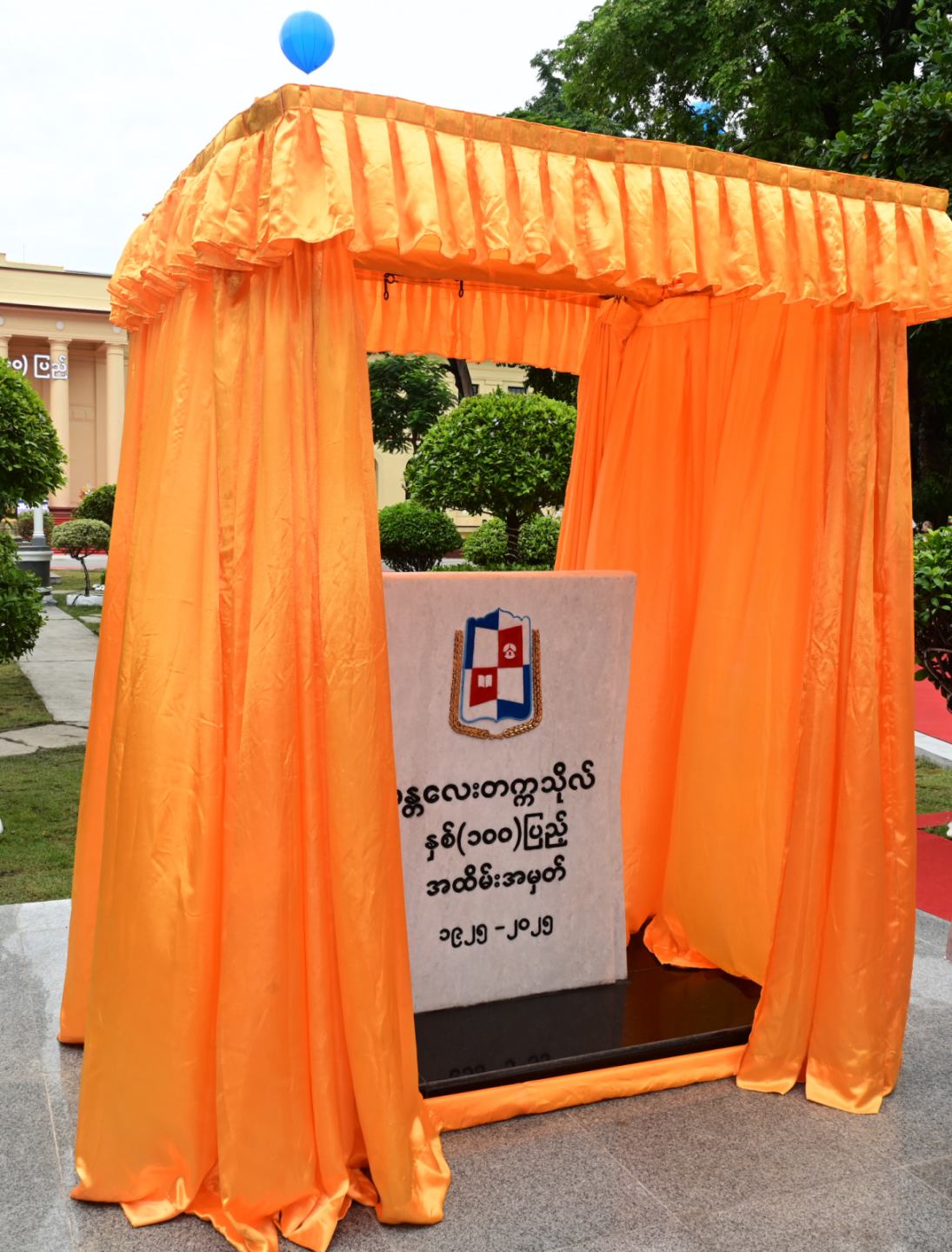 “ရွှေနှစ် ၁၀၀ ထူးချွန်မှု၊ ဆန်းသစ်တီထွင်ဦးဆောင်ပြု၊ စိတ်ဉာဏ်စွမ်းအားတိုးမြှင့်ထား၊ အနာဂတ်ကိုပုံဖော်ထား”