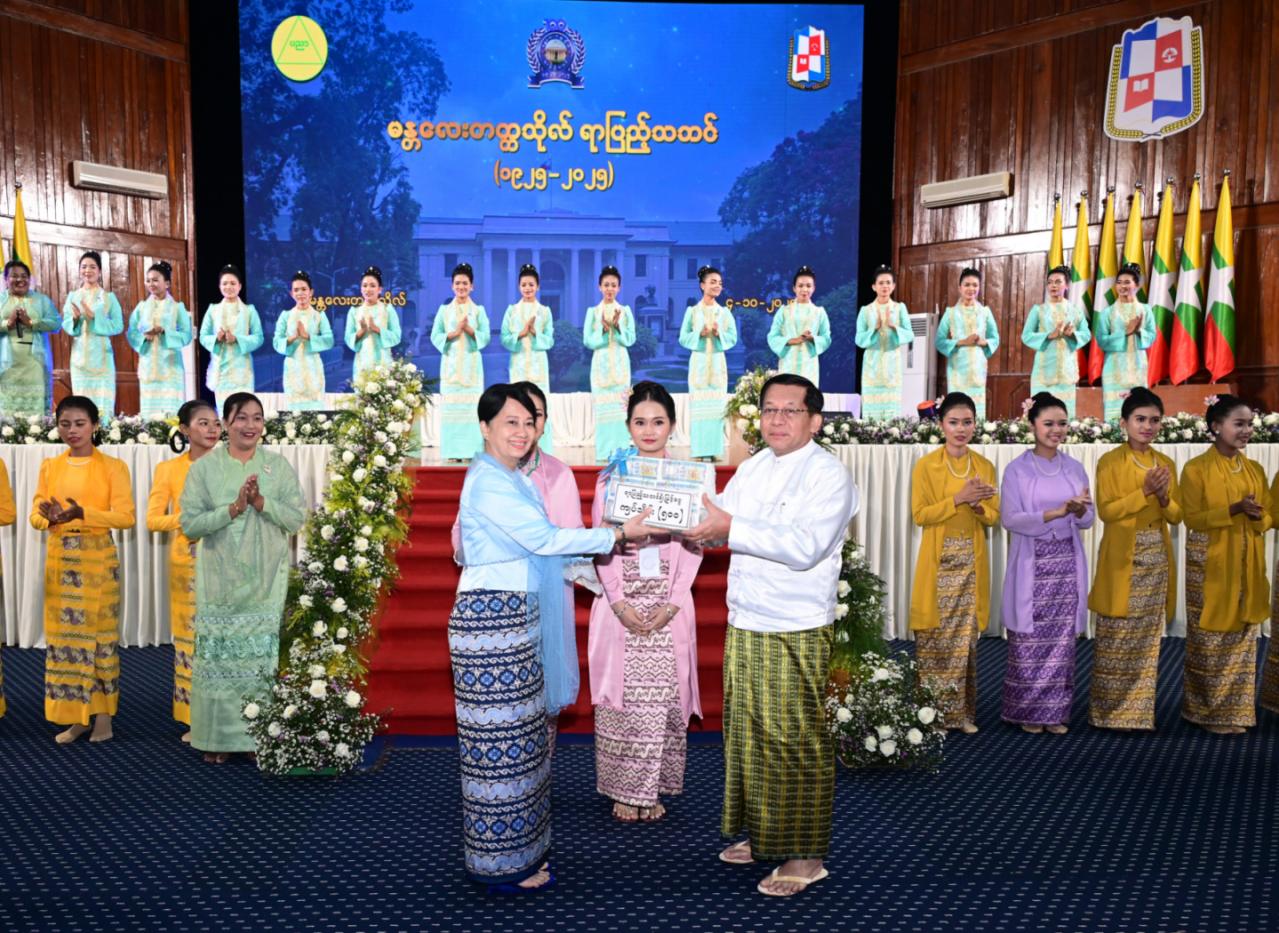 ၎င်းနောက် ဖျော်ဖြေတင်ဆက်ခဲ့သည့် ကျောင်းသား၊ ကျောင်းသူများအား နိုင်ငံတော်ယာယီ သမ္မတ နိုင်ငံတော်လုံခြုံရေးနှင့် အေးချမ်းသာယာရေးကော်မရှင်ဥက္ကဋ္ဌ က ဂုဏ်ပြုပန်းခြင်း ပေးအပ်ပြီး အခမ်းအနားတက်ရောက်လာကြသူများအား ရင်းရင်း နှီးနှီး နှုတ်ဆက်သည်။