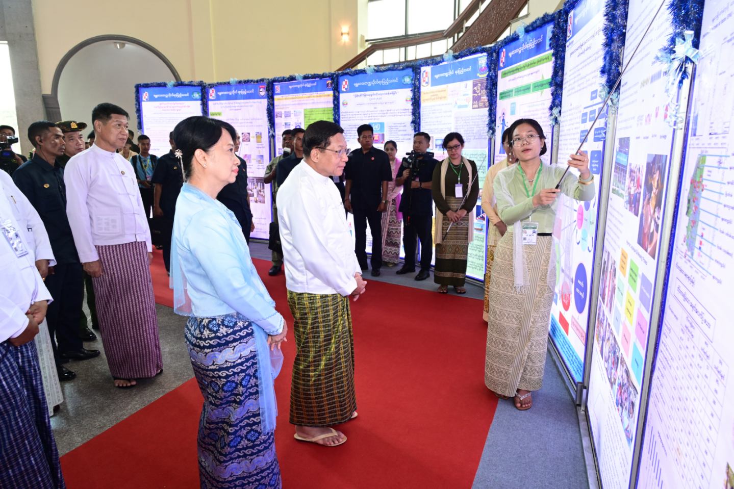 ယင်းနောက် နိုင်ငံတော်ယာယီသမ္မတ နိုင်ငံတော်လုံခြုံရေးနှင့် အေးချမ်းသာယာ ရေး ကော်မရှင်ဥက္ကဋ္ဌနှင့်အဖွဲ့ဝင်များသည် ဘွဲ့နှင်းသဘင်ခန်းမအတွင်းခင်းကျင်းပြသထား သည့် မန္တလေးတက္ကသိုလ် ရာပြည့်သဘင်အခမ်းအနား အထိမ်းအမှတ် ပြခန်းများအား ပြခန်းတစ်ခုချင်းစီအလိုက် နှင့် ပညာရပ်ဆိုင်ရာ သုတေသနစာတမ်းပိုစတာများအား စိတ်ပါဝင်စားစွာဖြင့် လှည့်လည်ကြည့်ရှုကြသည်။