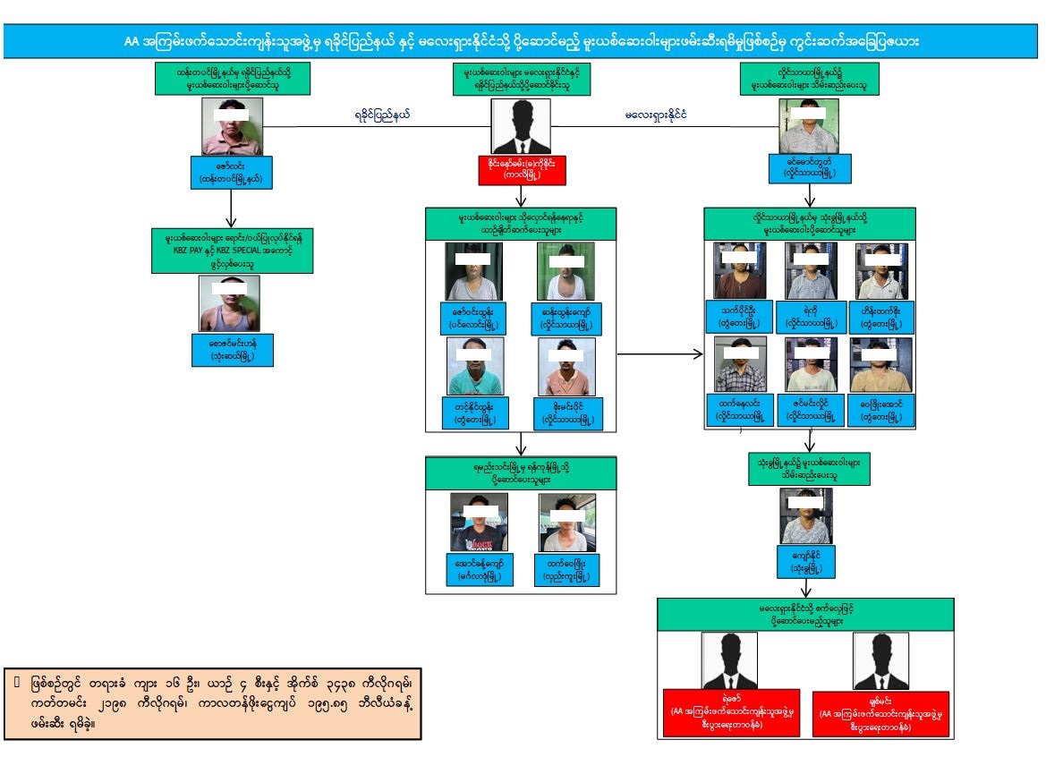 ဖမ်းဆီးရမိသူများ၏ထွက်ဆိုချက်အရ ကာလိမြို့နေ စိုင်းနော်ခမ်း(ခ)ကိုစိုင်း (ဖမ်းဆီးရန် ကျန်)က ရှမ်းပြည်နယ်(တောင်ပိုင်း)၊ လွိုင်လင်ခရိုင်၊ ကျေးသီးမြို့နယ်၊ ဝမ်ဟိုင်းဒေသမှ မူးယစ် ဆေးဝါးများကို ရမည်းသင်းမြို့သို့ ပို့ဆောင်ပေးခဲ့ရာ ရမည်းသင်းမြို့မှ ရန်ကုန်မြို့သို့ အောင်ခန့်ကျော် နှင့် ထက်ဝေဖြိုး တို့က ဆက်လက်သယ်ဆောင်ခဲ့ကြောင်း၊ စိုင်းနော်ခမ်း(ဖမ်းဆီးရန်ကျန်)၏ စေခိုင်း ချက်အရ ရခိုင်ပြည်နယ်သို့ ပို့ဆောင်မည့် မူးယစ်ဆေးဝါးများကို ဇော်လင်း ငှားရမ်းထားသည့် ထန်းတပင်မြို့နယ်၊ စည်ပင်သာကျေးရွာရှိ နေအိမ်၌ သိုလှောင်သိမ်းဆည်းထားစဉ် ဖမ်းဆီးခံရခြင်း ဖြစ်ကြောင်းနှင့် မလေးရှားနိုင်ငံသို့ ပို့ဆောင်မည့် မူးယစ်ဆေးဝါးများကို ခင်မောင်တွတ် က လှိုင်သာယာမြို့နယ်၌ ခေတ္တသိုလှောင်သိမ်းဆည်းပေးခဲ့ပြီး ၎င်းနေရာမှတဆင့် ပင်လယ်ကမ်းစပ်ဖြစ်သည့် သုံးခွမြို့နယ်၊ သမစိတ္တကျေးရွာရှိ ကျော်နိုင် ၏ ဂိုဒေါင်သို့ ပို့ဆောင်သိုလှောင်ခဲ့ကြောင်း၊ ဖမ်းဆီးရမိ သူ ကျော်နိုင် ၏ထွက်ဆိုချက်အရ ဂိုဒေါင်၌ဖမ်းဆီးရမိသည့် မူးယစ်ဆေးဝါးများကို AA အကြမ်းဖက်သောင်းကျန်းသူအဖွဲ့မှ စီးပွားရေးတာဝန်ခံများဖြစ်သည့် ရဲဇော်(ဖမ်းဆီးရန်ကျန်)နှင့် ချစ်မင်း(ဖမ်းဆီးရန်ကျန်)တို့က ပင်လယ်ရေလမ်းကြောင်းဖြင့် မလေးရှားနိုင်ငံသို့ ဆက်လက်ပို့ဆောင် ရန် စီစဉ်နေစဉ် ဖမ်းဆီးခံရခြင်းဖြစ်ကြောင်း သိရှိရသည်။