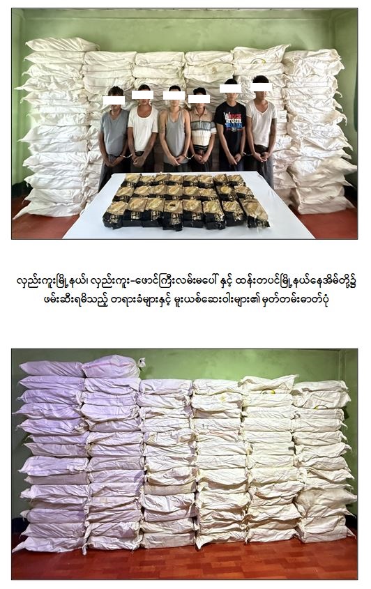 သို့ဖြစ်၍ မူးယစ်ဆေးဝါးသယ်ဆောင် ရောင်းဝယ်ခြင်းနှင့် အကြမ်းဖက်လုပ်ရပ်များကို မလို လားသည့် ဒေသခံပြည်သူများ၏ သတင်းပေးပို့ချက်အရ ၂၀၂၅ ခုနှစ်၊ စက်တင်ဘာ ၂၄ ရက်တွင် ရှမ်းပြည်နယ်မှ မူးယစ်ဆေးဝါးများအား ရန်ကုန်မြို့မှတစ်ဆင့် ရခိုင်ပြည်နယ်နှင့် မလေးရှားနိုင်ငံသို့ ပို့ဆောင်မည်ဖြစ်ကြောင်း သိရှိရသဖြင့် လုံခြုံရေးတပ်ဖွဲ့ဝင်များက ပိတ်ဆို့ရှာဖွေစစ်ဆေးခဲ့ရာ လှည်းကူးမြို့နယ်၊ လှည်းကူး-ဖောင်ကြီးလမ်းမပေါ်၌ ယာဉ်မောင်း အောင်ခန့်ကျော် နှင့် ယာဉ်နောက် လိုက် ထက်ဝေဖြိုး တို့ကို ၎င်းတို့မောင်းနှင်လာသည့် NISSAN CONDOR ယာဉ်ပေါ်မှ အိုက်စ် ၁၄၃၉ ကီလိုဂရမ်၊ တန်ဖိုးငွေကျပ် ၃၅.၉၇ ဘီလီယံခန့်နှင့်အတူ ဖမ်းဆီးရမိခဲ့ပြီး ၎င်းတို့ ၂ ဦး၏ ထွက်ဆိုချက်အရ စက်တင်ဘာ ၂၅ ရက်တွင် ရွှေပြည်သာမြို့နယ်၊ ဒညင်းကုန်း လမ်းဆုံအနီးရှိ “ရွှေမောင်း”လက်ဖက်ရည်ဆိုင်၌ မူးယစ်ဆေးဝါး သယ်ဆောင်မည့်ယာဉ်အား ငှားရမ်းချိတ်ဆက် ပေးသည့် ဇော်ဝင်းထွန်း နှင့် ဆန်းထွန်းကျော် တို့ ၂ ဦး အားလည်းကောင်း၊ ထန်းတပင်မြို့နယ်၊ စည်ပင်သာကျေးရွာရှိ နေအိမ်၌ မူးယစ်ဆေးဝါးများ သိုလှောင်သိမ်းဆည်းပေးသူ ဇော်လင်း၊ စောဇင်မင်းဟန် တို့ကို အိုက်စ် ၁၉၉၉ ကီလိုဂရမ်၊ တန်ဖိုးငွေကျပ် ၄၉.၉၇ ဘီလီယံခန့် နှင့်အတူ လည်း ကောင်း ထပ်မံဖမ်းဆီးရမိခဲ့ကြောင်း သိရှိရသည်။