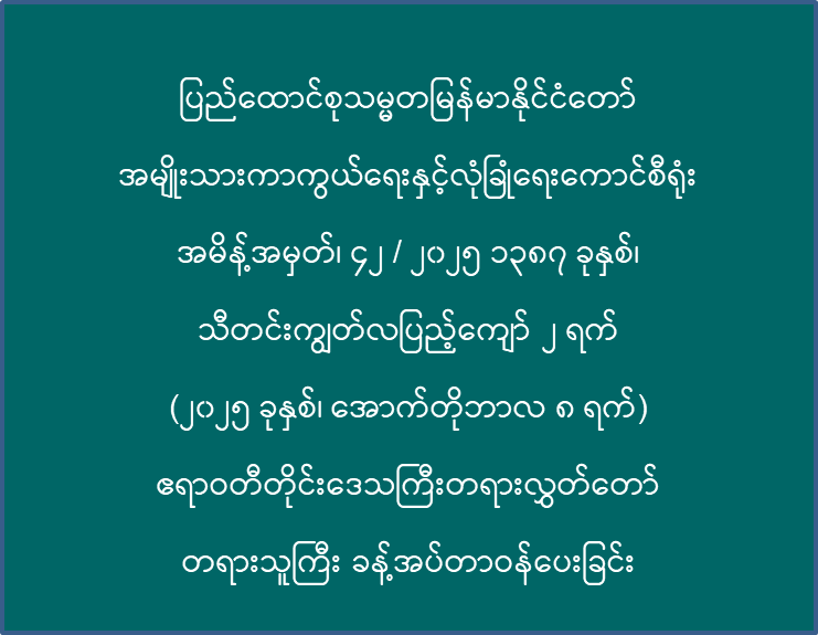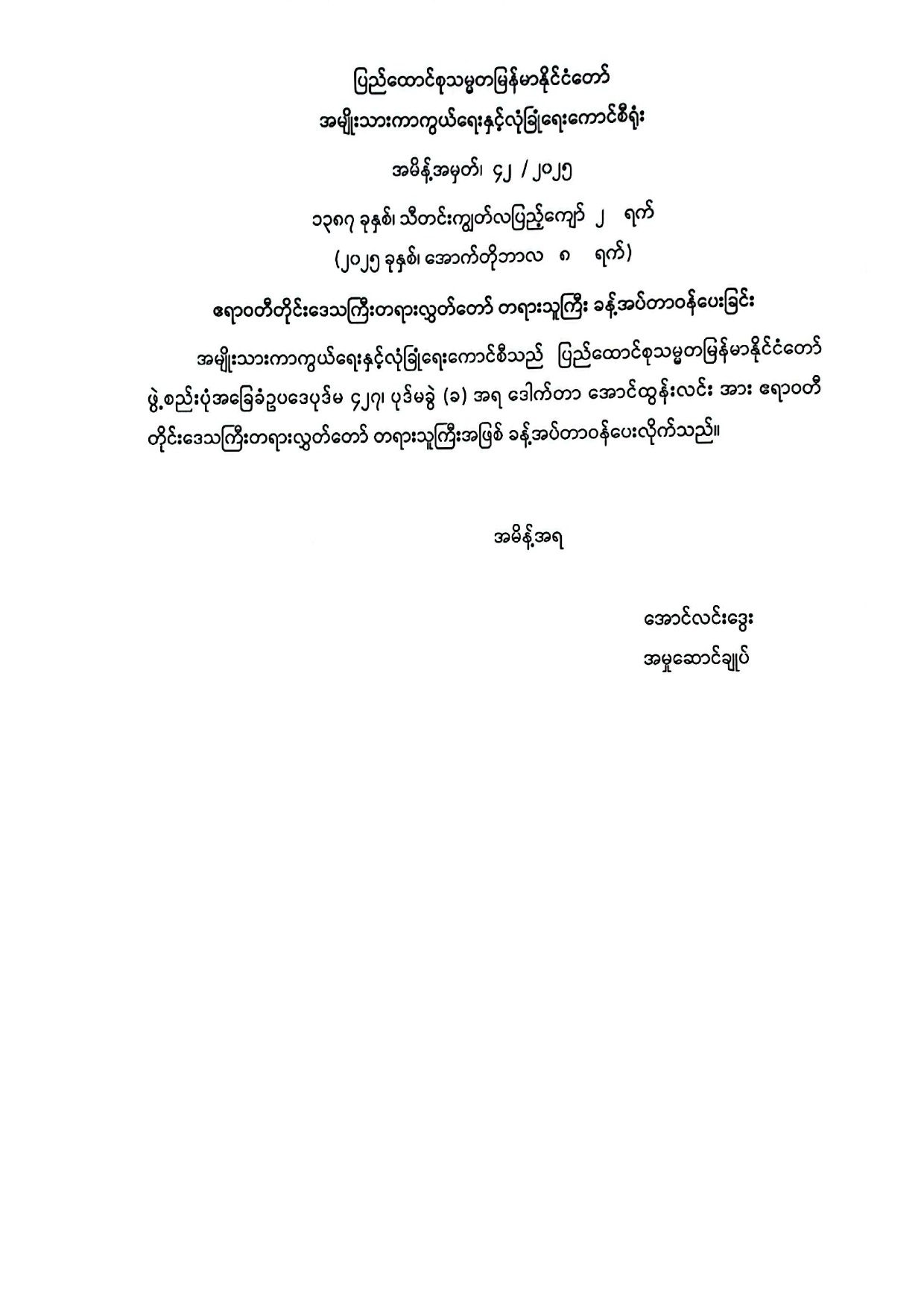ပြည်ထောင်စုသမ္မတမြန်မာနိုင်ငံတော် အမျိုးသားကာကွယ်ရေးနှင့်လုံခြုံရေးကောင်စီရုံး အမိန့်အမှတ်၊ ၄၂ / ၂၀၂၅ ၁၃၈၇ ခုနှစ်၊ သီတင်းကျွတ်လပြည့်ကျော် ၂ ရက် (၂၀၂၅ ခုနှစ်၊ အောက်တိုဘာလ ၈ ရက်) ဧရာဝတီတိုင်းဒေသကြီးတရားလွှတ်တော် တရားသူကြီး ခန့်အပ်တာဝန်ပေးခြင်း