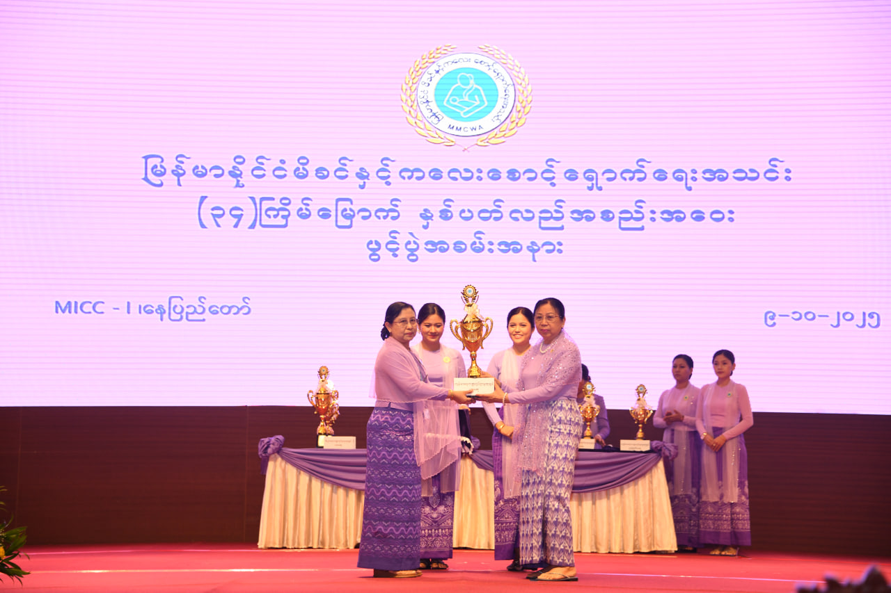 ထို့နောက် မြန်မာနိုင်ငံမိခင်နှင့် ကလေးစောင့်ရှောက်ရေးအသင်း၏ လှုပ်ရှားမှု မှတ်တမ်း ဗွီဒီယိုကိုပြသသည်။ ယင်းနောက် နေပြည်တော်၊ တိုင်းဒေသကြီးနှင့် ပြည်နယ် မိခင်နှင့်ကလေး စောင့်ရှောက်မှုကြီးကြပ်ရေးအဖွဲ့များ၏ ကျန်းမာရေး၊ ပညာရေး၊ လူမှုရေးနှင့် စီးပွားရေးစသည့် ကဏ္ဍကြီး(၄)ရပ်လှုပ်ရှားမှုအတွက် ကဏ္ဍ အလိုက် ထူးချွန်ဆုများချီးမြှင့်ခြင်း အစီအစဉ်ကို ဆက်လက်ကျင်းပရာ ဂုဏ်ထူးဆောင် နာယက ဒေါ်ကြူကြူလှက ကျန်းမာရေးကဏ္ဍ လှုပ်ရှားမှုအတွက် ပထမဆုရရှိသည့် ရန်ကုန်တိုင်းဒေသကြီး၊ ဒုတိယဆုရရှိသည့် ကချင်ပြည်နယ်၊ ပူးတွဲဒုတိယဆုရရှိသည့် မန္တလေးတိုင်းဒေသကြီးနှင့် တတိယဆုရရှိသည့် စစ်ကိုင်းတိုင်းဒေသကြီးတို့မှ မိခင်နှင့် ကလေးစောင့်ရှောက်မှုကြီးကြပ်ရေးအဖွဲ့များကို ဆုများပေးအပ်ချီးမြှင့်ရာ သက်ဆိုင်ရာ အဖွဲ့ဥက္ကဋ္ဌများက လက်ခံရယူကြသည်။