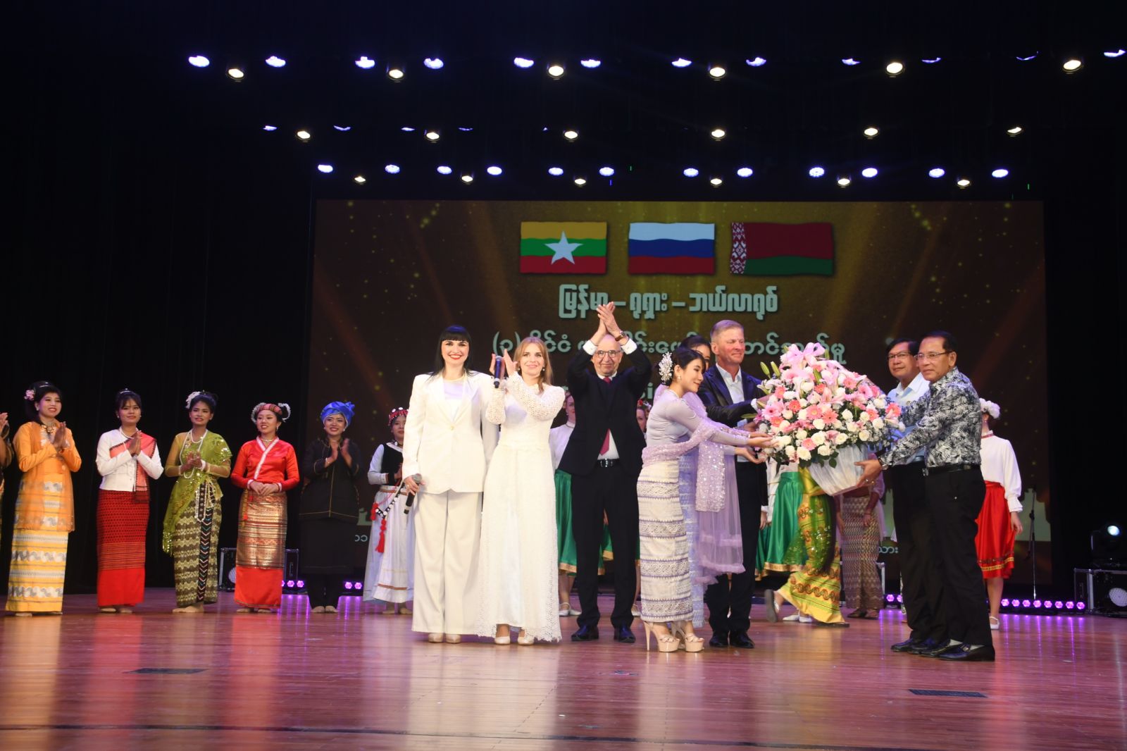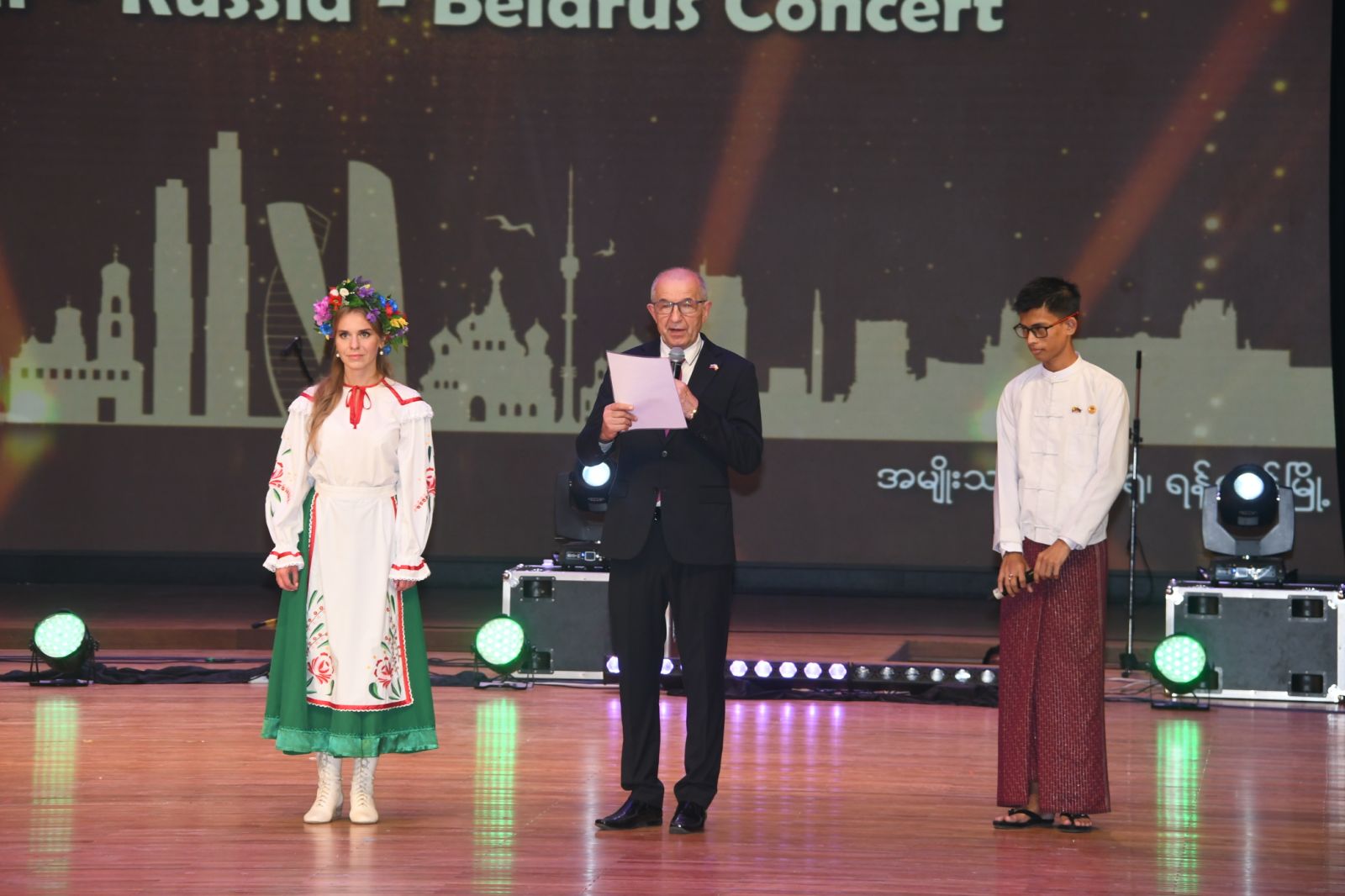 ရုရှား-မြန်မာ-ဘယ်လာရုစ် သုံးနိုင်ငံ ပူးပေါင်းဖျော်ဖြေတင်ဆက်ပွဲကို ယနေ့ ညပိုင်းတွင် ရန်ကုန်မြို့ ဒဂုံမြို့နယ် မြို့မကျောင်းရှိ အမျိုးသားဇာတ်ရုံ၌ ကျင်းပသည်။