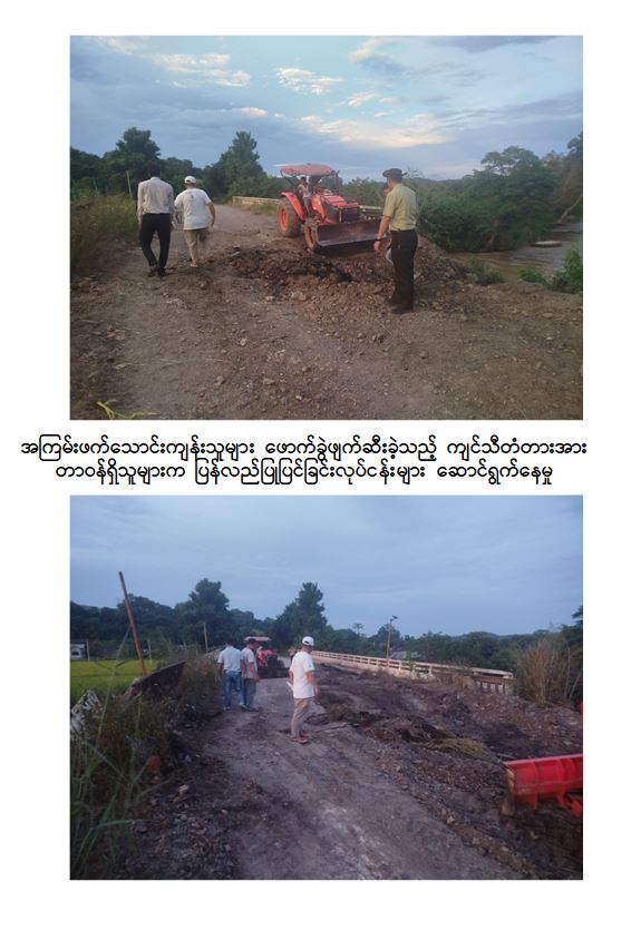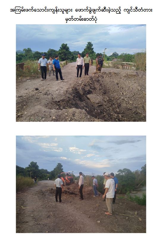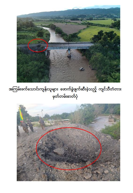 ထိုပြင် အကြမ်းဖက်သောင်းကျန်းသူများသည် တပ်မတော်စစ်ကြောင်းများ နှင့် တိုက်ပွဲများဖြစ်ပွားစဉ်ကာလအတွင်း ၎င်းတို့ဆုတ်ခွာထွက်ပြေးရာ လမ်းကြောင်း တစ်လျှောက်ရှိ မြန်မာနိုင်ငံ၏ အထင်ကရအမှတ်အသားနှင့် ကမ္ဘာကျော် ရှေးဟောင်း မီးရထားလမ်းတံတား တစ်စင်းဖြစ်သည့် ဂုတ်ထိပ်တံတား၊ ဂုတ်တွင်းတံတားအပါအဝင် အများပြည်သူ အဓိကသွားလာအသုံးပြုလျက်ရှိသည့် တံတားကြီး/ငယ်များအား ယုတ်မာရိုင်းစိုင်းစွာ မိုင်းထောင်ဖောက်ခွဲဖျက်ဆီးခြင်း၊ လမ်းများ ပိတ်ဆို့တားဆီးခြင်း များ လုပ်ဆောင်ခဲ့သဖြင့် တပ်မတော်စစ်ကြောင်းများနှင့် ဌာနဆိုင်ရာတာဝန်ရှိသူများ က လူအင်အား၊ စက်ယန္တရားများအသုံးပြု၍ ပြန်လည်ပြုပြင်ခြင်းနှင့် ဖယ်ရှားရှင်းလင်း ခြင်းလုပ်ငန်းများ ဆောင်ရွက်လျက်ရှိသည်။
