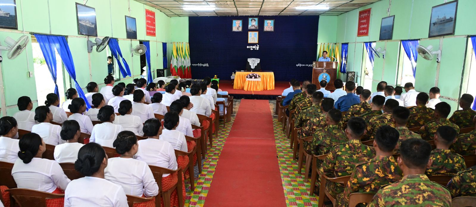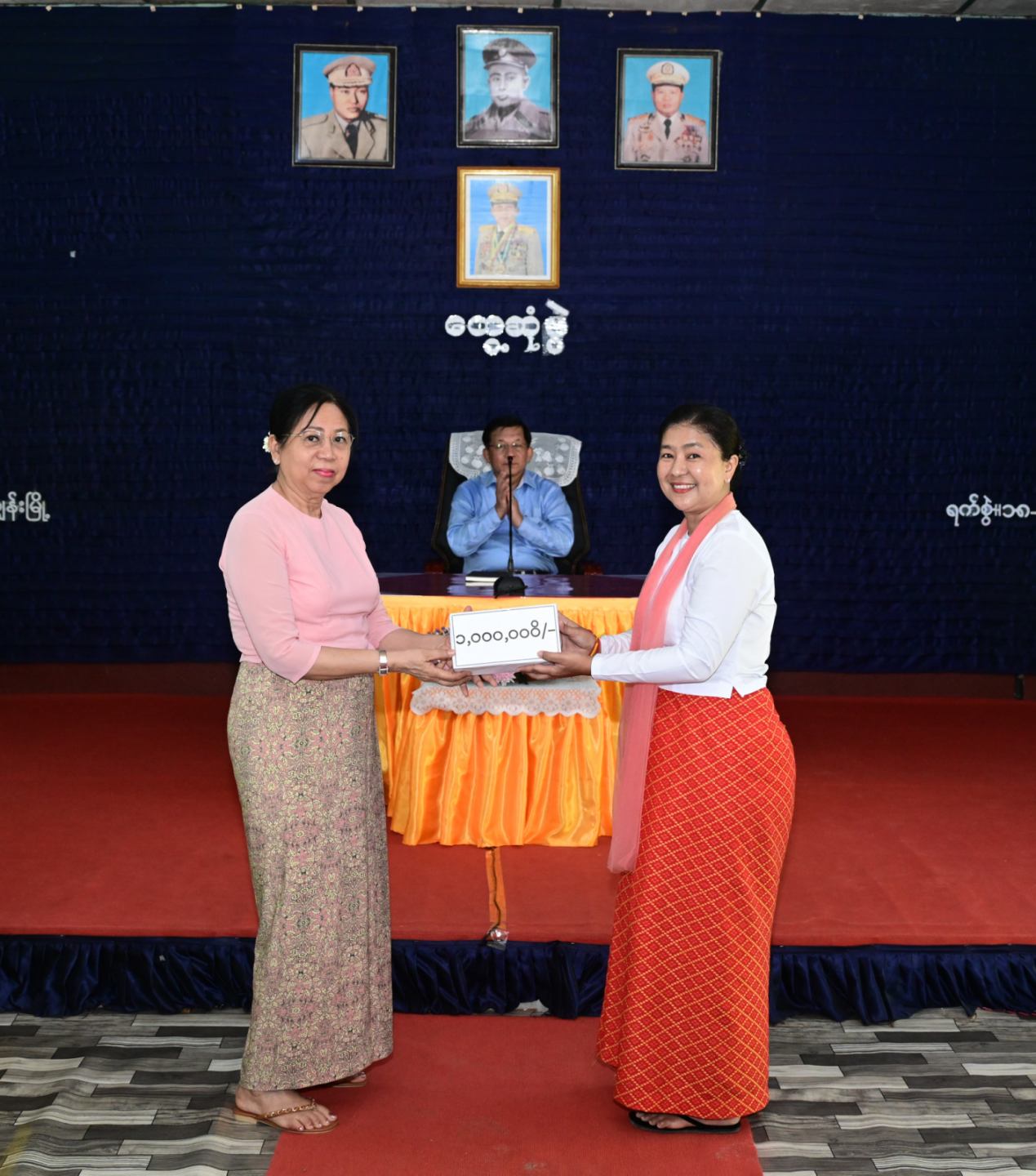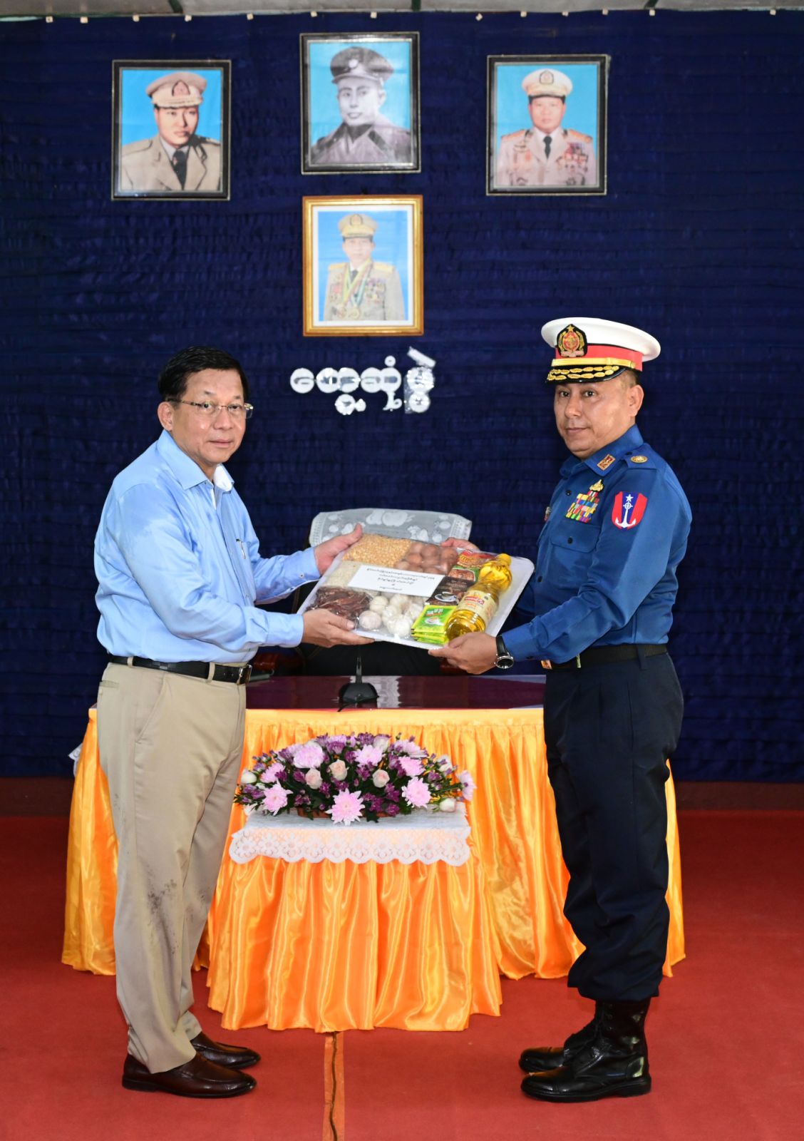 ထို့နောက် နိုင်ငံတော်လုံခြုံရေးနှင့်အေးချမ်းသာယာရေး ကော်မရှင် ဥက္ကဋ္ဌ တပ်မတော်ကာကွယ်ရေးဦးစီးချုပ်က တပ်နယ်မှအရာရှိ၊ စစ်သည်မိသားစုများ အတွက် စားသောက်ဖွယ်ရာများကိုလည်းကောင်း၊ နိုင်ငံတော်လုံခြုံရေးနှင့်အေးချမ်း သာယာရေး ကော်မရှင်ဥက္ကဋ္ဌ တပ်မတော်ကာကွယ်ရေးစီးချုပ်၏ ဇနီးက တပ်နယ်မိခင်နှင့် ကလေးရန်ပုံငွေ များကိုလည်းကောင်းပေးအပ်ရာ ရေတပ်ဌာနချုပ်မှူးနှင့် ဇနီးတို့က လက်ခံရယူကြသည်။
