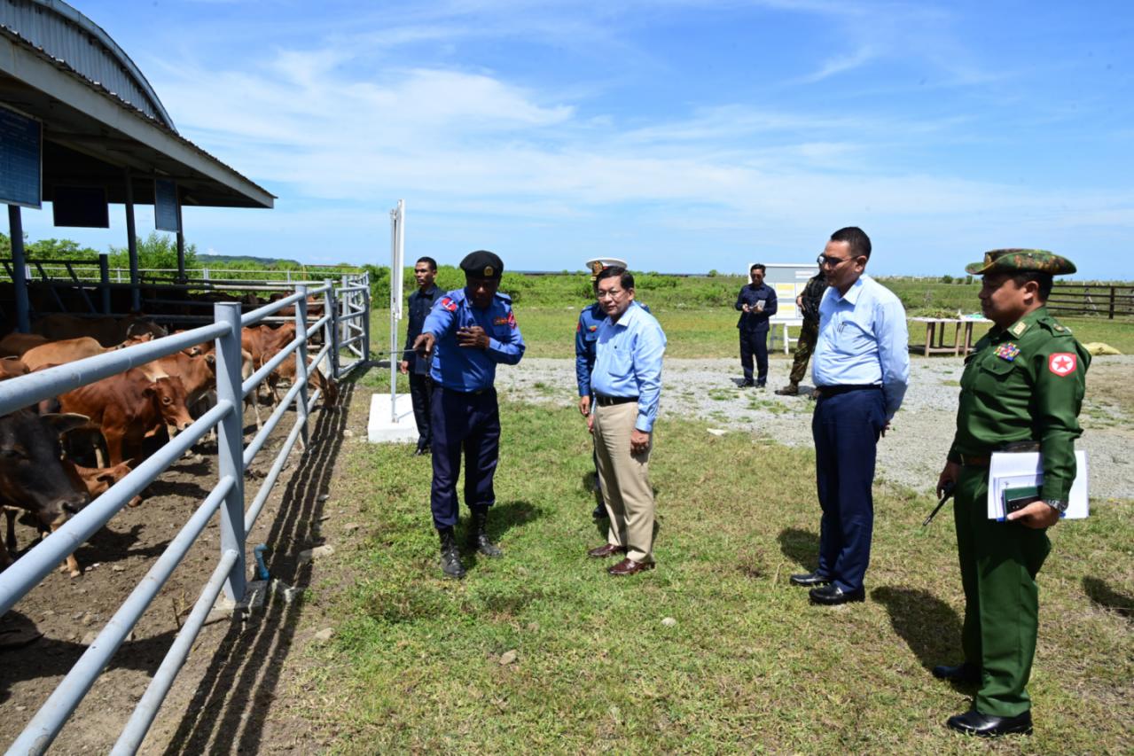 ဆက်လက်၍ နိုင်ငံတော်လုံခြုံရေးနှင့်အေးချမ်းသာယာရေးကော်မရှင် ဥက္ကဋ္ဌ တပ်မတော်ကာကွယ်ရေးဦးစီးချုပ် သည် တပ်နယ်ရှိ နွားမွေးမြူရေးခြံအတွင်း ဒေသ နွားများ မွေးမြူထားရှိမှုများကိုကြည့်ရှုစစ်ဆေးပြီး တာဝန်ရှိသူများ၏ တင်ပြချက်များ အပေါ် လိုအပ်သည်များလမ်းညွှန်မှာကြားသည်။