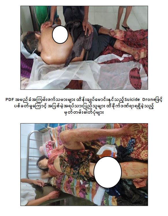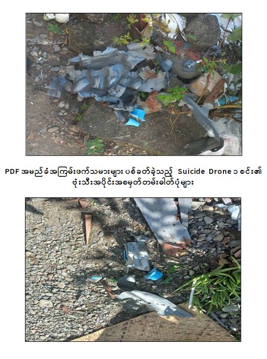 PDF အမည်ခံ အကြမ်းဖက်သမားများသည် ၎င်းတို့၏ ကိုယ်ကျိုးစီးပွားနှင့် အစွန်းရောက်နိုင်ငံရေးခံယူချက်များအတွက် နိုင်ငံတော်တာဝန်ကိုထမ်းဆောင်နေကြ သည့် နိုင်ငံ့ဝန်ထမ်းများနှင့် အေးချမ်းစွာနေထိုင်နေကြသည့် ပြည်သူလူထုအား လက် နက်အားကိုးဖြင့် ဖမ်းဆီး၊ နှိပ်စက်၊ သတ်ဖြတ်ခြင်း၊ လမ်းတံတားများအား မိုင်းထောင် ဖောက်ခွဲဖျက်ဆီးခြင်းတို့ကို ဆင်ခြင်တုံတရားမဲ့စွာ လုပ်ဆောင်လျက်ရှိကြရာ ယနေ့ နံနက်ပိုင်းတွင်လည်း ၎င်းတို့ထိန်းချုပ်မောင်းနှင်ပြီး အကြောင်းမဲ့ ပစ်ခတ်ခဲ့သည့် Suicide Drone ကျရောက် ပေါက်ကွဲမှုကြောင့် စစ်ကိုင်းတိုင်းဒေသကြီး၊ ကလေးမြို့၊ ပင်လုံရပ်ကွက်ရှိ ဒေသခံပြည်သူ အမျိုးသား ၁ ဦးနှင့် အမျိုးသမီး ၁ ဦး ဗုံးစထိမှန်ဒဏ်ရာများ ရရှိခဲ့ ကြောင်း သိရှိရသည်။