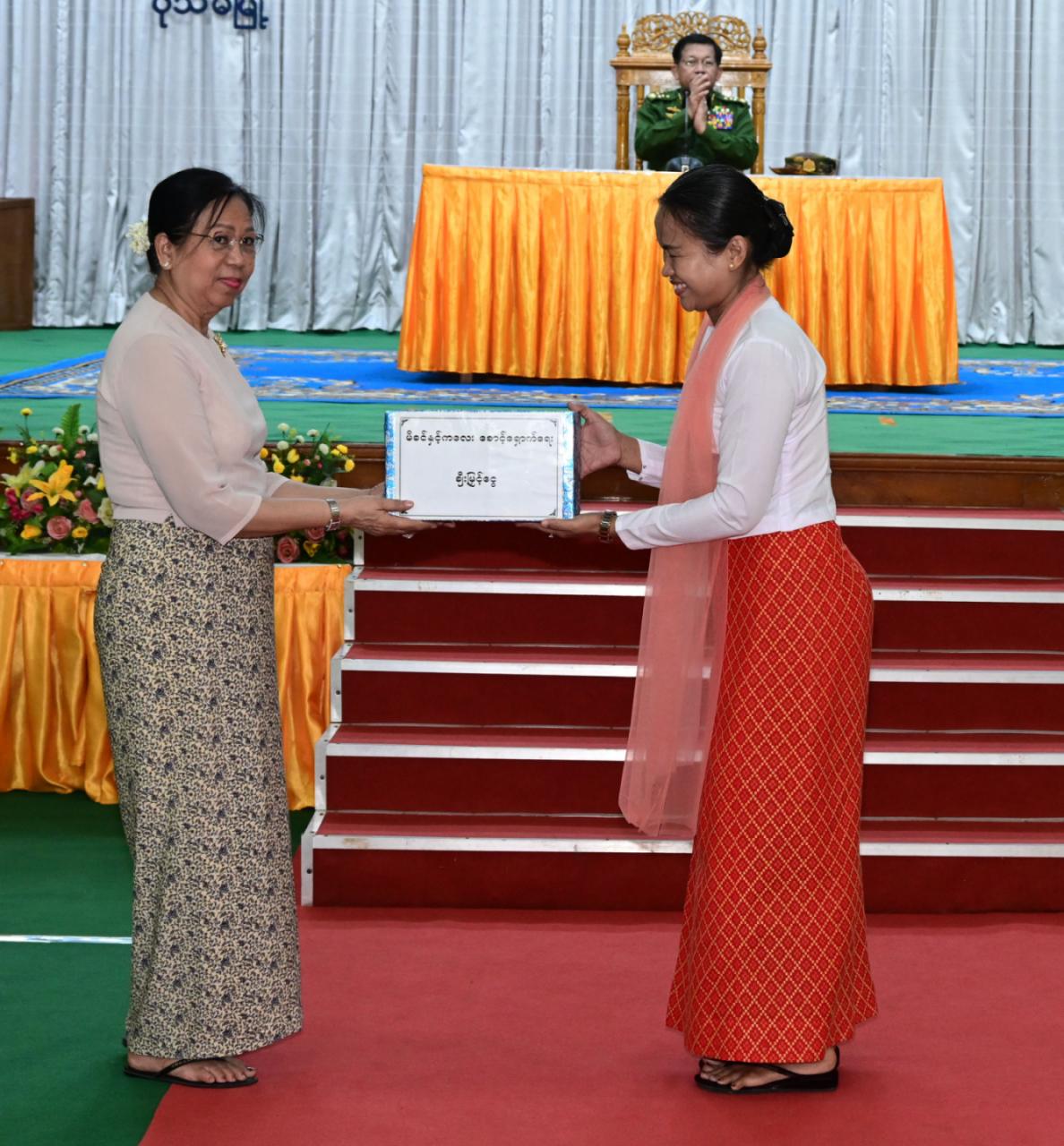 ထို့နောက် နိုင်ငံတော်လုံခြုံရေးနှင့် အေးချမ်းသာယာရေးကော်မရှင် ဥက္ကဋ္ဌ တပ်မတော်ကာကွယ်ရေးဦးစီးချုပ်က တပ်နယ်မှ အရာရှိ၊ စစ်သည်၊ မိသားစုများ အတွက် စားသောက်ဖွယ်ရာများကိုပေးအပ်ရာ တိုင်းမှူးကလည်းကောင်း၊ နိုင်ငံတော် လုံခြုံရေးနှင့် အေးချမ်းသာယာရေးကော်မရှင် ဥက္ကဋ္ဌ တပ်မတော်ကာကွယ်ရေး ဦးစီးချုပ်၏ဇနီးကတပ်နယ်မိခင်နှင့်ကလေးစောင့်ရှောက်ရေးအသင်းအတွက် ချီးမြှင့်ငွေ များကို ပေးအပ်ရာတိုင်းမှူး၏ ဇနီးကလည်းကောင်း အသီးသီးလက်ခံရယူကြသည်။