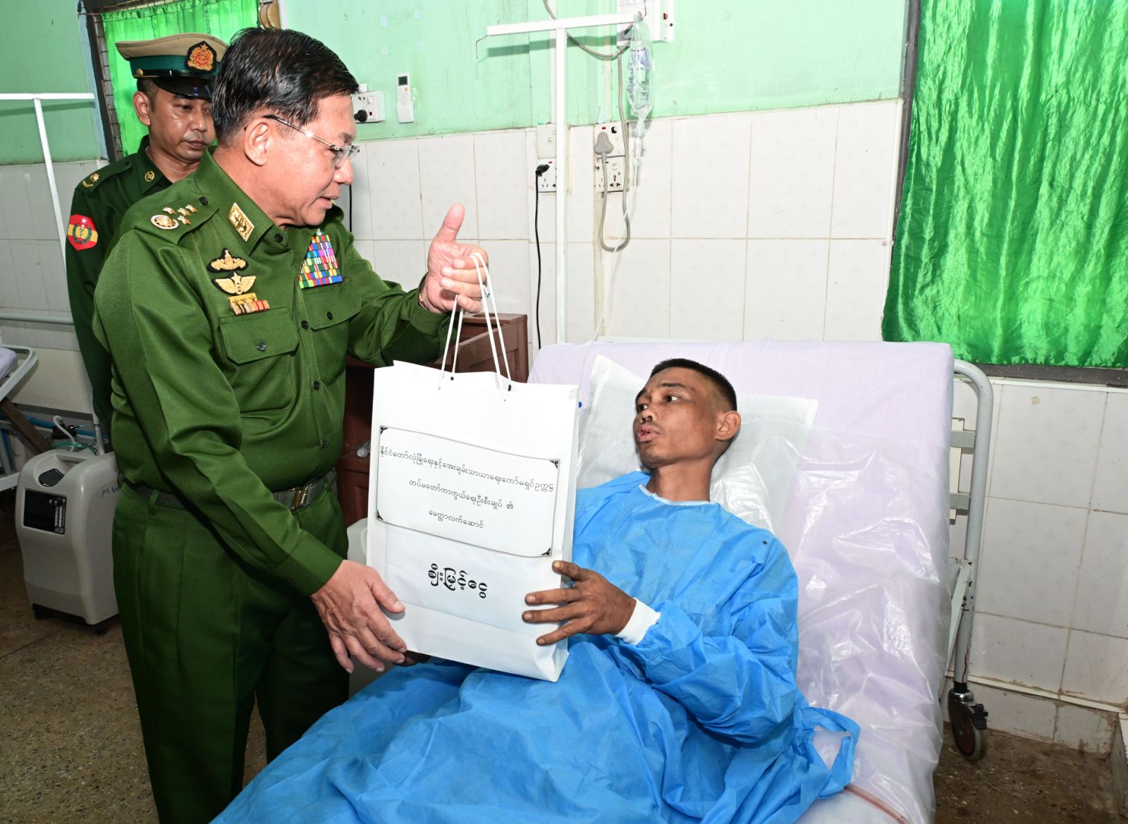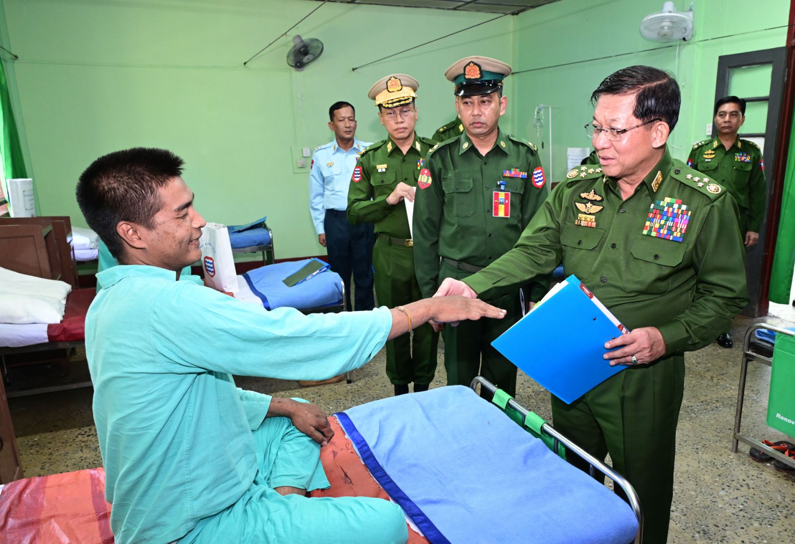 ယင်းနောက် နိုင်ငံတော်လုံခြုံရေးနှင့် အေးချမ်းသာယာရေးကော်မရှင် ဥက္ကဋ္ဌ တပ်မတော်ကာကွယ်ရေးဦးစီးချုပ်သည် တပ်နယ်ရှိ နယ်မြေခံတပ်မတော် ဆေးရုံတွင် တက်ရောက်ကုလျက်ရှိသည့် နိုင်ငံတော်ကာကွယ်ရေးနှင့် လုံခြုံရေးတာဝန်များ ထမ်းဆောင်စဉ် ထိခိုက်ဒဏ်ရာရရှိခဲ့သော အရာရှိ၊ စစ်သည်များအား ထိခိုက်ဒဏ်ရာ ရရှိခဲ့မှု အခြေအနေများ၊ ရောဂါကုသပျောက်ကင်းမှု အခြေအနေများကို တစ်ဦးချင်း လိုက်လံတွေ့ဆုံ၍ ရင်းနှီးနွေးထွေးစွာမေးမြန်းပြီး အားပေးစကားပြောကြားကာ အရာရှိ၊စစ်သည်များ၏ တင်ပြချက်များအပေါ် လိုအပ်သည်များ ဖြည့်ဆည်းဆောင်ရွက် ပေးသည်။