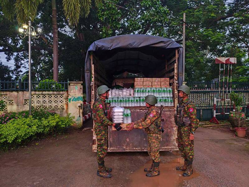 ယင်းသို့ စုပေါင်းသန့်ရှင်းရေးလုပ်ငန်းများ ဆောင်ရွက်လျက်ရှိသော တပ်မတော် သားများ၊ မြန်မာနိုင်ငံရဲတပ်ဖွဲ့ ဝင်များ၊ မီးသတ်တပ်ဖွဲ့ဝင်များ၊ ဌာနဆိုင်ရာဝန်ထမ်းများနှင့် ဒေသခံပြည်သူများအတွက် အလှူရှင်များက လှူဒါန်းသော ဒံပေါက်၊ ရေသန့်ဘူးများနှင့် အချိုရည်များကို တာဝန်ရှိသူများက လက်ဝယ်အရောက် ပေးအပ် လှူဒါန်းပေးကြသည်။