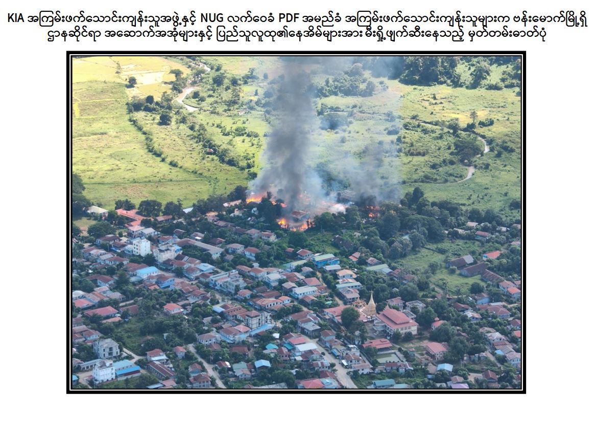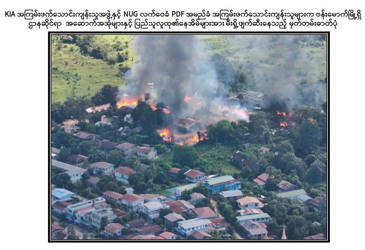 ထိုသို့ တပ်မတော်စစ်ကြောင်းများက ဗန်းမောက်မြို့အား ပြန်လည်သိမ်းပိုက် ရရှိရေးအတွက် နယ်မြေလုံခြုံရေးလုပ်ငန်းများကို စနစ်တကျ စုဖွဲ့ချီတက်ရှင်းလင်း မှုများ ဆောင်ရွက်လျက်ရှိရာ အောက်တိုဘာ ၂၆ ရက်တွင် ဗန်းမောက်မြို့၏ အနောက်ဘက်နှင့် အနောက်မြောက်ဘက်မီတာ ၂၀၀၀ ခန့်အကွာသို့ ရောက်ရှိစဉ် KIA အကြမ်းဖက်သောင်းကျန်းသူအဖွဲ့နှင့် NUG လက်ဝေခံ PDF အမည်ခံအကြမ်းဖက် သောင်းကျန်းသူများက ဗန်းမောက်မြို့အတွင်းရှိ ပြည်သူပိုင်နေအိမ်အဆောက်အအုံ များ၊ ဌာနဆိုင်ရာ အဆောက်အအုံများအား မီးရှို့ဖျက်ဆီးနေကြောင်း မျက်မြင်တွေ့ရှိရ သည်။