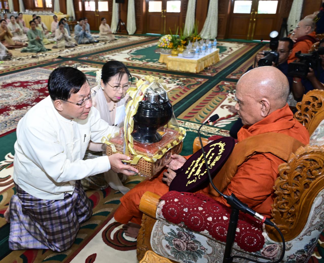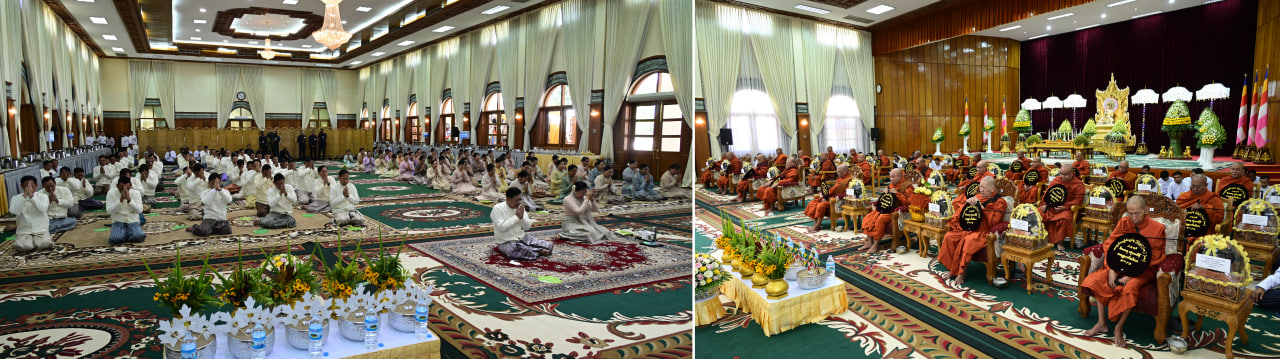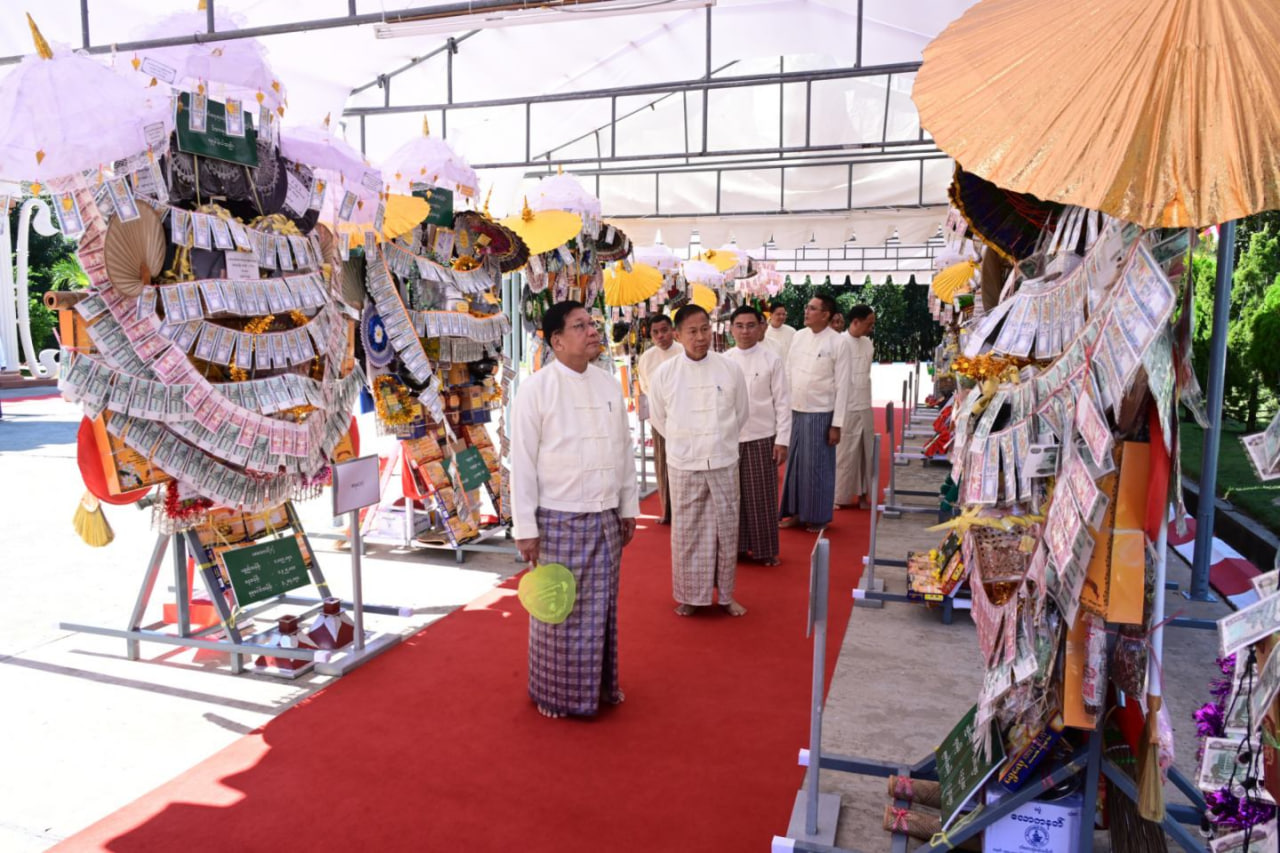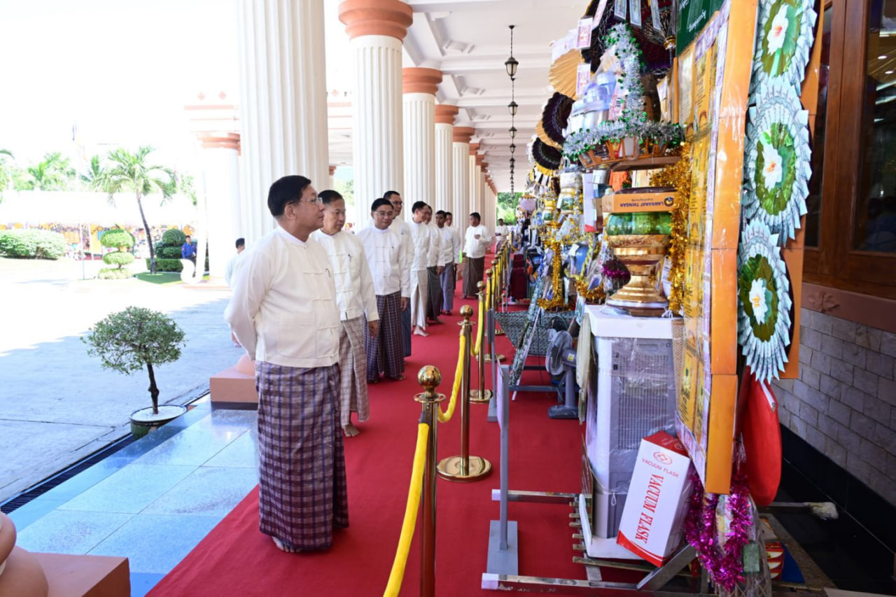 ဦးစွာ နိုင်ငံတော်လုံခြုံရေးနှင့် အေးချမ်းသာယာရေးကော်မရှင်ဥက္ကဋ္ဌ တပ်မတော် ကာကွယ်ရေးဦးစီးချုပ်နှင့်ဇနီး၊ ဧည့်ပရိသတ်များသည် ဘုန်းတော်ကြီးကျောင်း အသီး သီးသို့ လှူဒါန်းရန် ခင်းကျင်းပြင်ဆင်ထားသည့် ကထိန်လျာသင်္ကန်း၊ လှူဖွယ်ပစ္စည်း များနှင့် ပဒေသာပင်များအား လှည့်လည်ကြည့်ရှုကြသည်။ ထို့နောက် နိုင်ငံတော် လုံခြုံရေးနှင့် အေးချမ်းသာယာရေး ကော်မရှင်ဥက္ကဋ္ဌ တပ်မတော်ကာကွယ်ရေးဦးစီး ချုပ်သည် အနော်ရထာခန်းမအတွင်းရှိ ဗုဒ္ဓရုပ်ပွားတော်မြတ်အား ဖူးမြော်ကြည်ညို၍ မြသပိတ်ဆွမ်းတော်နှင့် ပန်း၊ သောက်တော်ရေချမ်း၊ ဆီမီး၊ သစ်သီးတို့ကို ဆက်ကပ် လှူဒါန်းသည်။