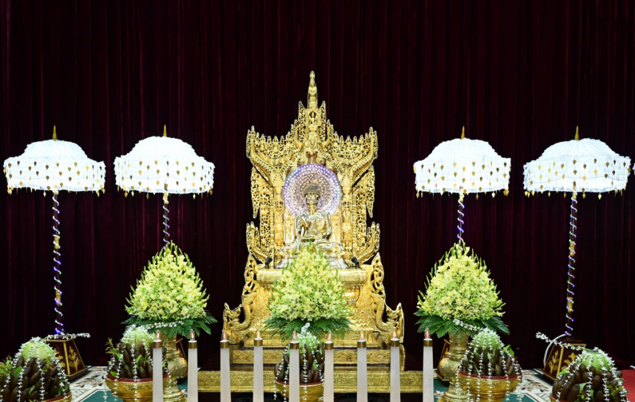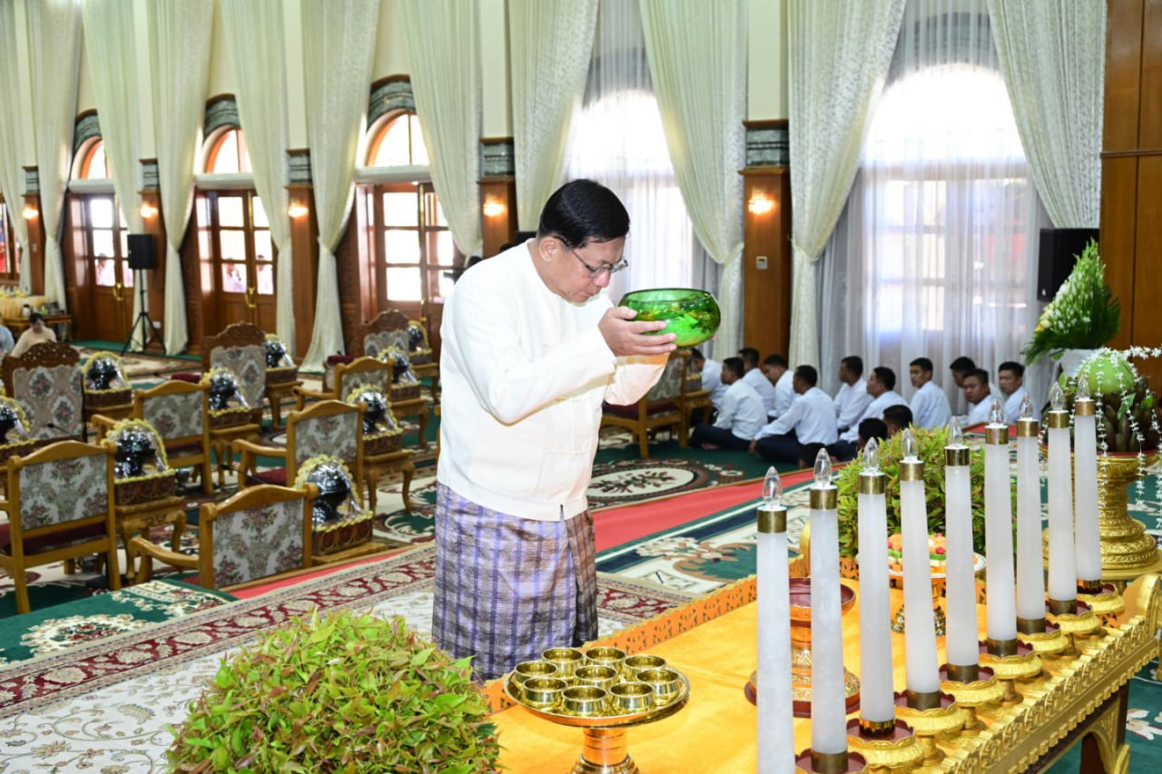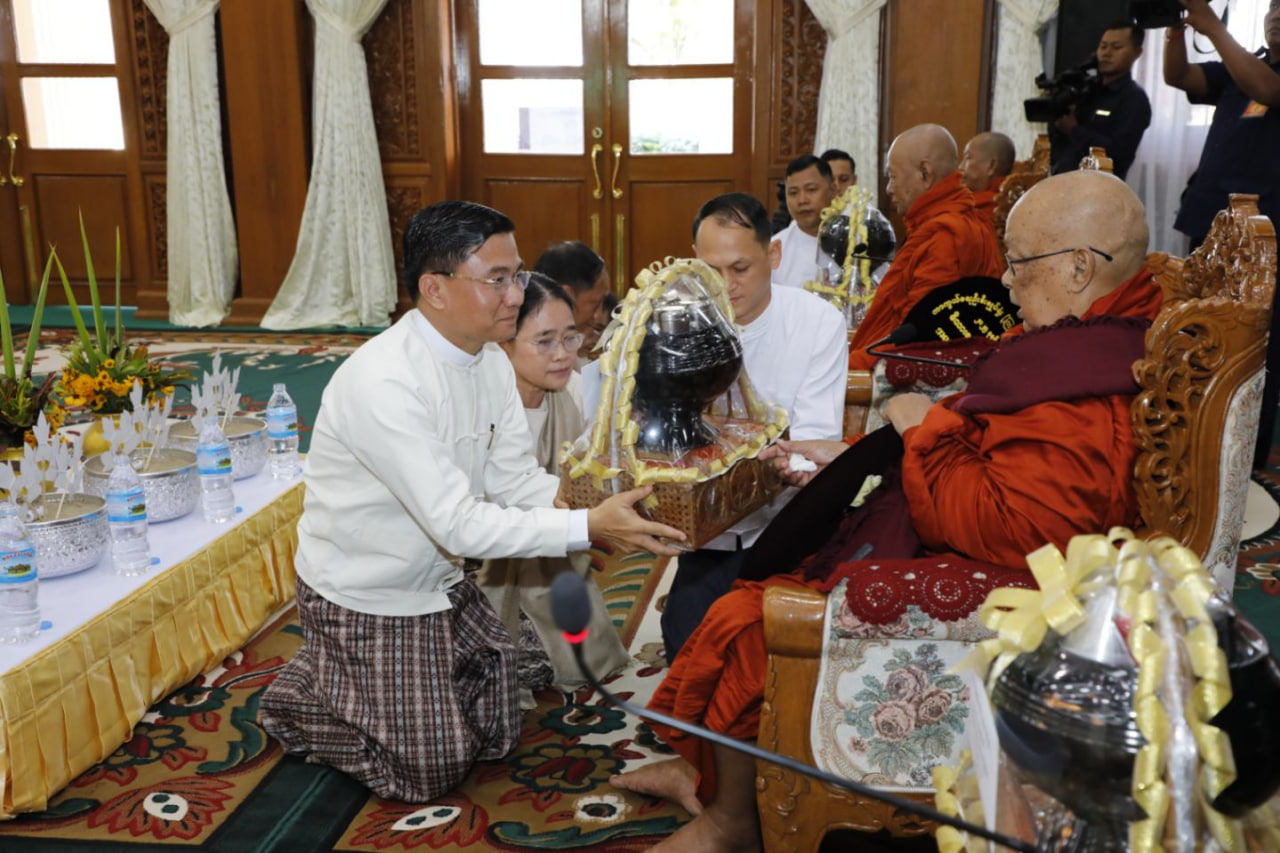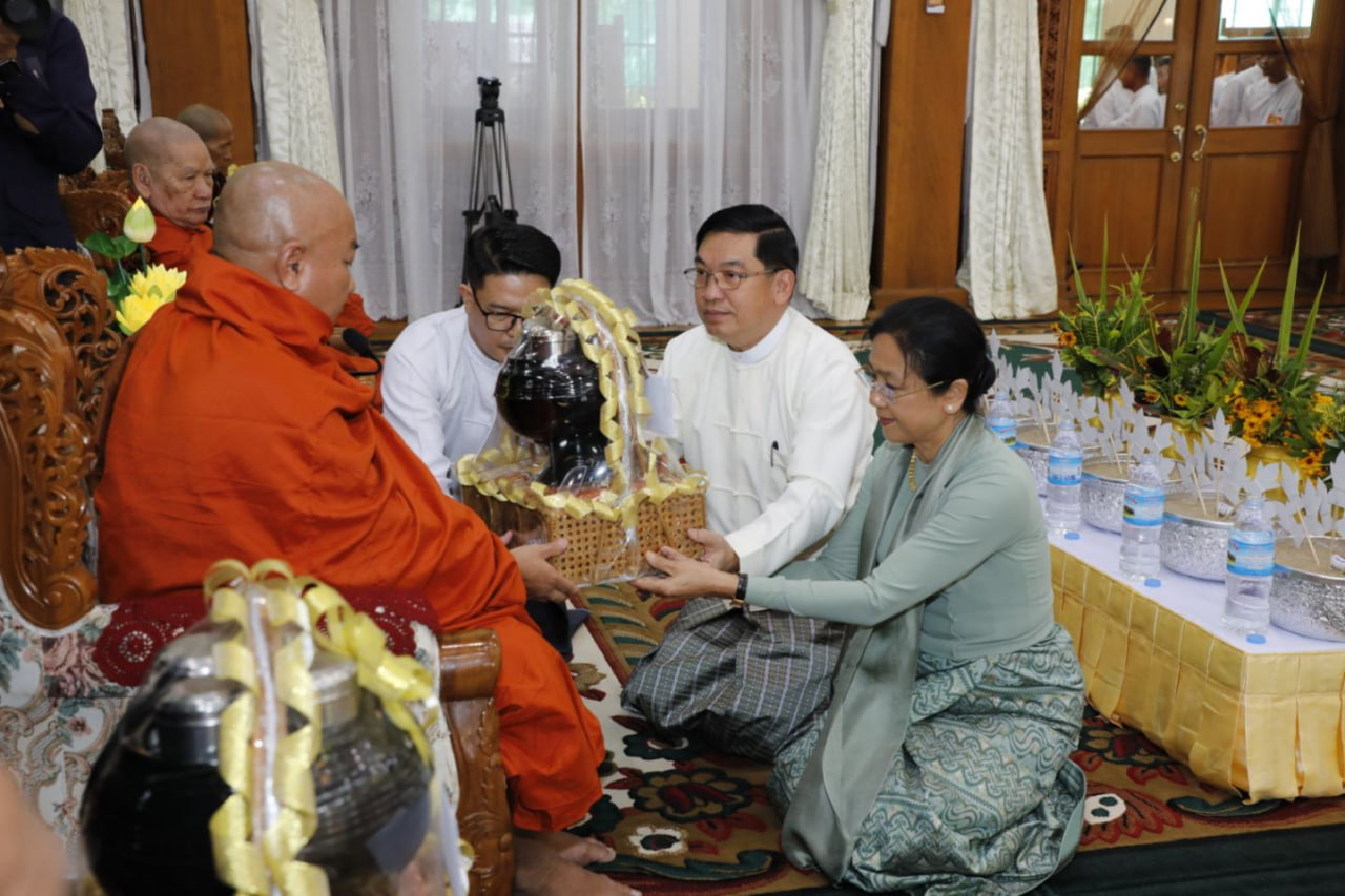 ဦးစွာ နိုင်ငံတော်လုံခြုံရေးနှင့် အေးချမ်းသာယာရေးကော်မရှင်ဥက္ကဋ္ဌ တပ်မတော် ကာကွယ်ရေးဦးစီးချုပ်နှင့်ဇနီး၊ ဧည့်ပရိသတ်များသည် ဘုန်းတော်ကြီးကျောင်း အသီး သီးသို့ လှူဒါန်းရန် ခင်းကျင်းပြင်ဆင်ထားသည့် ကထိန်လျာသင်္ကန်း၊ လှူဖွယ်ပစ္စည်း များနှင့် ပဒေသာပင်များအား လှည့်လည်ကြည့်ရှုကြသည်။ ထို့နောက် နိုင်ငံတော် လုံခြုံရေးနှင့် အေးချမ်းသာယာရေး ကော်မရှင်ဥက္ကဋ္ဌ တပ်မတော်ကာကွယ်ရေးဦးစီး ချုပ်သည် အနော်ရထာခန်းမအတွင်းရှိ ဗုဒ္ဓရုပ်ပွားတော်မြတ်အား ဖူးမြော်ကြည်ညို၍ မြသပိတ်ဆွမ်းတော်နှင့် ပန်း၊ သောက်တော်ရေချမ်း၊ ဆီမီး၊ သစ်သီးတို့ကို ဆက်ကပ် လှူဒါန်းသည်။
