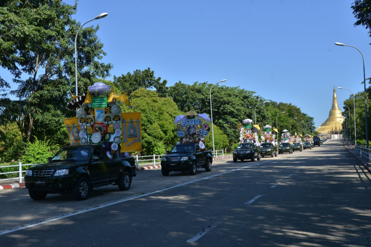 ကာကွယ်ရေးဦးစီးချုပ်ရုံး (ကြည်း၊ ရေ၊ လေ) မိသားစုများ၏ ၂၀၂၅ ခုနှစ် မိသားစု မဟာဘုံကထိန်အလှူတော်အဖြစ် လှူဒါန်းထားသည့် ပဒေသာပင်များအား အောက်တိုဘာ ၂၇ ရက်တွင် ကာကွယ်ရေးဦးစီးချုပ်ရုံး(ကြည်း)ဝန်းအတွင်းရှိ အနော်ရထာခန်းမမှ ဥပ္ပါတသန္တိစေတီတော်မြတ်ကြီးသို့ မော်တော်ယာဉ်များဖြင့် လှည့်လည်ခဲ့သည်။