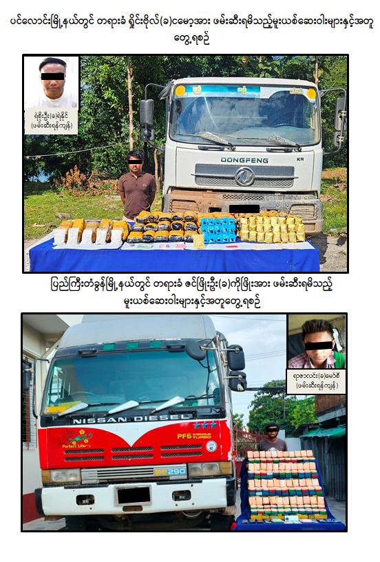 မူးယစ်ဆေးဝါးတားဆီးနှိမ်နင်းရေးရဲတပ်ဖွဲ့မှ တပ်ဖွဲ့ဝင်များပါဝင်သော ပူးပေါင်းအဖွဲ့သည် အောက်တိုဘာလ ၂၃ ရက်နေ့ ညနေ ၄ နာရီခွဲအချိန် သတင်းအရ ပင်လောင်းမြို့နယ်၊ လိန်းလီ ကျေးရွာအနီးတွင် ရှိုင်းဗိုလ်(ခ)ငမော့ မောင်းနှင်လာသော DONGFENG မော်တော်ယာဉ်ပေါ်မှ ဘိန်းဆီခဲ ၇၄ ကီလို၊ စိတ်ပြောင်းဆေးဝါးများဖြစ်သည့် HAPPY WATER ၉ ကီလို၊ အက်တက်စီ ဆေးပြား ၁,၀၀၀ ပြား၊ ကက်တမင်း ၁၁ ဒသမ ၂ ကီလို၊ စိတ်ကြွရူးသွပ်ဆေးပြား ၁ ဒသမ ၁၄ သိန်းတို့အား ဖမ်းဆီးရမိခဲ့ကြောင်း၊ သတင်းကွင်းဆက်အရ အောက်တိုဘာလ ၂၄ ရက်နေ့ မွန်းလွဲ ၂ နာရီခွဲအချိန် ပြည်ကြီးတံခွန်မြို့နယ်၊ (ည)ရပ်ကွက်၊ ၅၅ x ၅၆ လမ်းကြားနှင့် ၁၄၁ x ၁၄၂ လမ်းကြား တွင် ဇင်ဖြိုးဦး(ခ)ကိုဖြိုးအား NISSAN ၁၂ ဘီး မော်တော်ယာဉ်ပေါ်မှ ဘိန်းဖြူ ၆ ဒသမ ၁၇ ကီလို၊ စိတ်ပြောင်းဆေးဝါးများဖြစ်သည့် HAPPY WATER ၇၇၅ ဂရမ်တို့နှင့်အတူ ဖမ်းဆီးရမိခဲ့သဖြင့် စုစုပေါင်းဘိန်းဖြူ ၆ ဒသမ ၁၇ ကီလို (၎င်းဒေသတန်ဖိုးငွေကျပ် ၁,၅၄၂ ဒသမ ၅ သိန်း)၊ ဘိန်းဆီခဲ ၇၄ ကီလို (၎င်းဒေသတန်ဖိုးငွေကျပ် သိန်း ၁,၄၈၀)၊ စိတ်ပြောင်းဆေးဝါးများဖြစ်သည့် HAPPY WATER ၉ ဒသမ ၇၇၅ ကီလို (၎င်းဒေသတန်ဖိုး ငွေကျပ်သိန်း ၆၃၃၀)၊ အက်တက်စီဆေးပြား ၁,၀၀၀ ပြား (၎င်းဒေသတန်ဖိုးငွေကျပ်သိန်း ၄၅၀)၊ ကက်တမင်း ၁၁ ဒသမ ၂ ကီလို (၎င်းဒေသ တန်ဖိုးငွေကျပ်သိန်း ၁,၁၂၀)၊ စိတ်ကြွရူးသွပ်ဆေးပြား ၁ ဒသမ ၁၄ သိန်း(၎င်းဒေသတန်ဖိုးငွေ ကျပ်သိန်း ၅၇၀)၊ (စုစုပေါင်းတန်ဖိုးငွေကျပ် ၁ ဒသမ ၁၄၉၂၅ ဘီလီယံ) ဖမ်းဆီးရမိခဲ့ပါကြောင်း၊