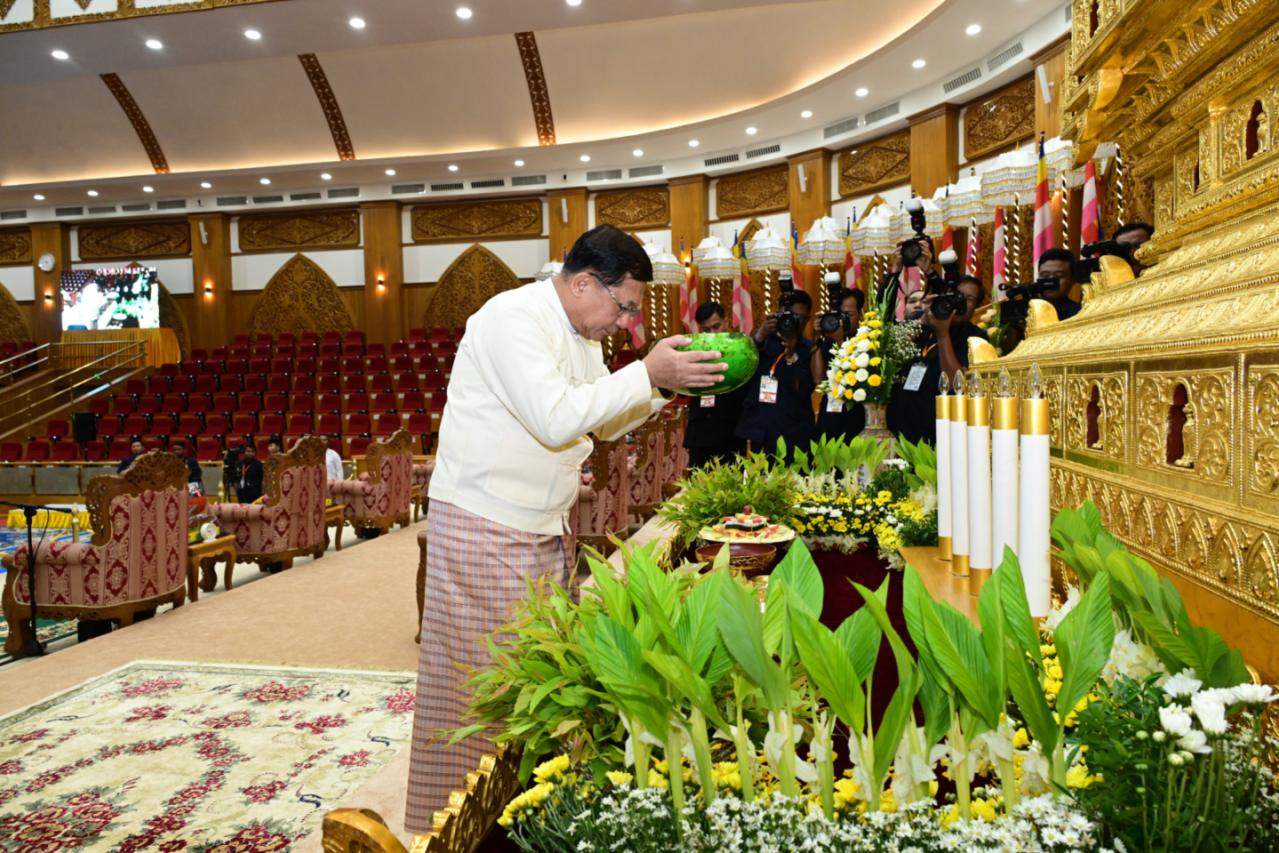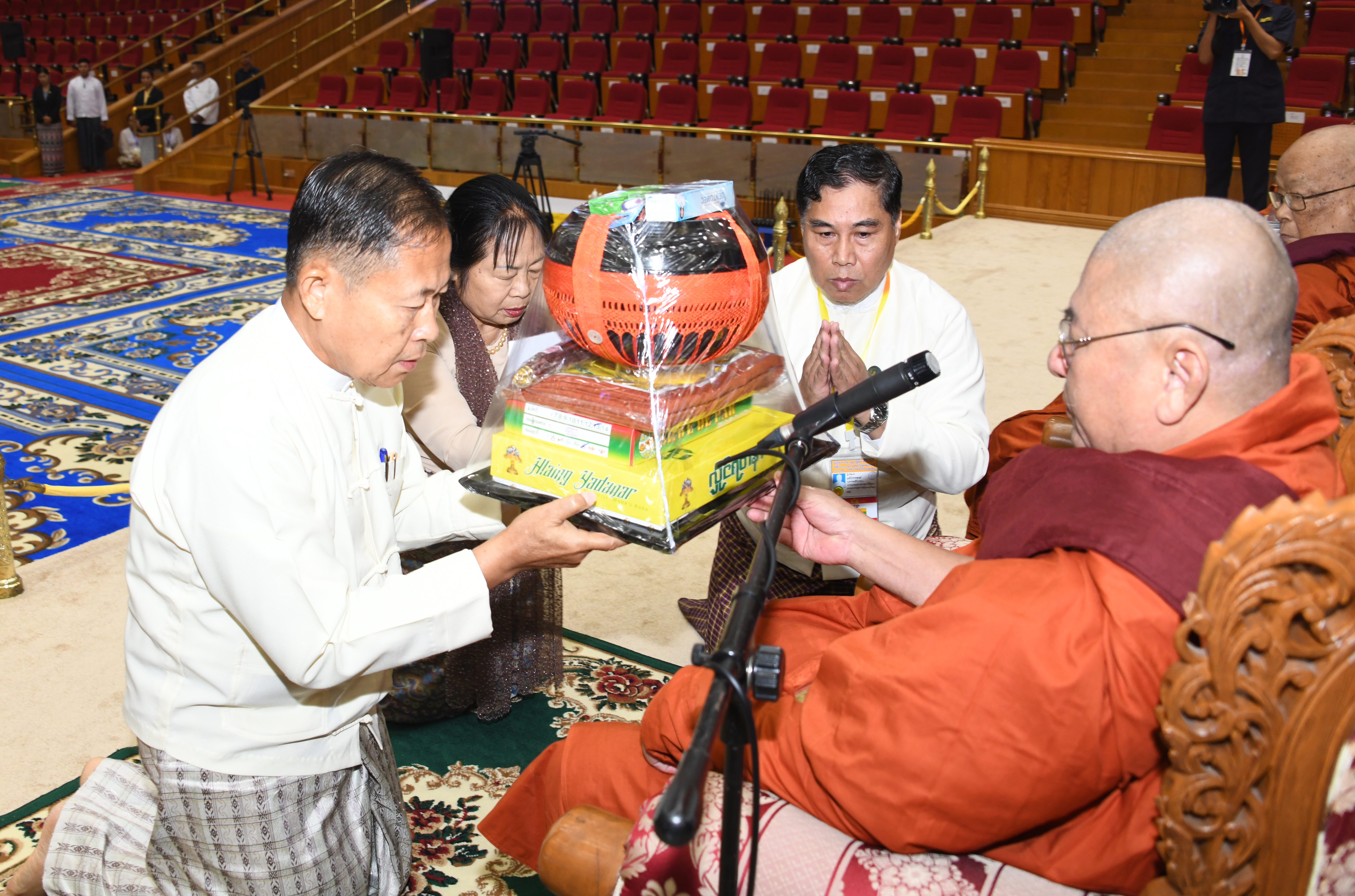 ဦးစွာ နိုင်ငံတော်ယာယီသမ္မတ နိုင်ငံတော်လုံခြုံရေးနှင့် အေးချမ်းသာယာရေး ကော်မရှင်ဥက္ကဋ္ဌ သည် အဂ္ဂါဓိပတိ သာသနာ့ဗိမာန်တော်ကြီးအတွင်းရှိ မာရဝိဇယ နောင်တော်ကြီး ဗုဒ္ဓရုပ်ပွားတော်မြတ်အား ဖူးမြော်ကြည်ညို၍ မြသပိတ်ဆွမ်းတော်၊ ပန်း၊ ရေချမ်း၊ ဆီမီးနှင့် သစ်သီး တို့ကို ဆက်ကပ်လှူဒါန်းသည်။