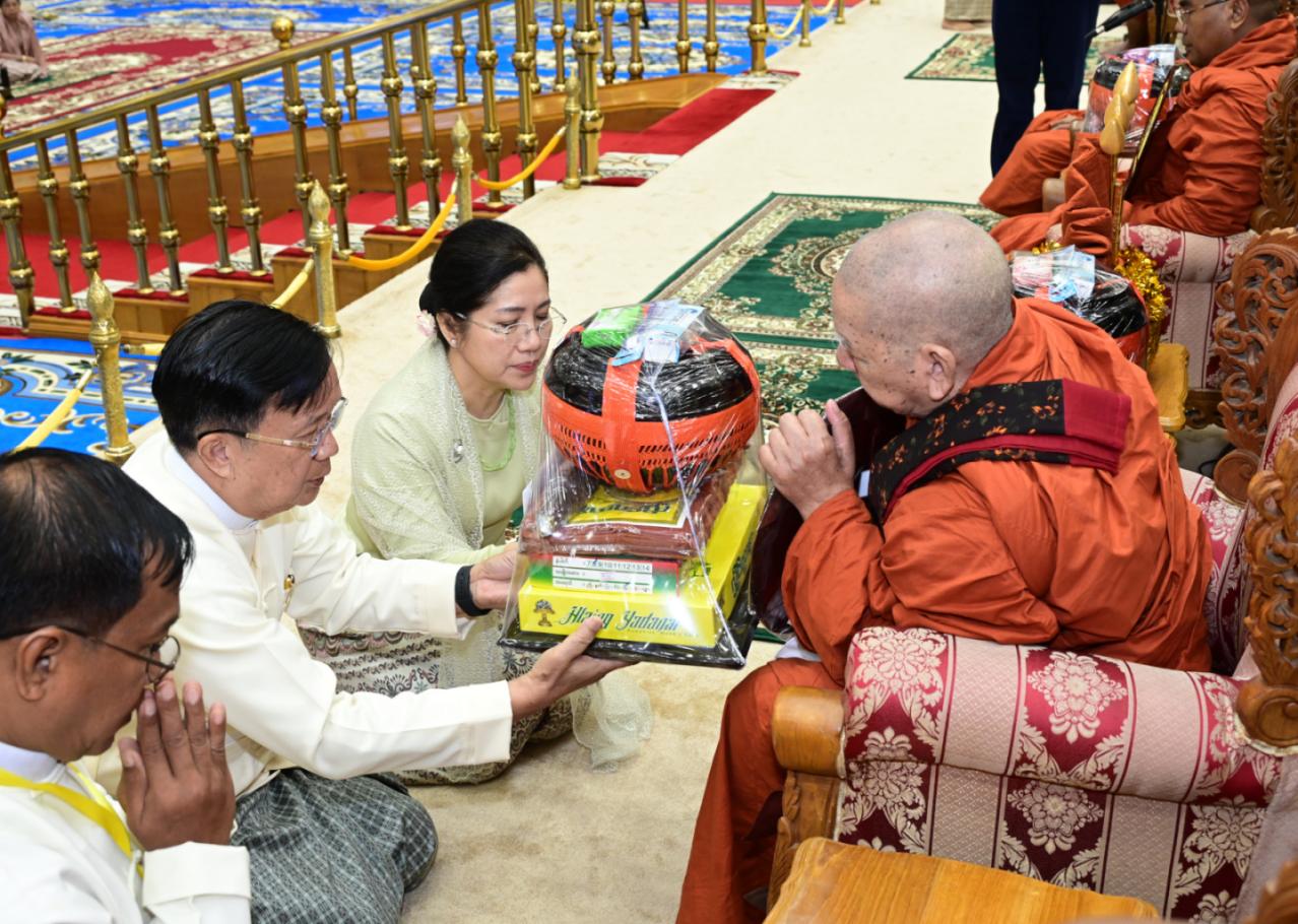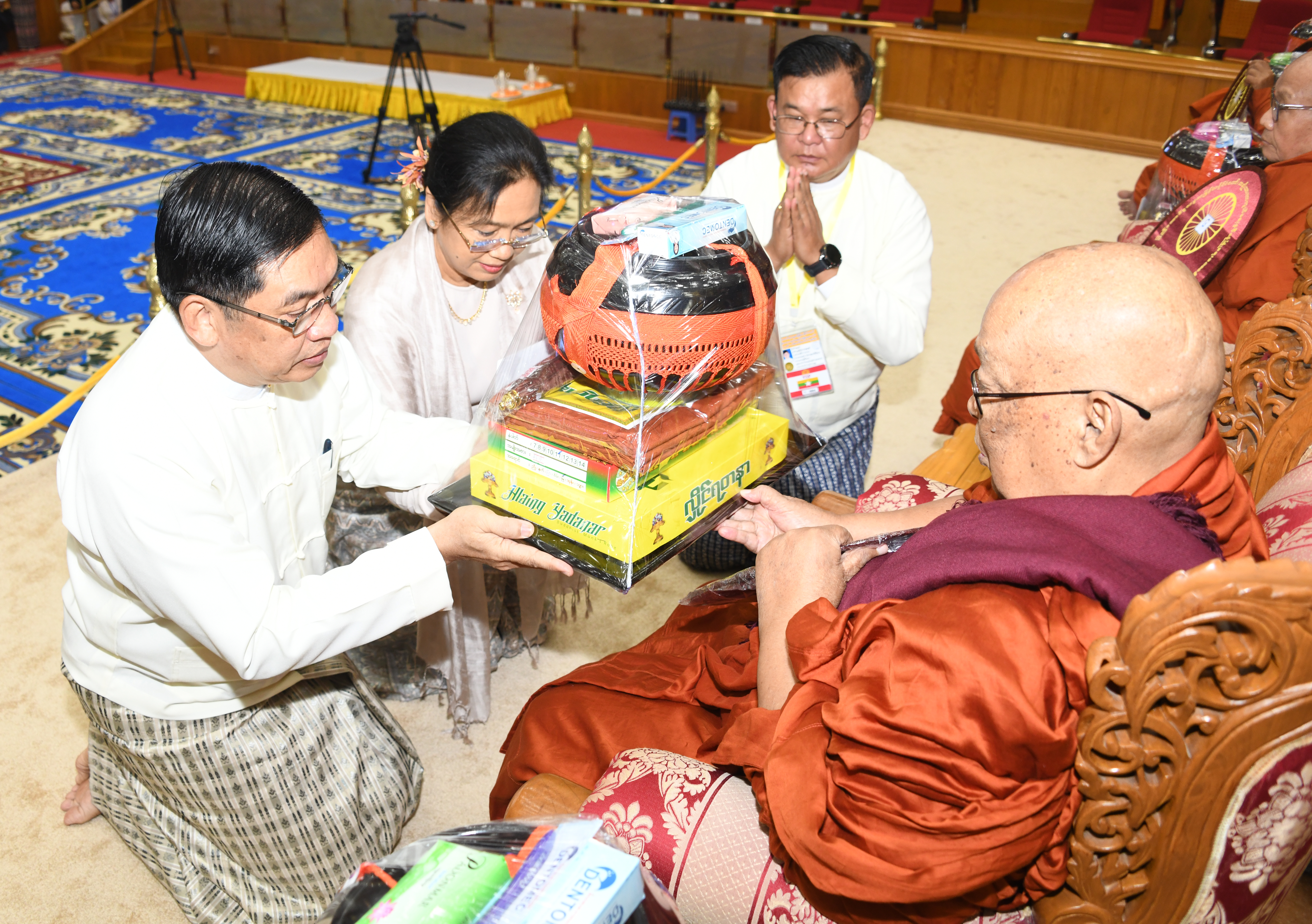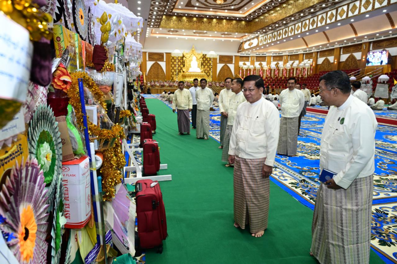 ထို့နောက် နိုင်ငံတော်ယာယီသမ္မတ နိုင်ငံတော်လုံခြုံရေးနှင့် အေးချမ်းသာယာ ရေး ကော်မရှင်ဥက္ကဋ္ဌနှင့်ဇနီးတို့သည် သန်လျင်မင်းကျောင်းဆရာတော်ကြီးထံ ကထိန် သင်္ကန်းနှင့်လှူဖွယ်ပစ္စည်းများကိုလည်းကောင်း၊ ကထိန်အလှူခံကျောင်း နေပြည် တော်၊ ပုဗ္ဗသီရိမြို့နယ်၊ စိန်ရာဇာသာသနာလင်္ကာရ စာသင်တိုက်ဆရာတော် ဘဒ္ဒန္တ ဝဇိရပါဏီလင်္ကာရာဘိဝံသ ထံ ကထိန်လျာသင်္ကန်းနှင့် လှူဖွယ်ပစ္စည်းများကို လည်း ကောင်း ဆက်ကပ်လှူဒါန်းသည်။