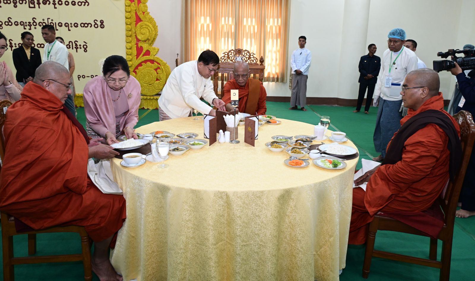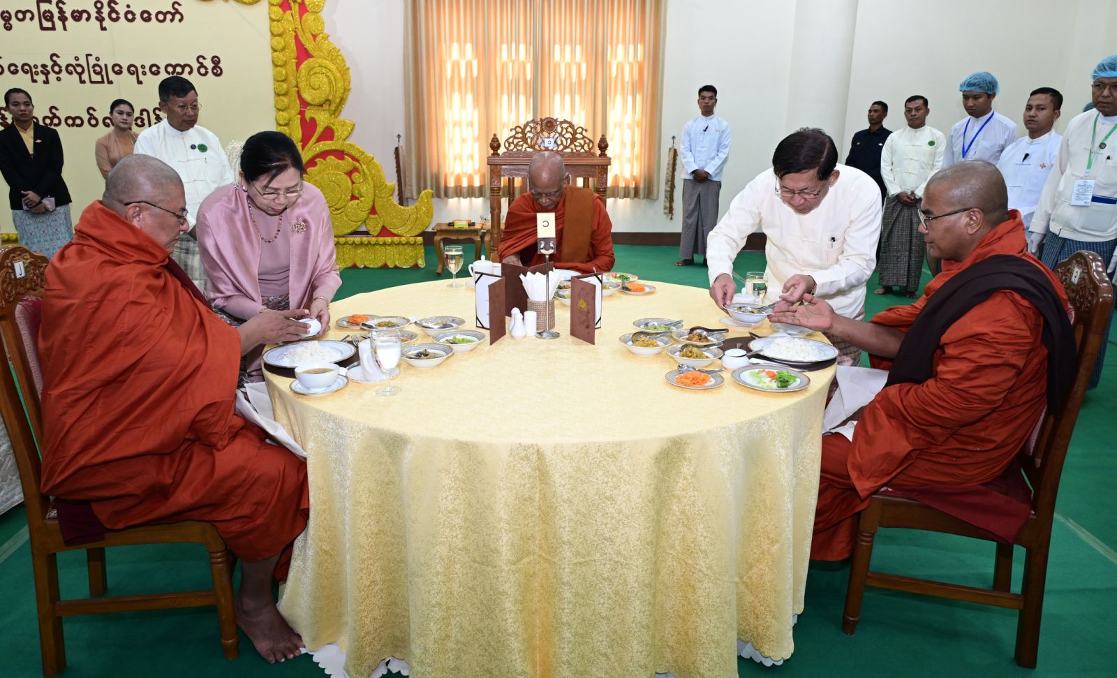 ယင်းနောက် “ဗုဒ္ဓသာသနံ စိရံ တိဋ္ဌတု” သုံးကြိမ်ရွတ်ဆိုဆုတောင်း၍ အခမ်း အနားကို ရုပ်သိမ်းလိုက်သည်။ အခမ်းအနားအပြီးတွင် သန်လျင်မင်းကျောင်း ဆရာ တော်ကြီး အမှူးပြုသည့် ဆရာတော်၊ သံဃာတော်များအား နိုင်ငံတော်ယာယီသမ္မတ နိုင်ငံတော်လုံခြုံရေးနှင့် အေးချမ်းသာယာရေးကော်မရှင်ဥက္ကဋ္ဌနှင့်ဇနီး၊ ဧည့်ပရိသတ် များက နေ့ဆွမ်းဆက်ကပ်လှူဒါန်းခဲ့သည်။