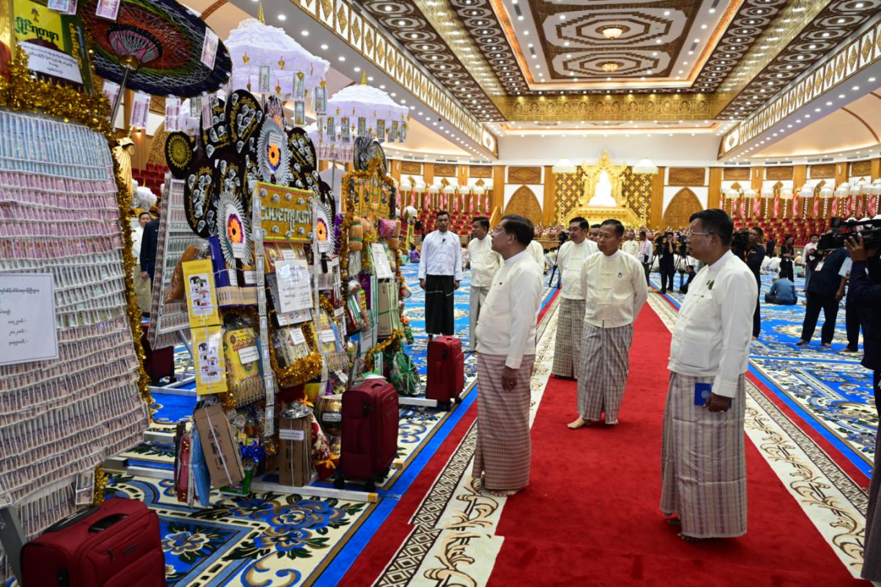 ဆက်လက်ပြီး ကော်မရှင်အဖွဲ့ဝင် နိုင်ငံတော်ဝန်ကြီးချုပ်နှင့်ဇနီး၊ ကော်မရှင် အဖွဲ့ဝင် အမှုဆောင်ချုပ်နှင့်ဇနီး၊ ကော်မရှင်အတွင်းရေးမှူး တွဲဖက်အမှုဆောင်ချုပ်နှင့် ဇနီး၊ ကော်မရှင်အဖွဲ့ဝင်များနှင့် ဇနီးများ၊ ပြည်ထောင်စုအဆင့်ပုဂ္ဂိုလ်များ၊ ပြည် ထောင်စုဝန်ကြီးများနှင့် ကာကွယ်ရေးဦးစီးချုပ်ရုံးမှ အဆင့်မြင့်တပ်မတော်အရာရှိကြီး များက ဆရာတော် သံဃာတော်များထံ ကထိန်သင်္ကန်းနှင့် လှူဖွယ်ပစ္စည်းများကို အသီးသီး ဆက်ကပ်လှူဒါန်းကြသည်။