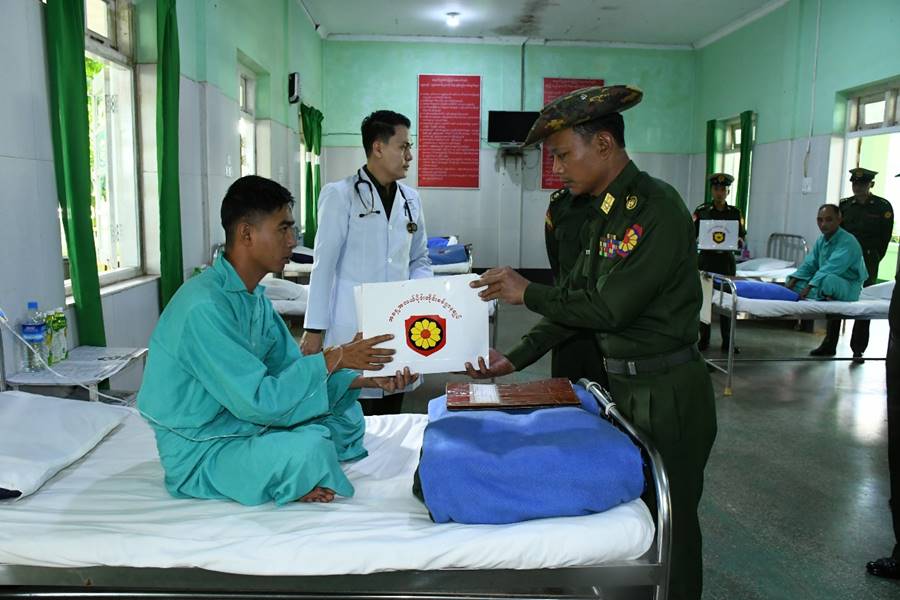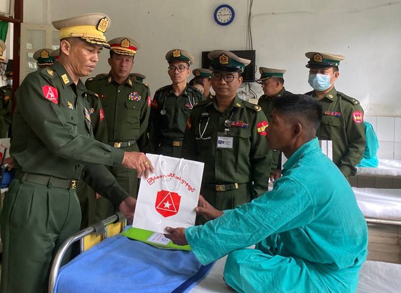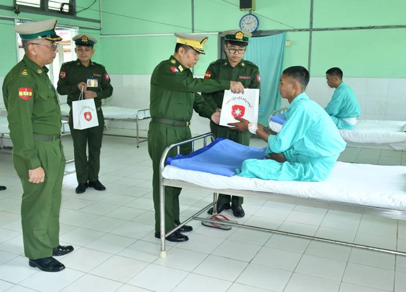 ရှမ်းပြည်နယ်(တောင်ပိုင်း)၊ အောင်ပန်းမြို့နှင့် ခိုလမ်မြို့တို့ရှိ တပ်မတော်ဆေးရုံ များ၊ ရှမ်းပြည်နယ်(အရှေ့ပိုင်း)၊ ကျိုင်းတုံမြို့ရှိ တပ်မတော်ဆေးရုံ၊ တနင်္သာရီတိုင်းဒေသကြီး၊ မြိတ်မြို့ရှိ တပ်မတော်ဆေးရုံ၊ ရန်ကုန်တိုင်းဒေသကြီး၊ မင်္ဂလာဒုံမြို့နယ်ရှိ တပ်မတော် အရိုးရောဂါ အထူးကုဆေးရုံကြီး(ခုတင်-၅၀၀)နှင့် တပ်မတော် ဆေးရုံကြီး (ခုတင်-၁၀၀၀)၊ မန္တလေးတိုင်းဒေသကြီး၊ မန္တလေးမြို့၊ နန်းမြို့တွင်းရှိ တပ်မတော်ဆေးရုံနှင့် ပဲခူးတိုင်းဒေသကြီး၊ တောင်ငူမြို့ရှိ တပ်မတော်ဆေးရုံတို့၌ တက်ရောက်ဆေးကုသမှုခံယူ လျက်ရှိသော အရာရှိ၊ စစ်သည်၊ မိသားစုဝင်များ၊ ပြည်သူ့စစ်မှုထမ်းများ၊ စစ်မှုထမ်း ဟောင်းအဖွဲ့ဝင်များ၊ မြန်မာ နိုင်ငံရဲတပ်ဖွဲ့ဝင်များ၊ ပြည်သူ့စစ်(ဌာနေ) တပ်ဖွဲ့ဝင်များနှင့် ဒေသခံ ပြည်သူများအား ယနေ့တွင် သက်ဆိုင်ရာ တိုင်းစစ်ဌာနချုပ်များမှ တိုင်းမှူးများ နှင့် တာဝန်ရှိသူများက သွားရောက်ကြည့်ရှု၍ တစ်ဦးချင်း၏ ရောဂါဖြစ်ပွားမှု၊ ဆေးဝါး ကုသပေးထားမှုနှင့် ကျန်းမာရေး တိုးတက်ကောင်းမွန်မှုအခြေအနေများကို မေးမြန်းအား ပေးစကားပြောကြားပြီး အာဟာရဖြည့်စားသောက်ဖွယ်ရာများနှင့် ချီးမြှင့်ငွေများပေး အပ်ကြသည်။