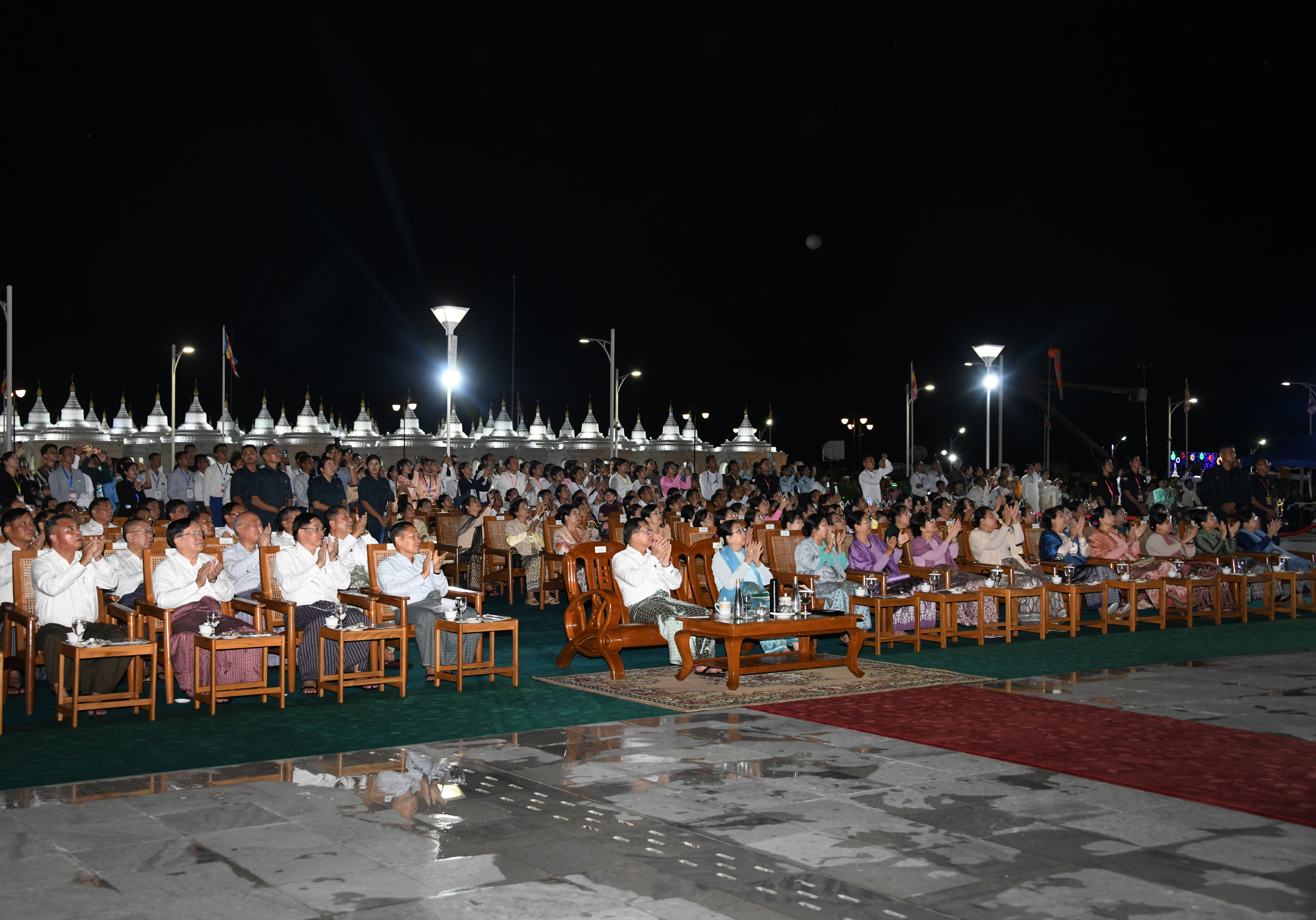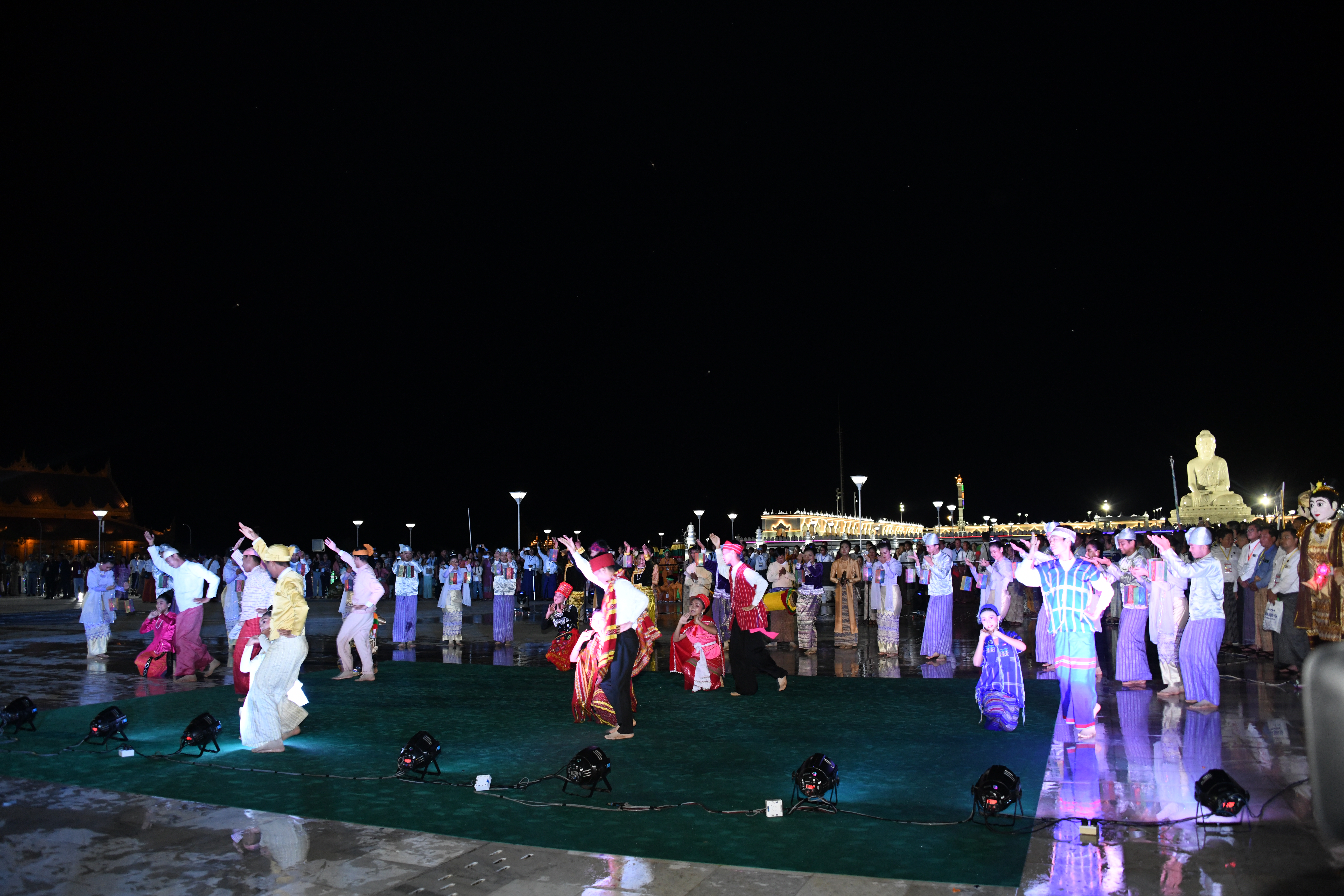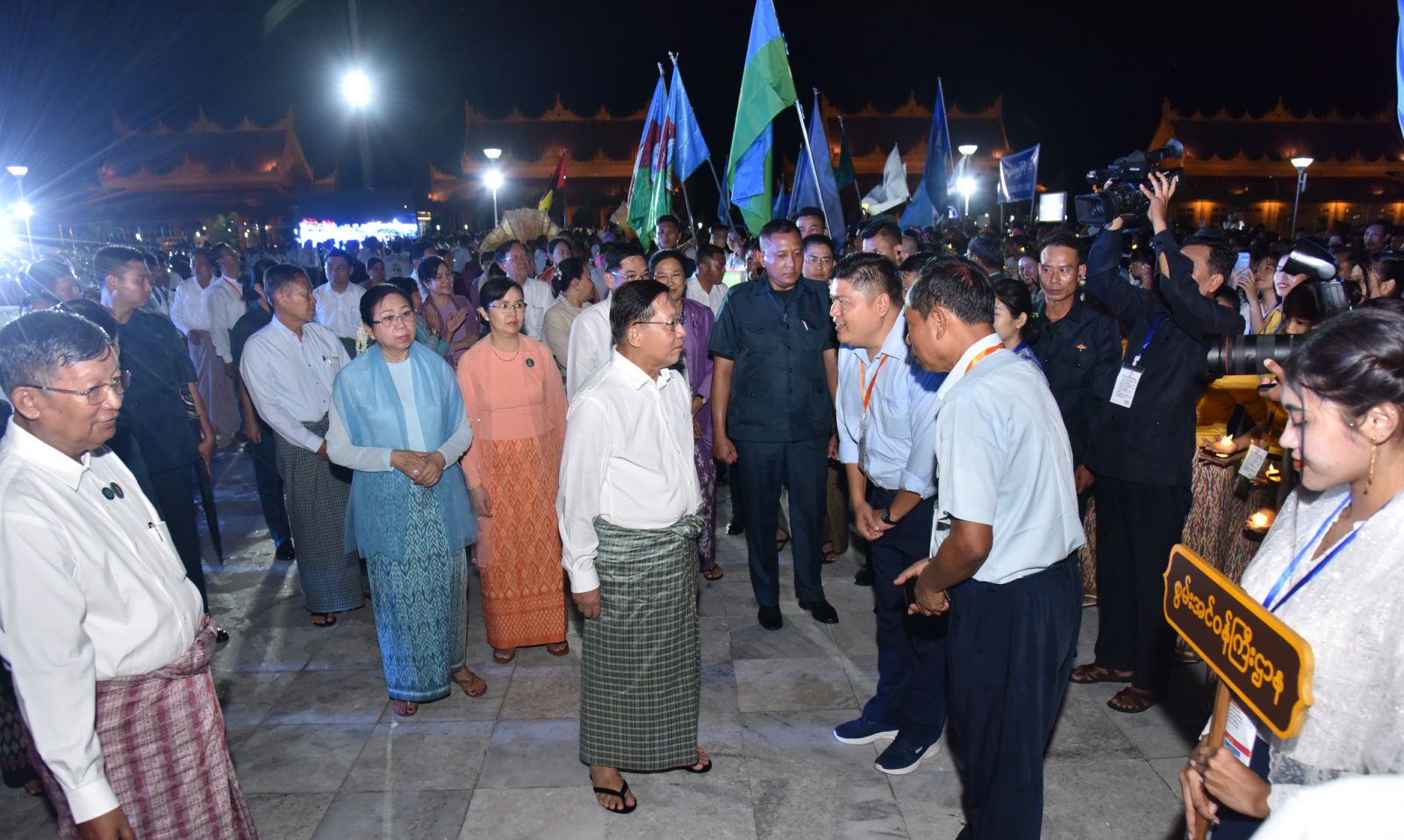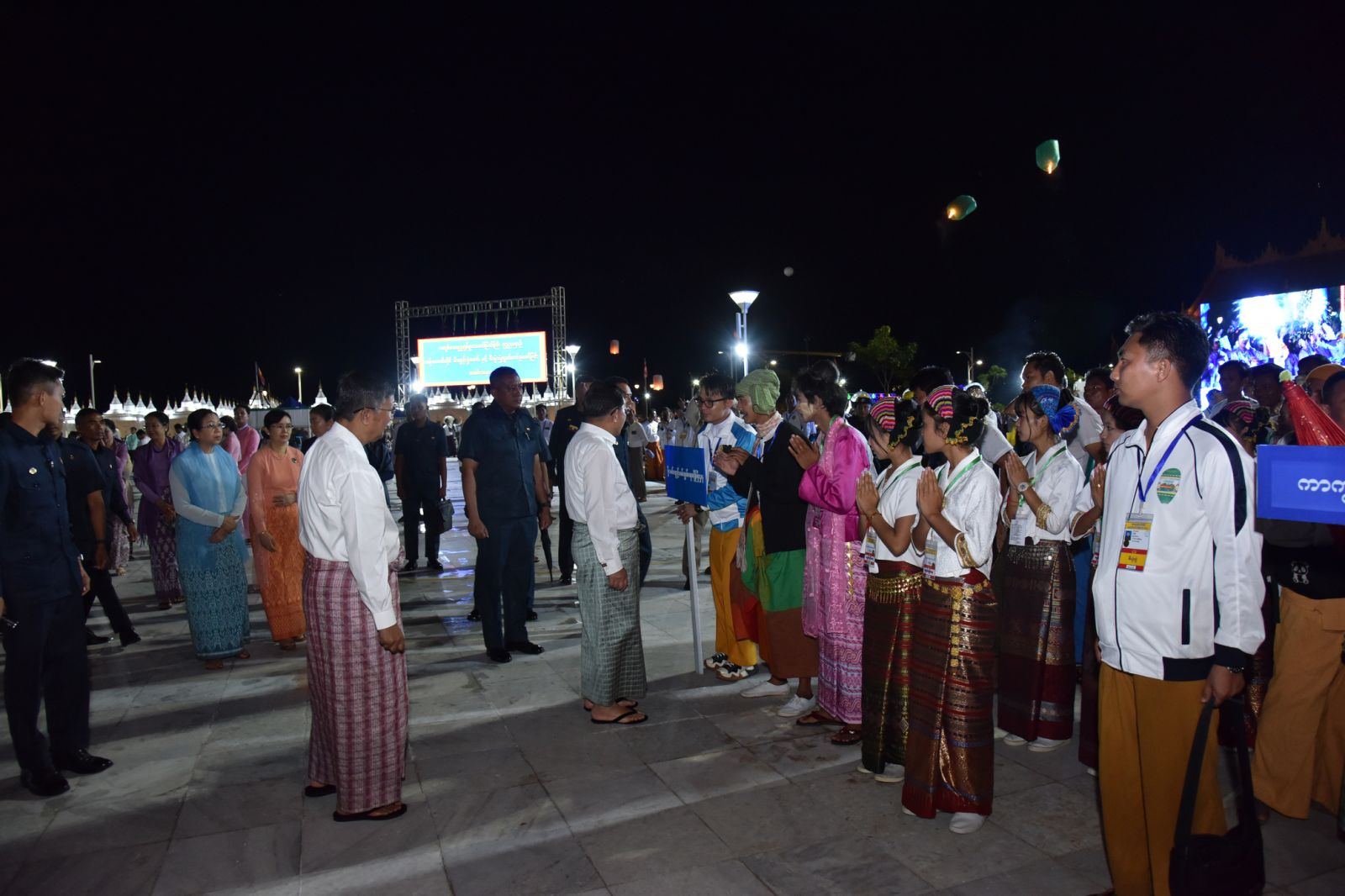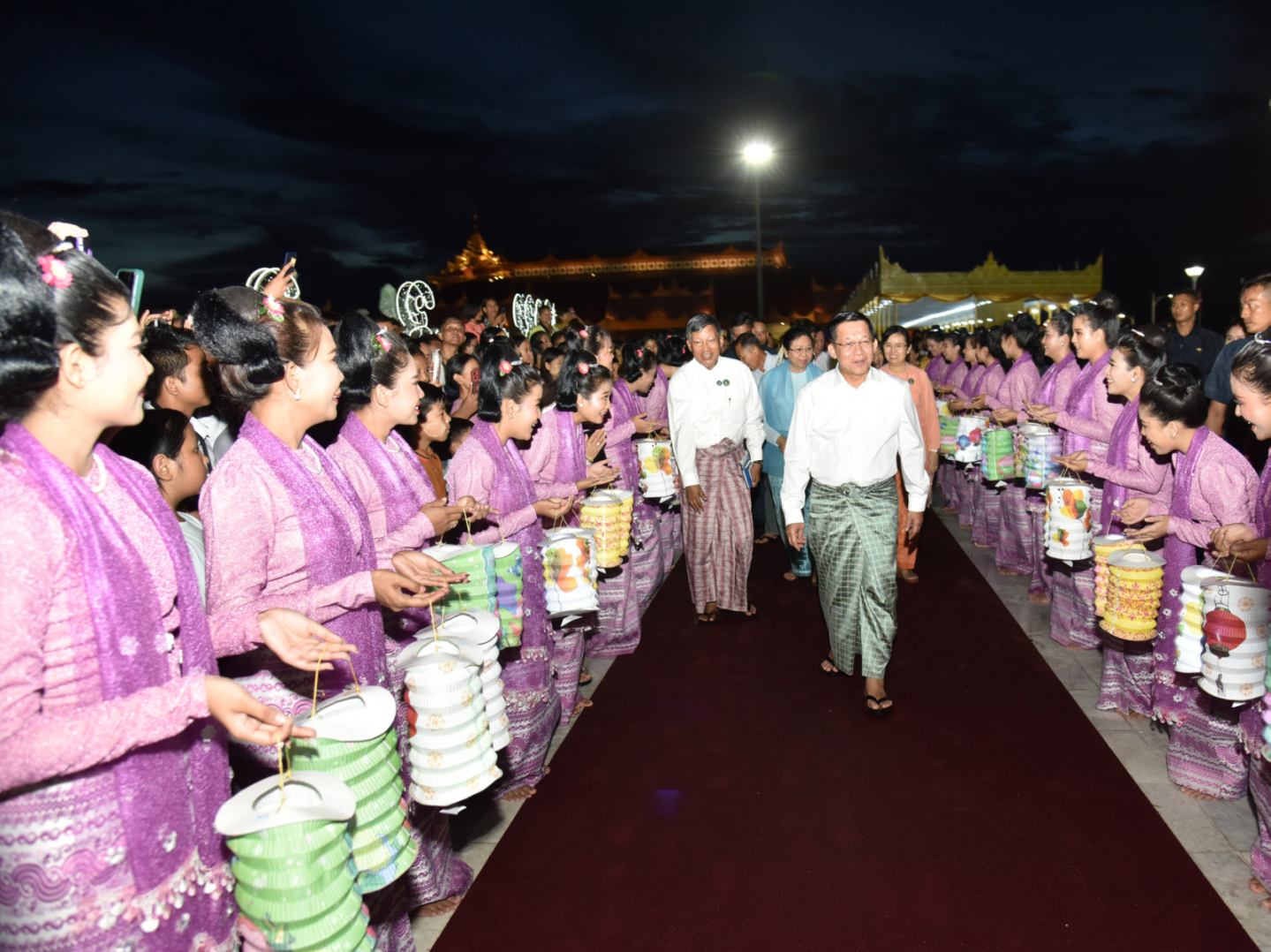 ဦးစွာ နိုင်ငံတော်ယာယီသမ္မတ နိုင်ငံတော်လုံခြုံရေးနှင့် အေးချမ်းသာယာ ရေးကော်မရှင်ဥက္ကဋ္ဌ နှင့် ဇနီးတို့သည် အခမ်းအနားကျင်းပမည့်နေရာသို့ရောက်ရှိကြရာ မြန်မာ့အသံနှင့်ရုပ်မြင်သံကြားမှ တိုင်းရင်းသား၊ တိုင်းရင်းသူများ၊ သာသနာရေးနှင့် ယဉ်ကျေးမှုဝန်ကြီးဌာန အနုပညာဦးစီးဌာနမှ ယဉ်ကျေးမှုအဖွဲ့များ၊ အနုပညာရှင်များက မြန်မာ့ရိုးရာ မီးပုံးငယ်များကို ကိုင်ဆောင်၍ လှိုက်လှဲနွေးထွေးစွာ ကြိုဆိုကြသည်။