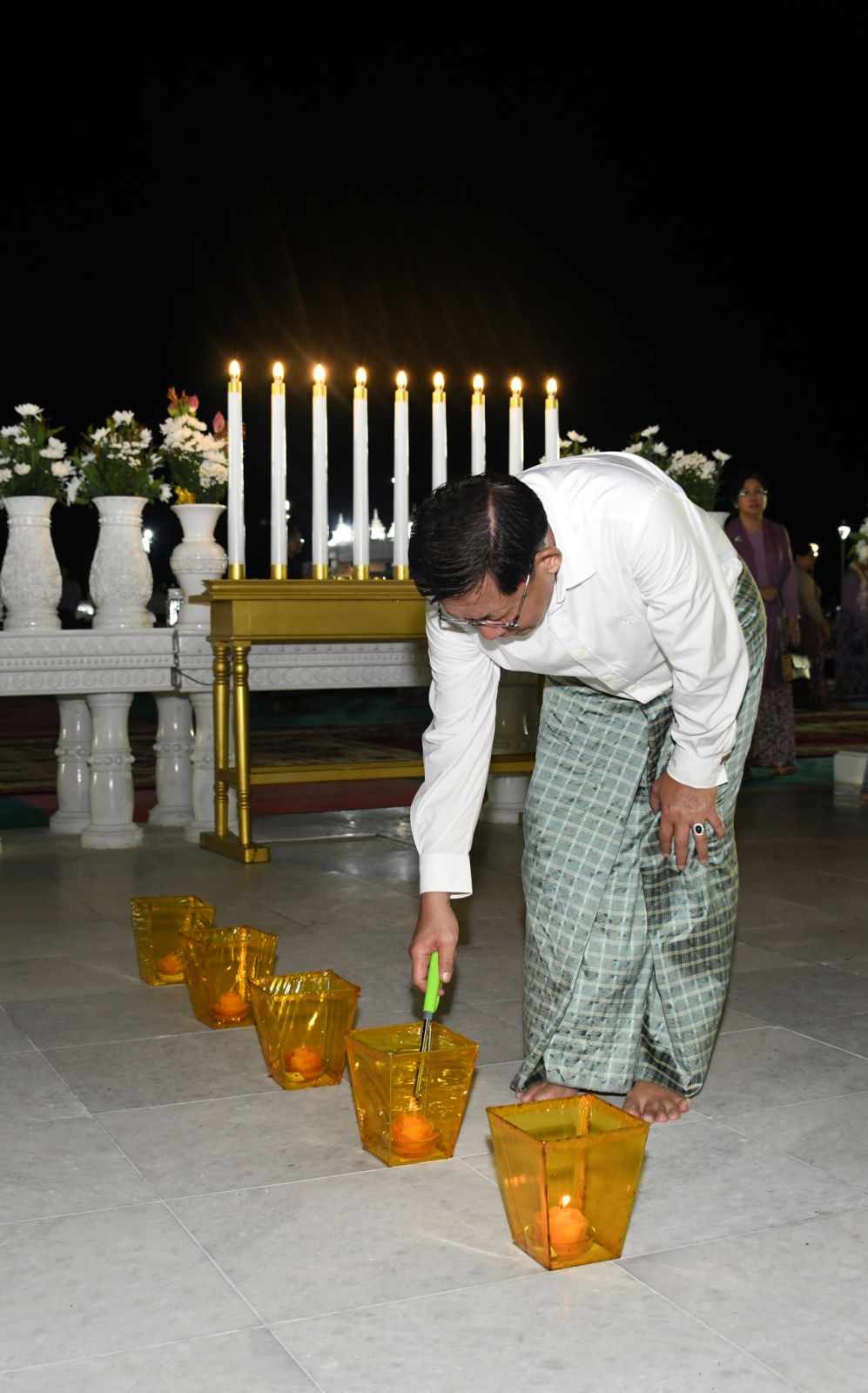 ယင်းနောက် နိုင်ငံတော်ယာယီသမ္မတ နိုင်ငံတော်လုံခြုံရေးနှင့် အေးချမ်းသာယာ ရေးကော်မရှင်ဥက္ကဋ္ဌ နှင့် ဇနီးတို့သည် မာရဝိဇယဗုဒ္ဓရုပ်ပွားတော်မြတ်ကြီးအား ဖူးမြော် ကြည်ညိုကာ ပန်း၊ ရေချမ်းနှင့် ဆီမီးများကပ်လှူပူဇော်ပြီး မာရဝိဇယဗုဒ္ဓရုပ်ပွားတော် မြတ်ကြီး တန်ဆောင်တိုင်မီးထွန်း ပွဲတော်ဖွင့်ပွဲအခမ်းအနားသို့ တက်ရောက်လာကြသူ များနှင့်အတူ ဆီမီးများကို အတူတကွ ထွန်းညှိပူဇော်ကြသည်။