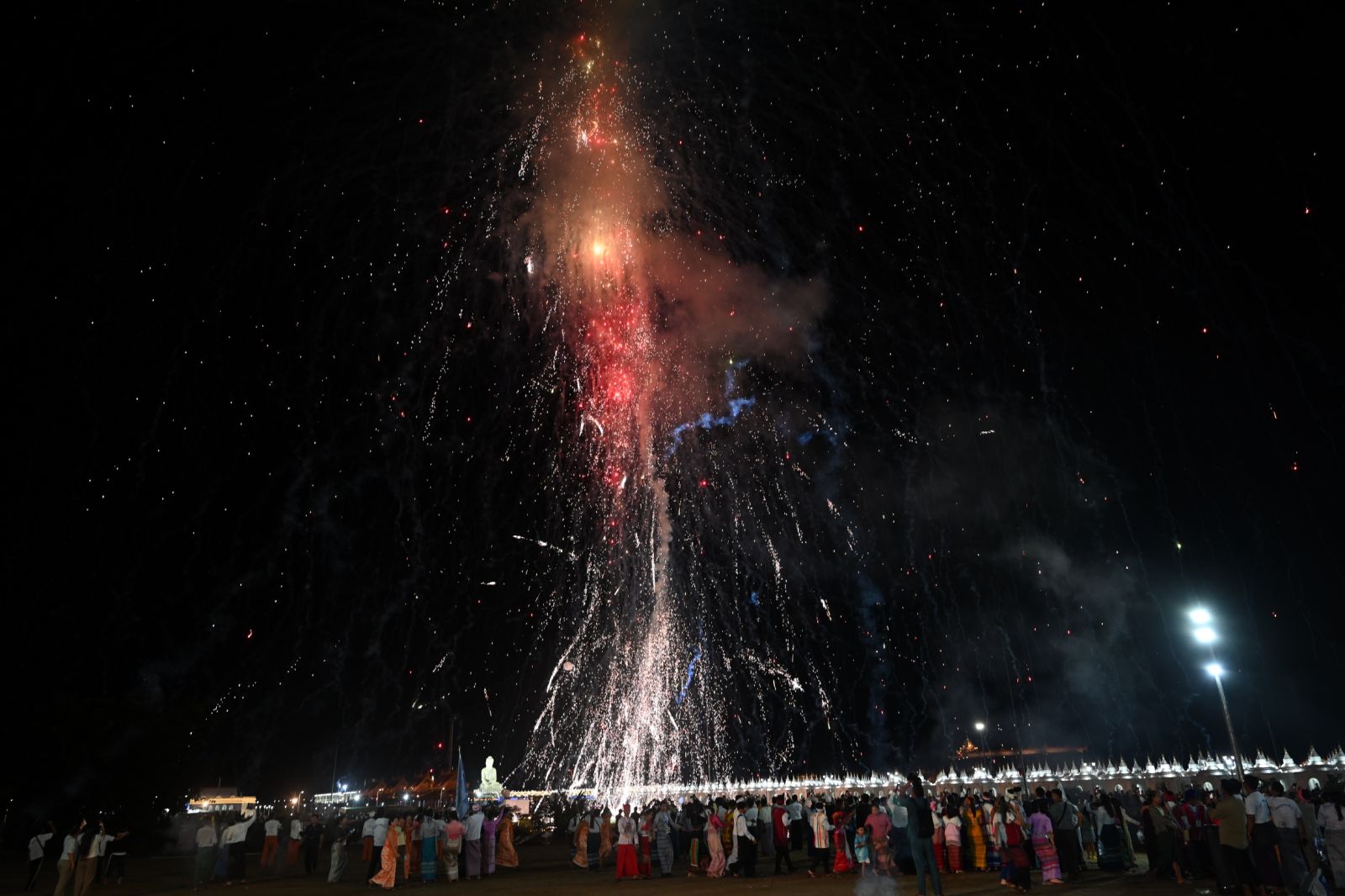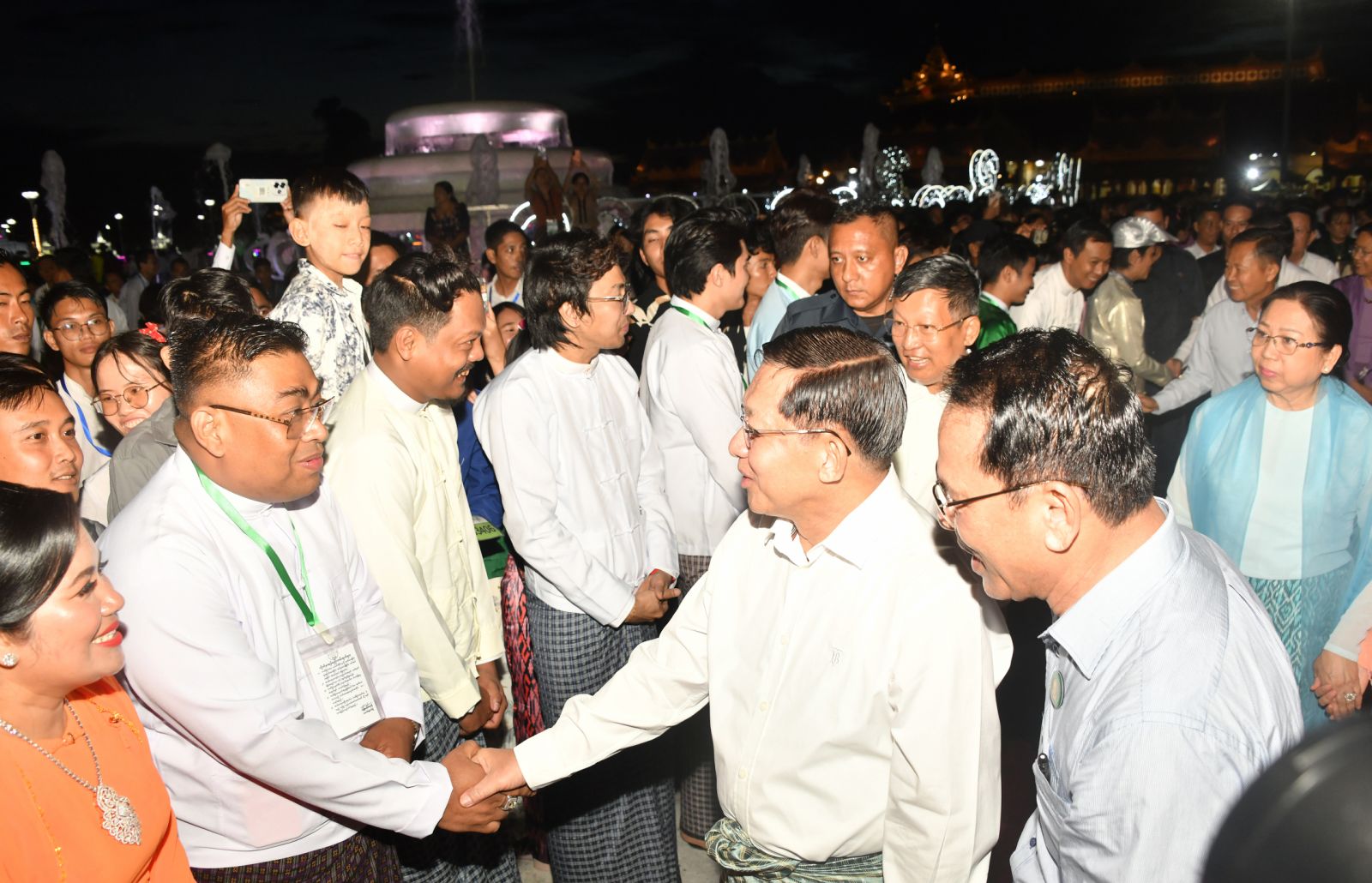 ဆက်လက်၍ နိုင်ငံတော်ယာယီသမ္မတ နိုင်ငံတော်လုံခြုံရေးနှင့် အေးချမ်းသာယာ ရေးကော်မရှင်ဥက္ကဋ္ဌ နှင့် ဇနီး၊ အခမ်းအနားတက်ရောက်လာကြသူများသည် ညမီးကြီး မီးပုံးပျံများနှင့် စိန်နားပန် မီးပုံပျံများအား ပြိုင်ပွဲဝင်အသင်းများအလိုက် အသီးသီး လွှတ်တင် ပူဇော်ယှဉ်ပြိုင်မှုများကို ကြည့်ရှုအားပေးကြပြီး လာရောက်အားပေးကြ သည့် မိဘပြည်သူများအား ရင်းရင်းနှီးနှီးနှုတ်ဆက်သည်။