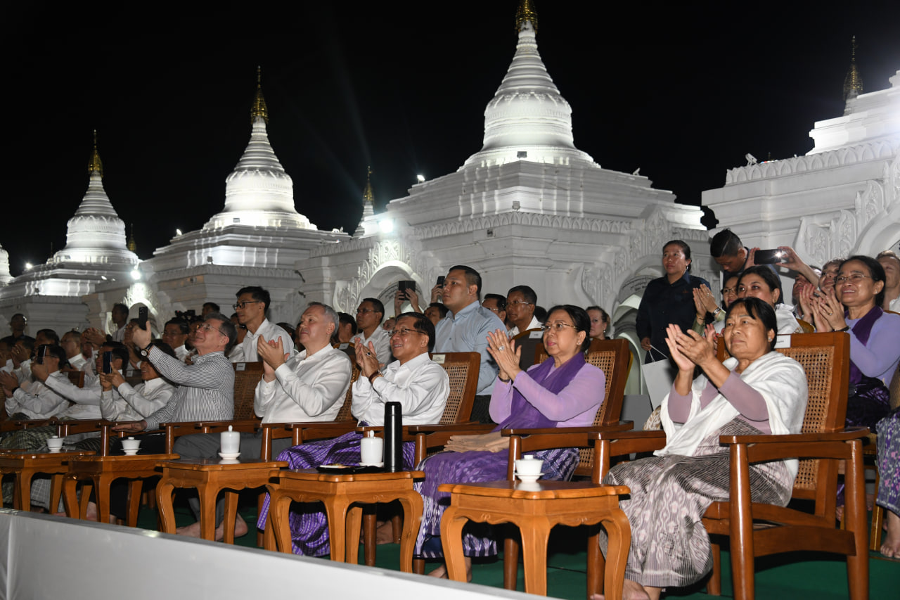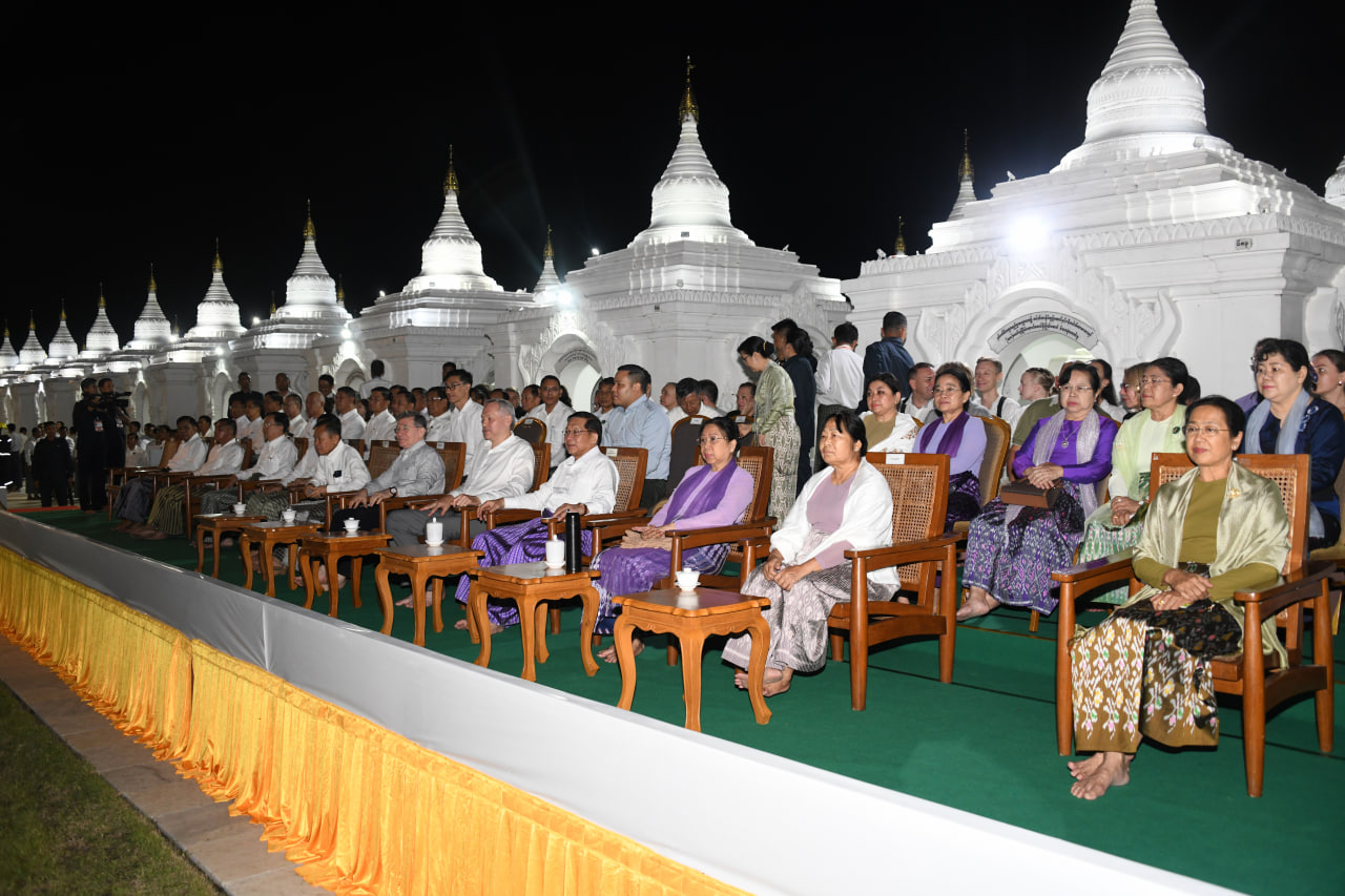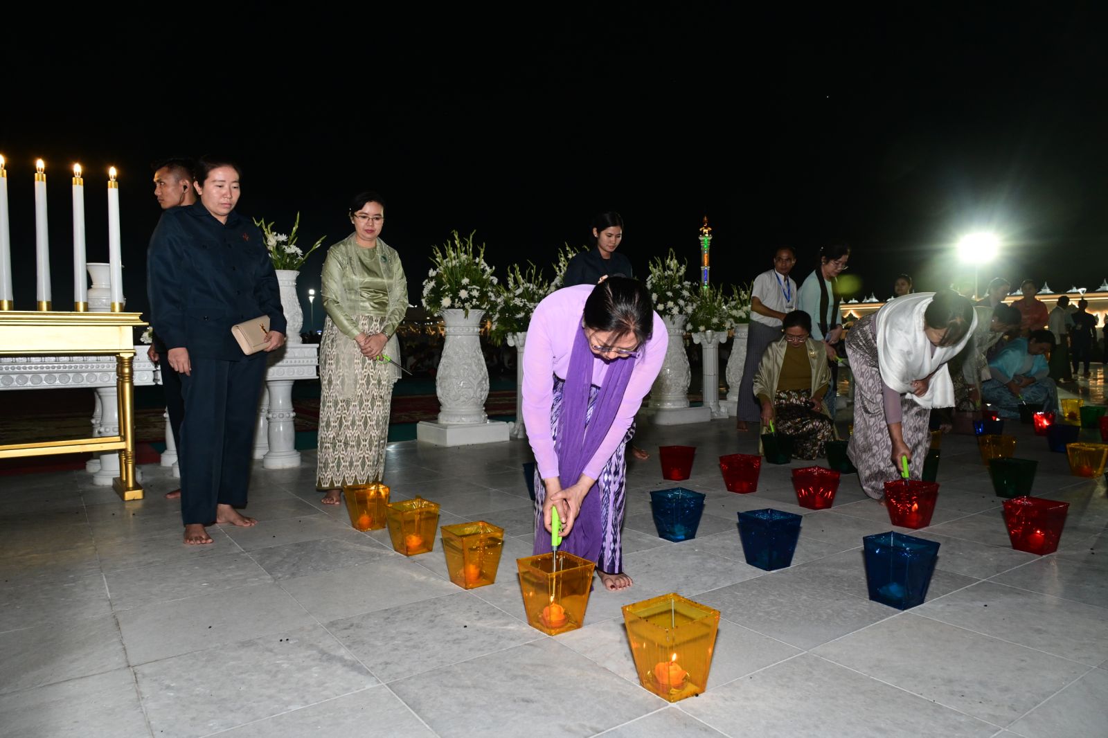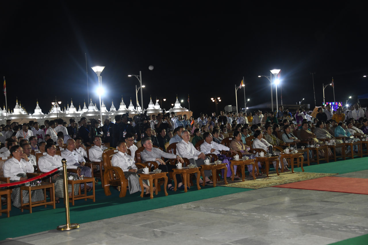 ထို့နောက် နိုင်ငံတော်ယာယီသမ္မတ နိုင်ငံတော်လုံခြုံရေးနှင့် အေးချမ်းသာယာ ရေးကော်မရှင်ဥက္ကဋ္ဌနှင့် ဇနီး၊ အခမ်းအနား တက်ရောက်လာကြသူများသည် စိန်နားပန် မီးပုံးပျံလွှတ်တင်မှုနှင့် ညမီးကြီးမီးပုံပျံများ လွှတ်တင်ပူဇော်ယှဉ်ပြိုင်နေမှုများကို ကြည့် ရှုအားပေးကြသည်။