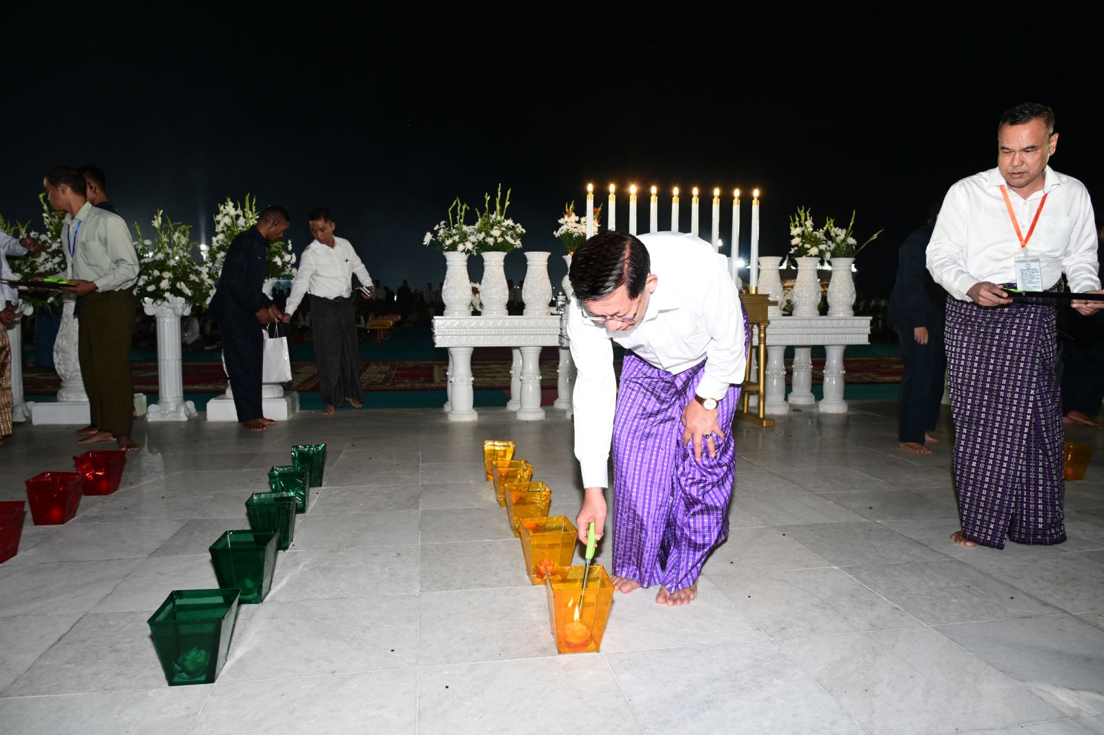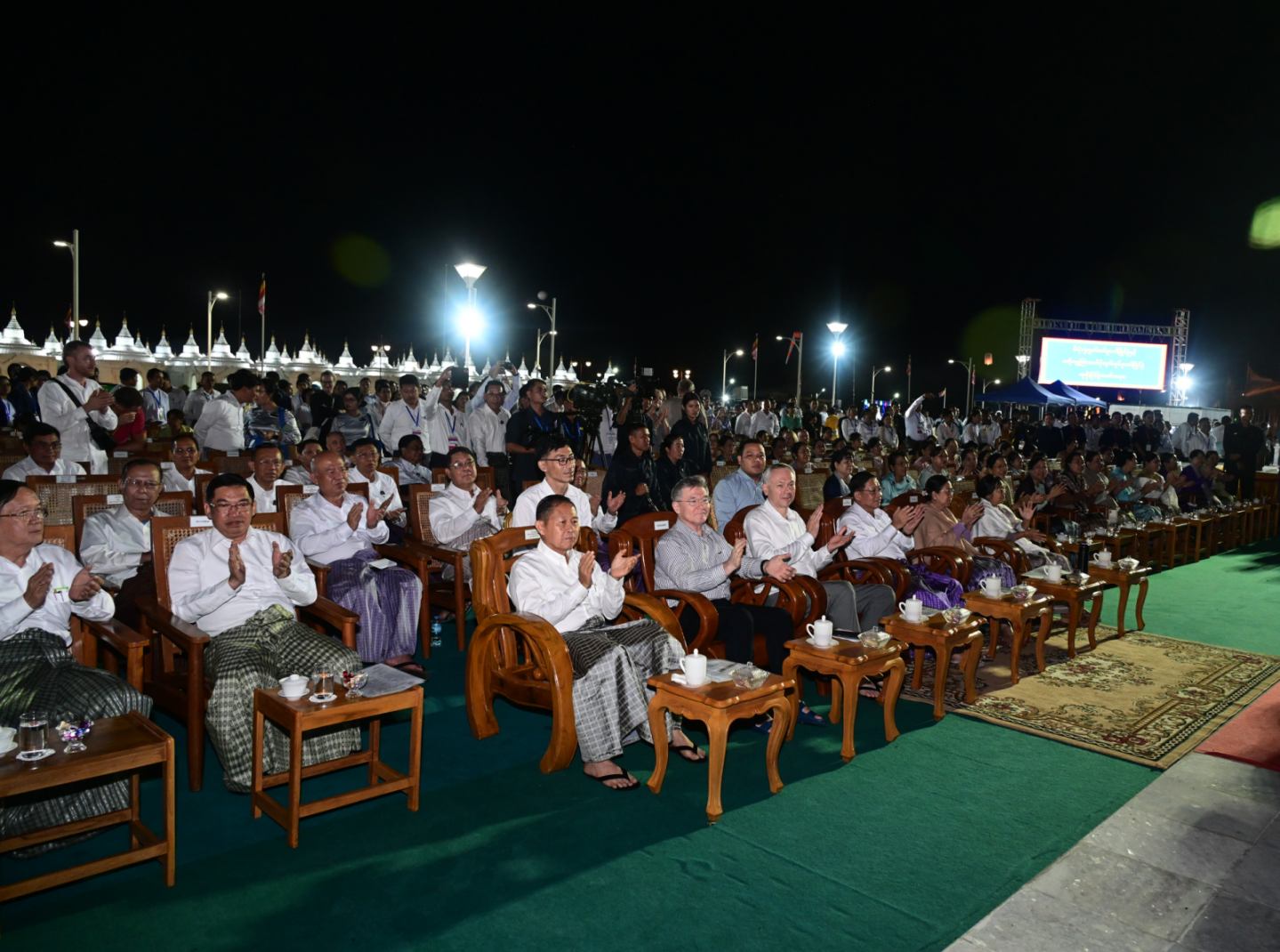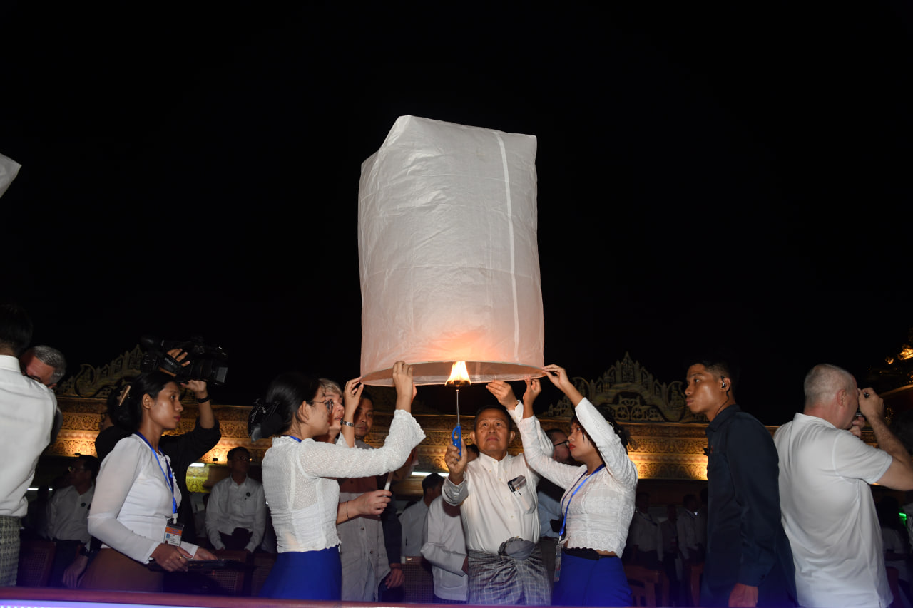 ထို့နောက် နိုင်ငံတော်ယာယီသမ္မတ နိုင်ငံတော်လုံခြုံရေးနှင့် အေးချမ်းသာယာ ရေးကော်မရှင်ဥက္ကဋ္ဌနှင့် ဇနီး၊ အခမ်းအနား တက်ရောက်လာကြသူများသည် စိန်နားပန် မီးပုံးပျံလွှတ်တင်မှုနှင့် ညမီးကြီးမီးပုံပျံများ လွှတ်တင်ပူဇော်ယှဉ်ပြိုင်နေမှုများကို ကြည့် ရှုအားပေးကြသည်။
