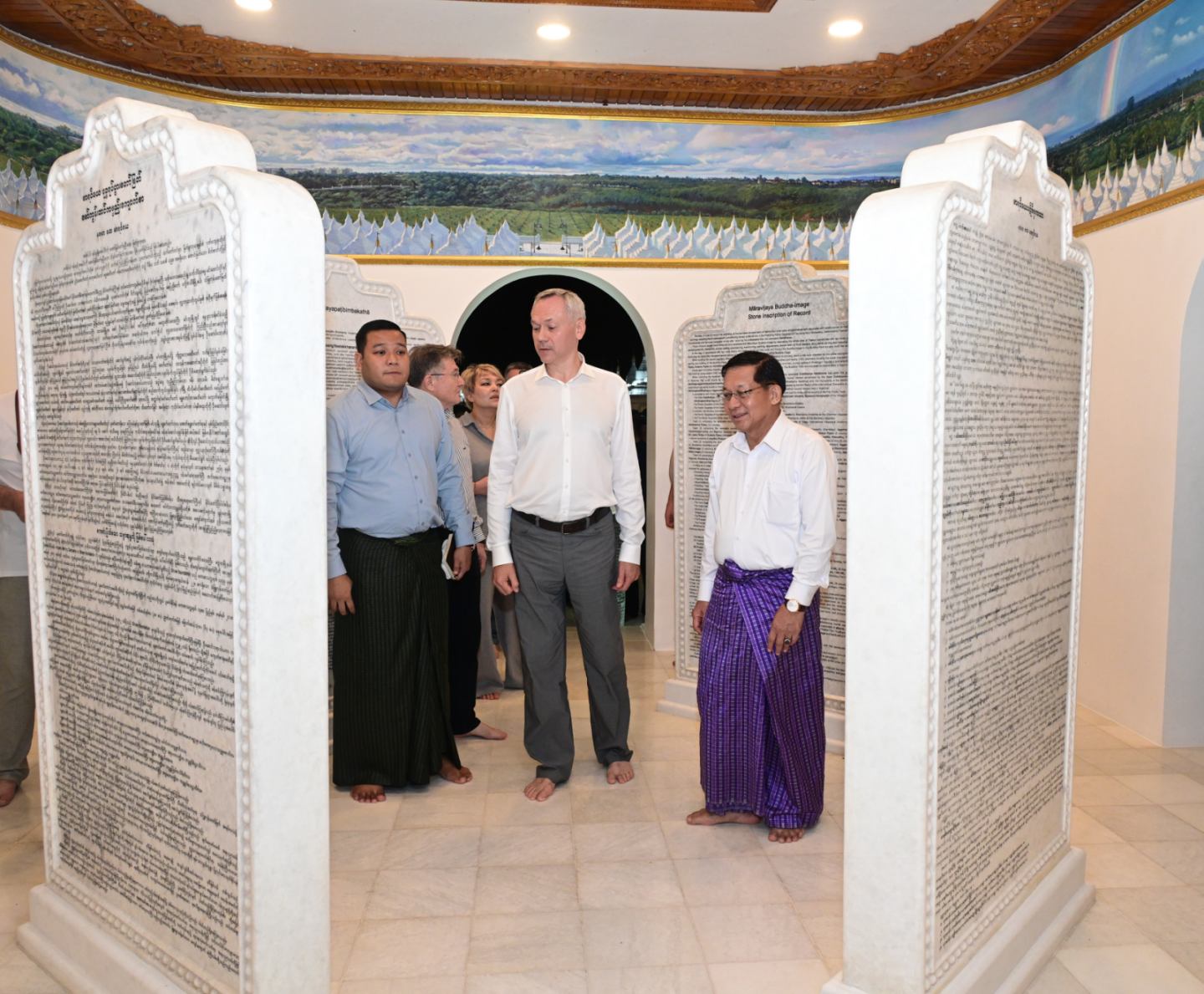 ထို့နောက် နိုင်ငံတော်ယာယီသမ္မတ နိုင်ငံတော်လုံခြုံရေးနှင့် အေးချမ်းသာယာ ရေးကော်မရှင်ဥက္ကဋ္ဌနှင့်ဇနီး၊ ရုရှားဖက်ဒရေးရှင်းနိုင်ငံ၊ နိုဗိုစီဗစ်ဒေသအုပ်ချုပ်ရေးမှူး နှင့် ကိုယ်စားလှယ်အဖွဲ့တို့သည် ကျောက်စာရုံစေတီတော်များအတွင်း လှည့်လည် ကြည့်ရှုလေ့လာကြပြီး နိုင်ငံတော်ယာယီသမ္မတ နိုင်ငံတော်လုံခြုံရေးနှင့် အေးချမ်းသာ ယာ ရေးကော်မရှင်ဥက္ကဋ္ဌက မာရဝိဇယရုပ်ပွားတော်မြတ်ကြီးအား မြန်မာ့ရိုးရာဓလေ့ ထုံးတမ်းစဉ်လာများ၊ ခေတ်မီနည်းပညာများ ပေါင်းစပ်၍ ဗိသုကာလက်ရာမြောက်စွာ တည်ထားကိုးကွယ်ထားရှိမှုများကို ရှင်းလင်းပြောကြားသည်။