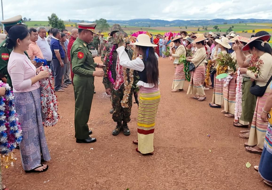 အကြမ်းဖက်သမားများအား နှိမ်နင်း၍ မြို့ရွာဒေသများကို တည်ငြိမ်အေးချမ်း စေရန်၊ အစိုးရအုပ်ချုပ်ရေးယန္တရားများ ပြန်လည်လည်ပတ်စေရန်နှင့် ပြည်သူလူထု၏ လူမှုစီးပွားဘဝတိုးတက်ဖွံ့ဖြိုးစေရန် ဆောင်ရွက်ပေးခဲ့သည့် အောင်ပွဲရရှေ့တန်းပြန် တပ်မတော်သားများအား တိုင်းမှူးနှင့် အဖွဲ့ဝင်များ၊ အရာရှိ၊ စစ်သည်၊ မိသားစုဝင်များ၊ ဌာနဆိုင်ရာ တာဝန်ရှိသူများနှင့် ဒေသခံတိုင်းရင်းသား ပြည်သူများက အောင်သပြေ ခက်များ၊ ဂုဏ်ပြုပန်းကုံးများနှင့် ဂုဏ်ပြုပန်းများဖြင့် ကြိုဆိုဂုဏ်ပြုကြပြီး ဘင်ခရာ အဖွဲ့များ၊ ရှမ်းရိုးရာအကအဖွဲ့များနှင့် အိုးစည် ဒိုးပတ်အဖွဲ့များကလည်း အတီး၊ အမှုတ်၊ အက၊ အလှများဖြင့် ဝမ်းမြောက်စွာ သောင်းသောင်းဖျဖျကြိုဆိုဂုဏ်ပြုခဲ့ကြကြောင်း သတင်းရရှိသည်။