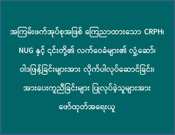 အကြမ်းဖက်အုပ်စုအဖြစ်ကြေညာထားသည့် CRPH၊ NUG နှင့် ယင်းတို့၏ လက်ဝေခံ အဖွဲ့အစည်းများ၊ ယင်းတို့နှင့် ဆက်နွှယ်နေသော အဖွဲ့အစည်းများ၊ လူပုဂ္ဂိုလ်များသည် နိုင်ငံတော် တည်ငြိမ်အေးချမ်းရေးကို ပျက်ပြားစေရန်နှင့် အစိုးရယန္တရားများ ပျက်ပြားစေရန် ရည်ရွယ်လျက် လှုံ့ဆော်ခြင်း၊ ဝါဒဖြန့်ခြင်းများပြုလုပ်ခဲ့မှုအပေါ် ဥပဒေနှင့်အညီ ထိရောက်စွာ အရေးယူသွားမည် ဖြစ်ကြောင်းနှင့် ထိုသို့ လှုံ့ဆော်သူ၊ ဝါဒဖြန့်သူများအား ဆက်လက်ဖော်ထုတ်အရေးယူသွားမည်ဖြစ် ကြောင်း မိဘပြည်သူများ သိရှိနိုင်ရေး အသိပေးသတင်းထုတ်ပြန်ပြီးဖြစ်သည်။