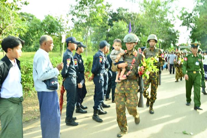 အကြမ်းဖက်သမားများအား အပြီးတိုင် တိုက်ထုတ်နိုင်ခဲ့ပြီး မြို့ရွာဒေသများကို တည်ငြိမ်အေးချမ်းစေရန်၊ အစိုးရအုပ်ချုပ်ရေးယန္တရားများ ပုံမှန်အတိုင်း ပြန်လည် လည်ပတ်စေရန်နှင့် ပြည်သူလူထု၏ လူမှုစီးပွားဘဝတိုးတက်ဖွံ့ဖြိုးစေရန် ၊ နိုင်ငံတော် လုံခြုံရေးနှင့် တည်ငြိမ်အေးချမ်းရေး တာဝန်များကို အချိန်ကာလကြာမြင့်စွာ တာဝန် ထမ်းဆောင်၍ ရဲဝံ့စွန့်စားစွာ တိုက်ပွဲဝင်ခဲ့ကြသော အောင်ပွဲရရှေ့တန်းပြန် တပ်မတော် သားများအား တိုင်းမှူးနှင့် အဖွဲ့ဝင်များ၊ အရာရှိ၊ စစ်သည်၊ မိသားစုဝင်များ၊ ဌာနဆိုင်ရာ တာဝန်ရှိသူများနှင့် ဒေသခံတိုင်းရင်းသား ပြည်သူများက အောင်သပြေခက်များ၊ ဂုဏ်ပြုပန်းကုံးများ၊ ဂုဏ်ပြုပန်းများဖြင့် ကြိုဆိုဂုဏ်ပြုကြပြီး ရိုးရာအကအဖွဲ့များနှင့် အိုးစည် ဒိုးပတ်အဖွဲ့များကလည်း အတီး၊ အမှုတ်၊ အက၊ အလှများဖြင့် ဝမ်းမြောက်စွာ သောင်းသောင်းဖျဖျကြိုဆိုဂုဏ်ပြုခဲ့ကြကြောင်း သတင်းရရှိသည်။