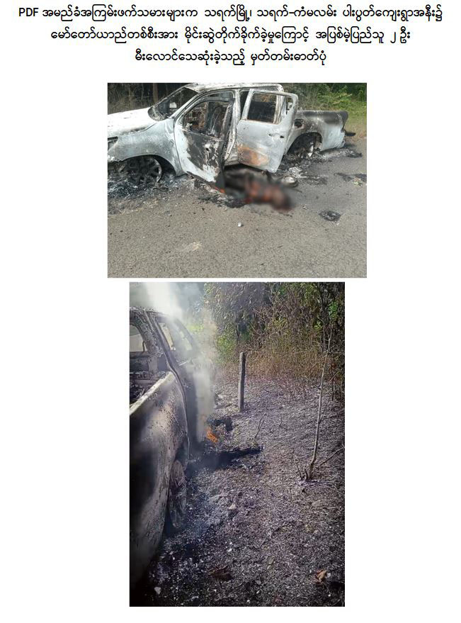 အကြမ်းဖက်သမားများအနေဖြင့် နိုင်ငံတော်တည်ငြိမ်ရေးနှင့် တရားဉပဒေ စိုးမိုးရေးလုပ်ငန်းများကို အနှောင့်အယှက်ဖြစ်စေရန်၊ အရပ်သားပြည်သူများအား ကြောက်ရွံ့ထိတ်လန့်မှုများ ဖြစ်ပေါ်စေရန်အတွက် အကြမ်းဖက်မှုလုပ်ရပ်များကို နည်းလမ်းပေါင်းစုံဖြင့် လုပ်ဆောင်လျက်ရှိကြရာ နိုဝင်ဘာ ၆ ရက် နံနက်ပိုင်းတွင် မကွေးတိုင်းဒေသကြီး၊ သရက်မြို့ရှိ သရက်-ကံမကားလမ်းအတိုင်း အရပ်သားပြည်သူ များ မောင်းနှင်လာသည့် မော်တော်ယာဉ်အား PDF အမည်ခံ အကြမ်းဖက်သမားများက မိုင်းဆွဲတိုက်ခိုက်ခဲ့သဖြင့် မော်တော်ယာဉ်ပေါ်ရှိ အပြစ်မဲ့ပြည်သူ အမျိုးသား ၂ ဦး မီးလောင်သေဆုံးခဲ့ကြောင်း သိရှိရသည်။