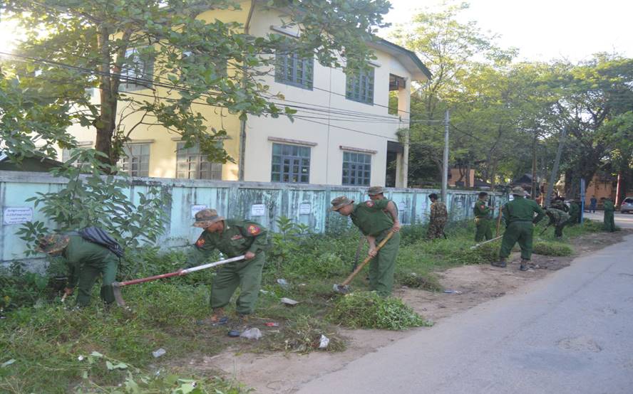 ထိုသို့ ဆောင်ရွက်ပေးလျက်ရှိရာ ယနေ့တွင် ရှမ်းပြည်နယ်(မြောက်ပိုင်း) လားရှိုးမြို့နယ်၊ ရန်ကုန်တိုင်းဒေသကြီး၊ စမ်းချောင်း မြို့နယ်အပါအဝင် မြို့နယ် ၁၆ မြို့နယ်နှင့် ပဲခူးတိုင်းဒေသကြီး၊ တောင်ငူမြို့နယ်တို့၌ နယ်မြေခံတပ်မတော်သားများ၊ မြန်မာနိုင်ငံရဲတပ်ဖွဲ့ဝင်များ၊ မီးသတ်တပ်ဖွဲ့ဝင်များ၊ စစ်မှုထမ်းဟောင်းအဖွဲ့ဝင်များ၊ ဌာနဆိုင်ရာဝန်ထမ်းများ၊ လူမှုရေးအသင်းအဖွဲ့များနှင့် ဒေသခံပြည်သူများက အခြေခံ ပညာကျောင်းများအတွင်း/အပြင်ရှိ ချုံနွယ်ပေါင်းမြက်များ ခုတ်ထွင်ရှင်းလင်းခြင်း၊ အမှိုက်များ ရှင်းလင်းခြင်း၊ ရေစီးရေလာကောင်းမွန်စေရေး ရေနုတ်မြောင်းများ တူးဖော် ပေးခြင်း၊ ရေကန်များတွင် အဘိတ်ဆေးများခတ်ပေးခြင်း၊ ခြင်ခိုအောင်းနိုင်သည့် နေရာများအား ခြင်ဆေးဖျန်းခြင်းနှင့် ကျန်းမာရေးအသိပညာပေး လက်ကမ်းစာစောင် များ ဖြန့်ဝေပေးခြင်းများကို စုပေါင်းဆောင်ရွက်ကြသည်။