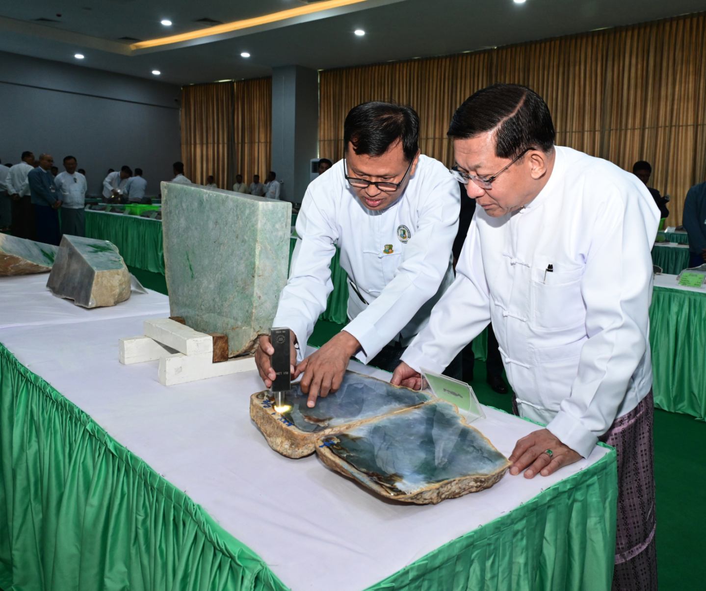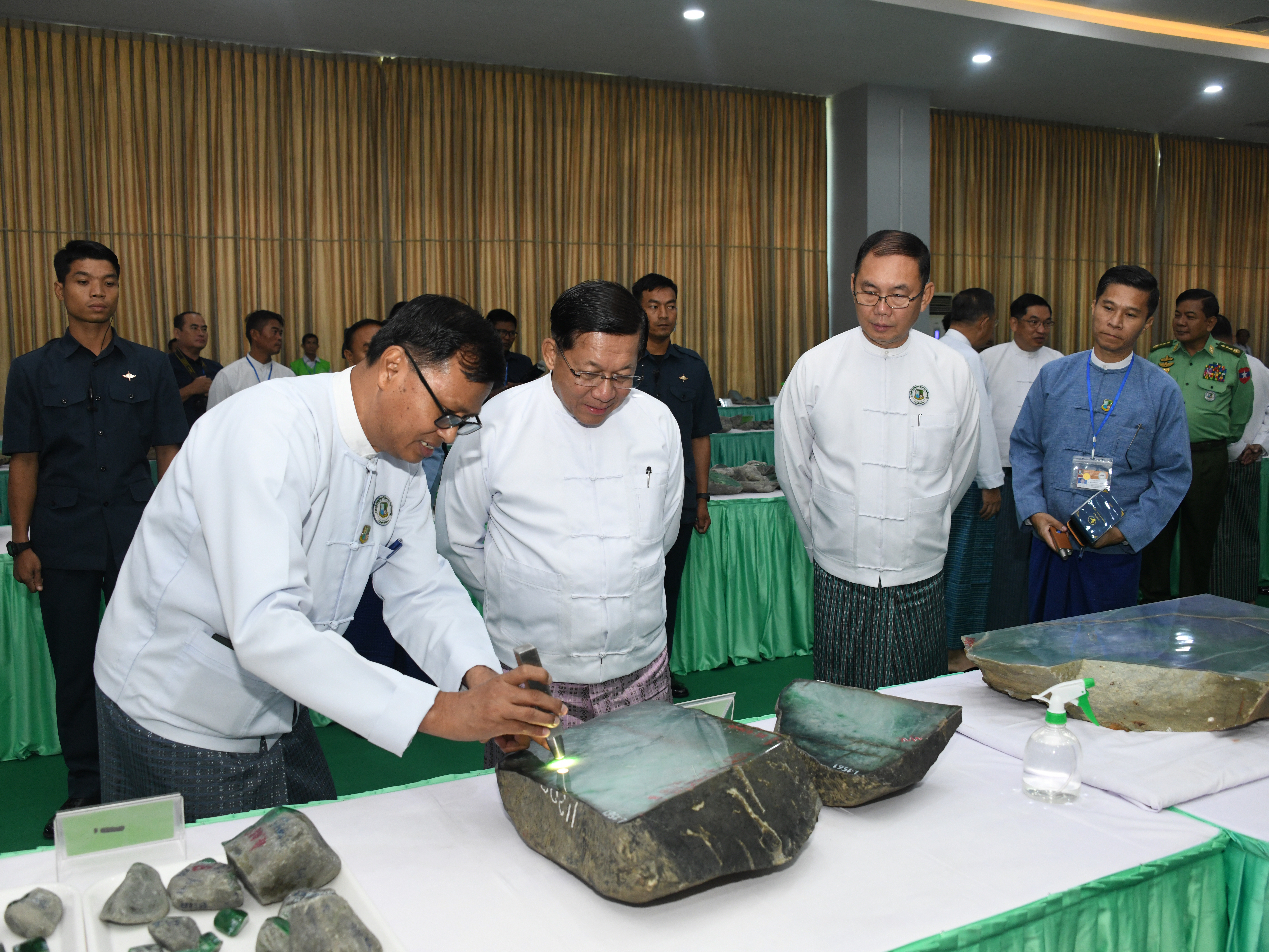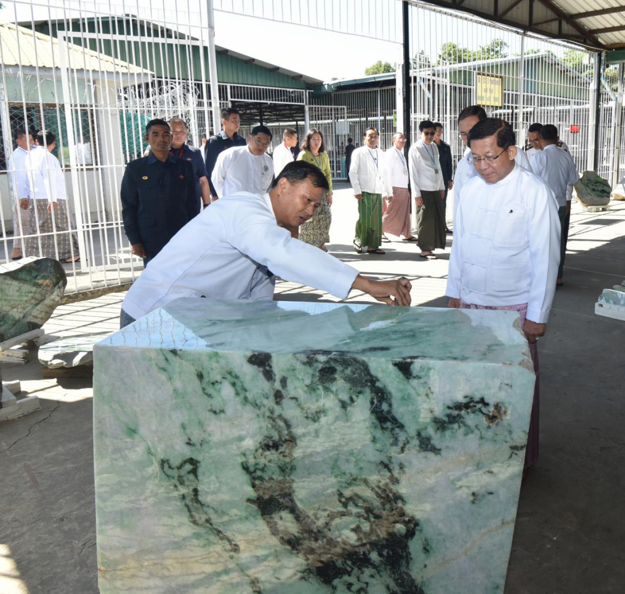 ထို့နောက် နိုင်ငံတော်ယာယီသမ္မတ နိုင်ငံတော်လုံခြုံရေးနှင့်အေးချမ်းသာယာရေး ကော်မရှင်ဥက္ကဋ္ဌ နှင့်အဖွဲ့ဝင်များသည် ပုဂ္ဂလိက ကျောက်မျက်ရတနာ အချောထည် အရောင်းပြခန်းများ ဖွင့်လှစ်ရောင်းချနေမှုကို လိုက်လံကြည့်ရှုအားပေးပြီး ခန်းမအပြင် ဘက်တွင် ခင်းကျင်းပြသထားသည့် ကျောက်စိမ်းရိုင်းအတွဲများကို လိုက်လံကြည့်ရှု စစ်ဆေးသည်။