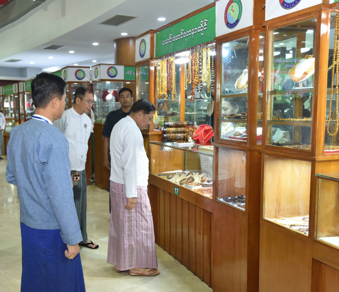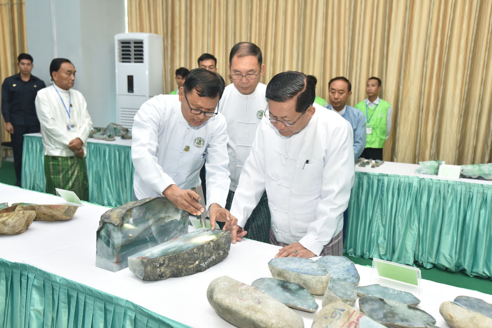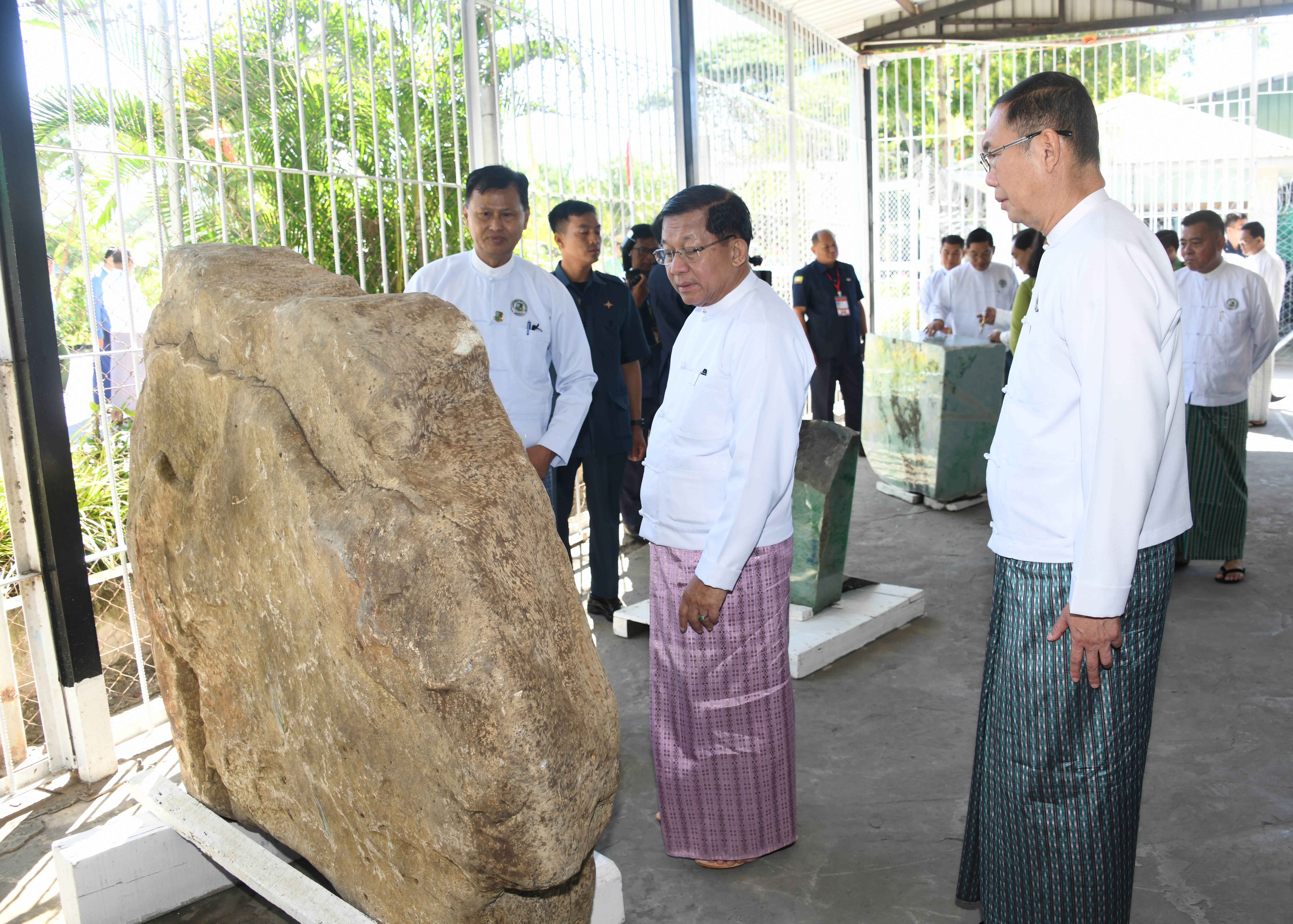 ထို့နောက် နိုင်ငံတော်ယာယီသမ္မတ နိုင်ငံတော်လုံခြုံရေးနှင့်အေးချမ်းသာယာရေး ကော်မရှင်ဥက္ကဋ္ဌ နှင့်အဖွဲ့ဝင်များသည် ပုဂ္ဂလိက ကျောက်မျက်ရတနာ အချောထည် အရောင်းပြခန်းများ ဖွင့်လှစ်ရောင်းချနေမှုကို လိုက်လံကြည့်ရှုအားပေးပြီး ခန်းမအပြင် ဘက်တွင် ခင်းကျင်းပြသထားသည့် ကျောက်စိမ်းရိုင်းအတွဲများကို လိုက်လံကြည့်ရှု စစ်ဆေးသည်။