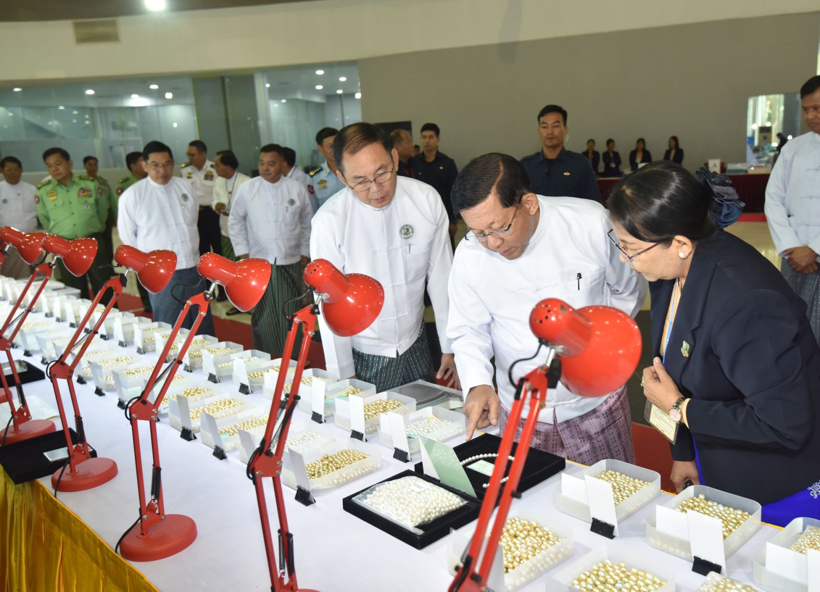 ယင်းနောက် နိုင်ငံတော်ယာယီသမ္မတ နိုင်ငံတော်လုံခြုံရေးနှင့်အေးချမ်းသာယာရေး ကော်မရှင်ဥက္ကဋ္ဌနှင့် အခမ်းအနားတက်ရောက်လာကြသူများသည် (၆၀)ကြိမ်မြောက် မြန်မာ့ကျောက်မျက်ရတနာပြပွဲ၌ ရောင်းချရန် မဏိရတနာ ကျောက်စိမ်းခန်းမအတွင်း ပြသထားသော ကျောက်စိမ်း၊ ကျောက်မျက်အတွဲများနှင့် ပုလဲအတွဲများကို လိုက်လံ ကြည့်ရှုစစ်ဆေးပြီး တာဝန်ရှိသူများ၏ ရှင်းလင်းတင်ပြမှုအပေါ် နိုင်ငံတော်ယာယီ သမ္မတ နိုင်ငံတော်လုံခြုံရေးနှင့်အေးချမ်းသာယာရေးကော်မရှင်ဥက္ကဋ္ဌ က လိုအပ်သည် များ လမ်းညွှန်မှာကြားသည်။