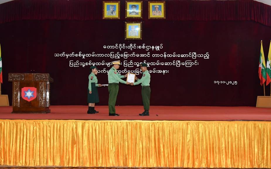 ဦးစွာ တိုင်းမှူးက ဂုဏ်ပြုအမှာစကားပြောကြားသည်။ ထို့နောက် တိုင်းမှူး နှင့် တာဝန်ရှိသူများက သတ်မှတ်စစ်မှုထမ်းကာလ ပြည့်မြောက်အောင် တာဝန် ထမ်းဆောင်ပြီးသည့် ပြည်သူ့စစ်မှုထမ်းများအား ပြည်သူ့စစ်မှုထမ်းဆောင်ပြီးကြောင်း လက်မှတ်များ ပေးအပ်ချီးမြှင့်ကြသည်။