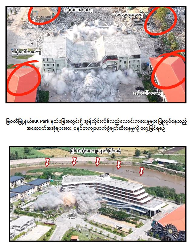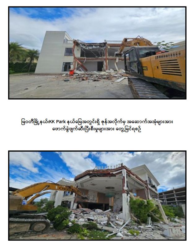 နိုင်ငံတော်အစိုးရအနေဖြင့် မြန်မာ-ထိုင်း-တရုတ် သုံးပွင့်ဆိုင် ပူးပေါင်းဆောင်ရွက်မှု ပုံစံ (Trilateral Cooperation)ဖြင့် ပူးပေါင်းနှိမ်နင်းလျက်ရှိပြီး KNLA ၊ KNU လက်နက် ကိုင် အကြမ်းဖက်အဖွဲ့အစည်းများနှင့် NUG လက်အောက်ခံ PDF အကြမ်းဖက်အဖွဲ့ ဝင်များ ခေတ္တစိုးမိုးထိန်းချုပ်ထားသည့် မြဝတီ-မဲ့ထော်သလေး (KK Park)နယ်မြေအတွင်း သို့ ပြီးခဲ့သည့်အောက်တိုဘာလအတွင်း၌ လုံခြုံရေးတပ်ဖွဲ့ဝင်များဖြင့် အကြမ်းဖက်သောင်း ကျန်းသူနှိမ်နင်းမှုစစ်ဆင်ရေးဖြင့် ဝင်ရောက်ရှင်းလင်းခြင်းများဆောင်ရွက်ခဲ့ကာ နယ်မြေ စိုးမိုးရေးလုပ်ငန်းများကို ဆောင်ရွက်နိုင်ခဲ့ပြီဖြစ်သည်။ ထိုသို့ဆောင်ရွက်ခဲ့ရာတွင် Online လိမ်လည်လောင်းကစားမှုများ ယင်းဒေသတွင် လုံးဝပြန်လည်အခြေမချနိုင်စေရေး၊ ဒုစရိုက် လုပ်ငန်းများ ထပ်မံ မလုပ်ဆောင်နိုင်စေရေးအတွက် ယင်းဒေသတွင် တရားမဝင် ဆောက်လုပ်ထားသည့် အဆောက်အအုံများအား ဇုန်အလိုက်အပြီးတိုင် ဖျက်ဆီးဖြိုချမှုများ ဆောင်ရွက်လျက်ရှိသည်။ ဇုန် ၃ ခုတွင် စုစုပေါင်းအဆောက်အုံ ၆၃၅ လုံးရှိပြီးရှိ နိုဝင်ဘာလ ၁၇ ရက်နေ့အထိ အဆောက်အအုံ ၁၄၈ လုံးကို ၁၀၀ ရာခိုင်နှုန်း ဖြိုချ ဖျက်ဆီးခဲ့ပြီးဖြစ်သည်။ ကျန်ရှိနေသေးသည့် အဆောက်အအုံ ၄၈၇ လုံးကိုလည်း ဆက်လက် ဖြိုချရှင်းလင်းခြင်းများ ဆောင်ရွက်သွားမည်ဖြစ်ပြီး ဖြိုချဖျက်ဆီးခြင်းများ ဆောင်ရွက်ရာ တွင် ယာဉ်ယန္တရားများဖြင့် စနစ်တကျ ဖြိုချဖျက်ဆီးခြင်း၊ အဆင့်မြင့်နည်းပညာသုံး မိုင်း ဖောက်ခွဲဖျက်ဆီးခြင်းနည်းပညာအသုံးပြု၍ စနစ်တကျ ဖောက်ခွဲဖျက်ဆီးခြင်းတို့ဖြင့် ဆောင်ရွက်လျက်ရှိသည်။ ထိုသို့ ဆောင်ရွက်ခဲ့ရာတွင် တစ်ဖက်နိုင်ငံနှင့် နီးကပ်နေသည့် နေရာဖြစ်သဖြင့် အဆောက်အဦအပျက်အစီးအပိုင်းအစများ တစ်ဖက်နိုင်ငံအတွင်းသို့ ကျရောက်မှုမရှိစေရေး စနစ်တကျဆောင်ရွက်ခဲ့ကြောင်း Video မှတ်တမ်းများအရ တွေ့ရှိ နိုင်သည်။ တစ်ဖက်နိုင်ငံက ကန့်ကွက်ခဲ့သည့်အတွက်လည်း ဖောက်ခွဲဖျက်ဆီးမှု Video မှတ်တမ်းဖိုင်များကို ၎င်းနိုင်ငံသို့ တရားဝင်မှတ်တမ်းပေးပို့ခဲ့ပြီး ဖြစ်သည်။