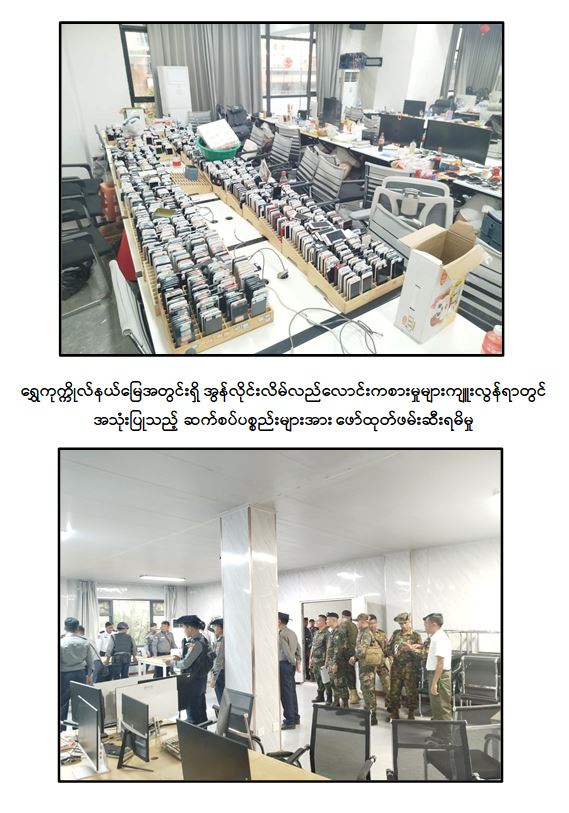မြန်မာနိုင်ငံအစိုးအနေဖြင့် နိုင်ငံတကာနှင့် တစ်ကမ္ဘာလုံးကိုအန္တရာယ်ပေးနေသည့် online လိမ်လည်မှုများ၊ online လောင်းကစားမှုများတိုက်ဖျက်ရေးလုပ်ငန်းစဉ်များကို အမျိုးသားရေးတာဝန်တစ်ရပ်အနေဖြင့် အလေးထား တိုက်ဖျက်ဆောင်ရွက်လျက်ရှိပြီး လုံခြုံရေးတပ်ဖွဲ့ဝင်များ၊ အုပ်ချုပ်ရေးအဖွဲ့အစည်းများ၏ အသက်၊ သွေး၊ ချွေးများ၊ ယာဉ် ယန္တရားများ၊ ငွေကြေးများစွာ ကုန်ကျခံရင်းနှီးပေးဆပ်၍ ပူးပေါင်းပါဝင်တိုက်ဖျက်လျက်ရှိ သည်။